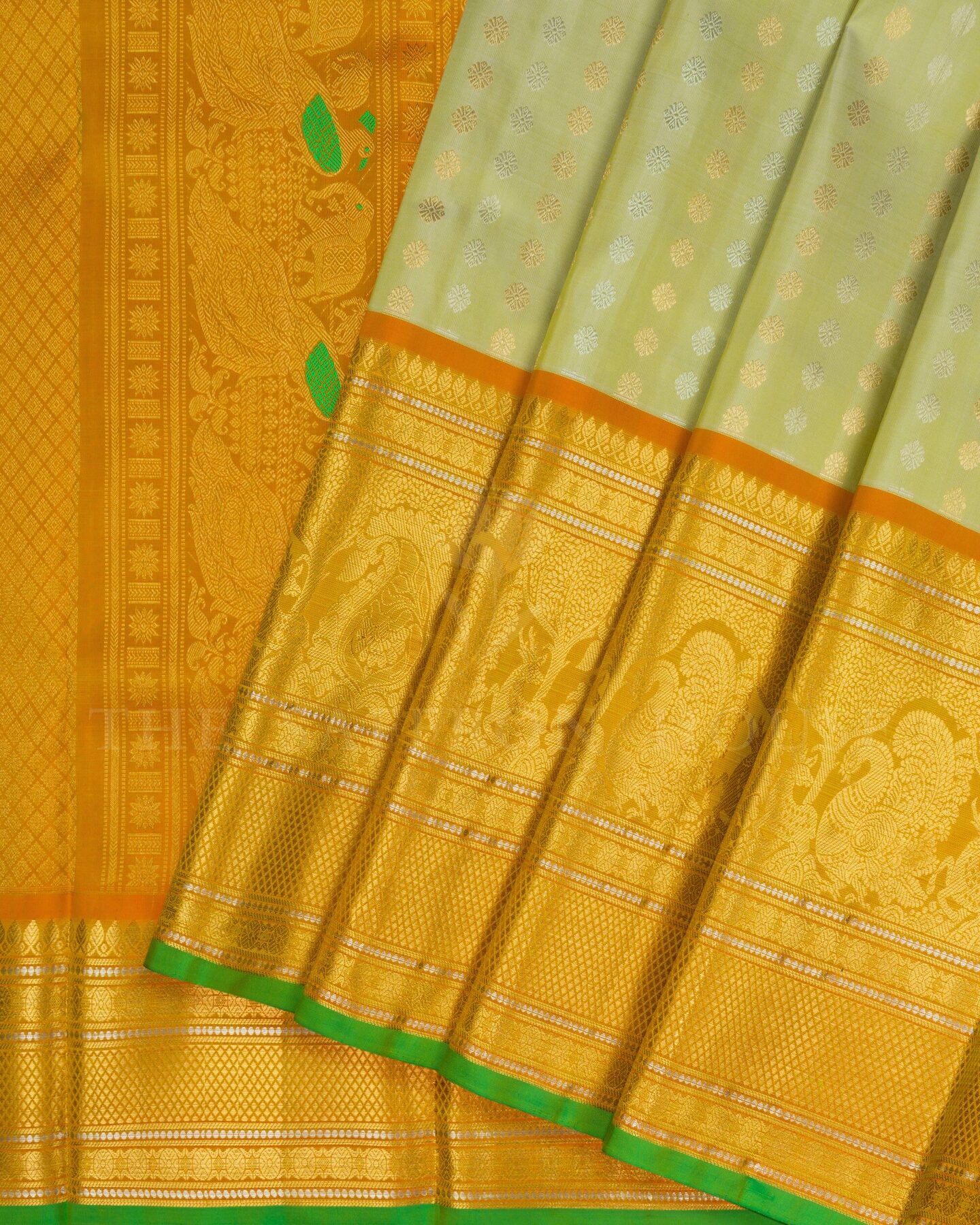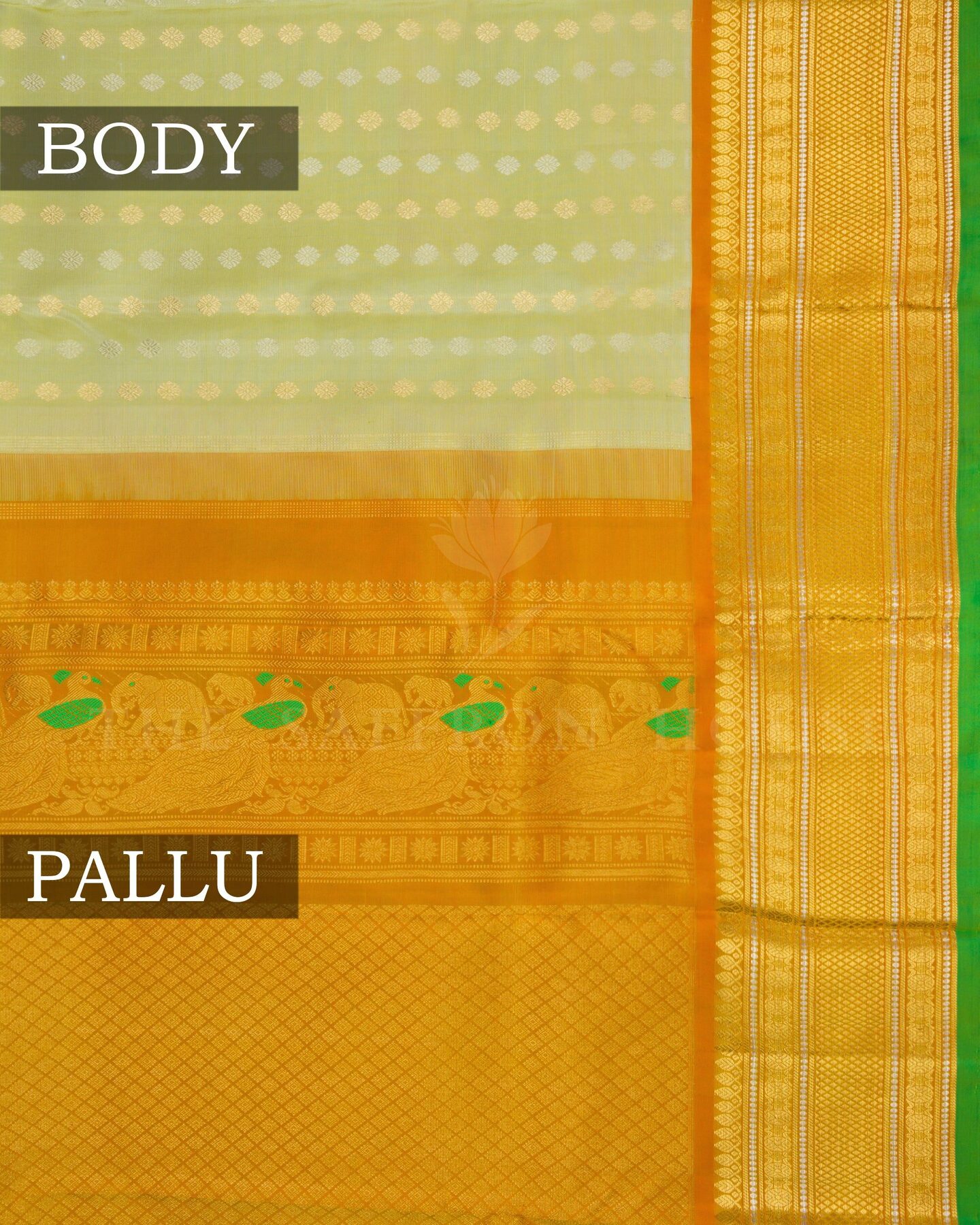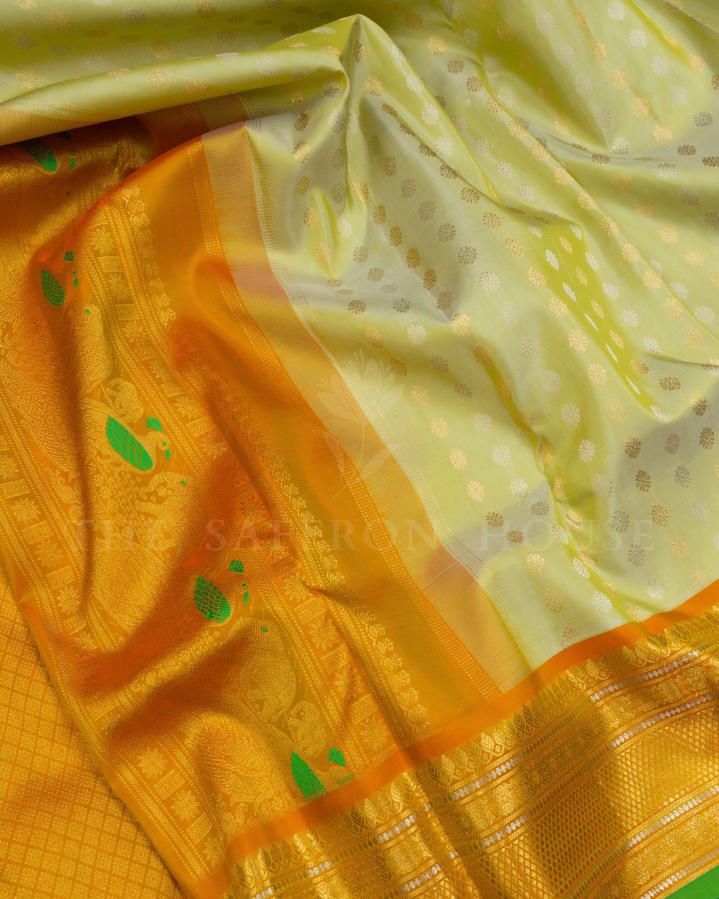There is something about the interplay of yellow and green that feels both ancient and alive. This Brocade Kanjivaram silk saree opens with warm as turmeric and morning sunshine, its surface shimmering with the unhurried rhythm of the loom.