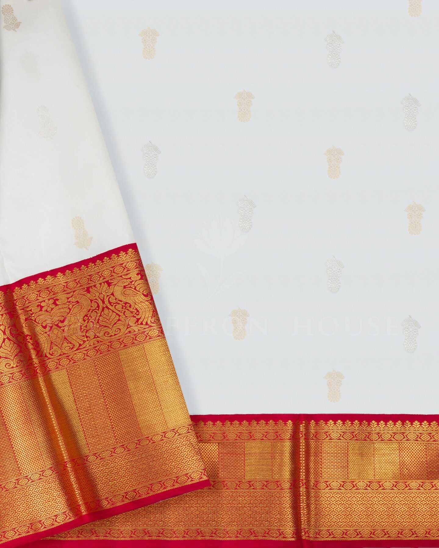 The body is adorned with jangla with kadwa motifs, each thread placed with precision and purpose. The maroonish red border frames the drape with confident definition, while silver and gold zari runs through the weave, catching light the way temple gold does — slowly, deeply, unforgettably.