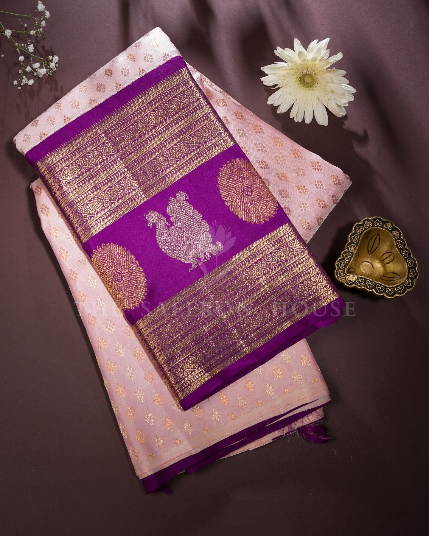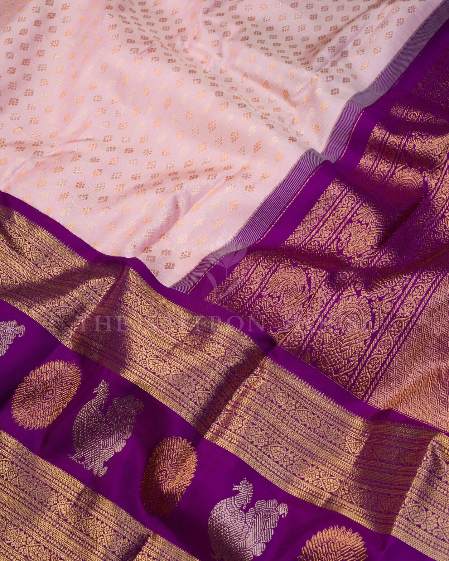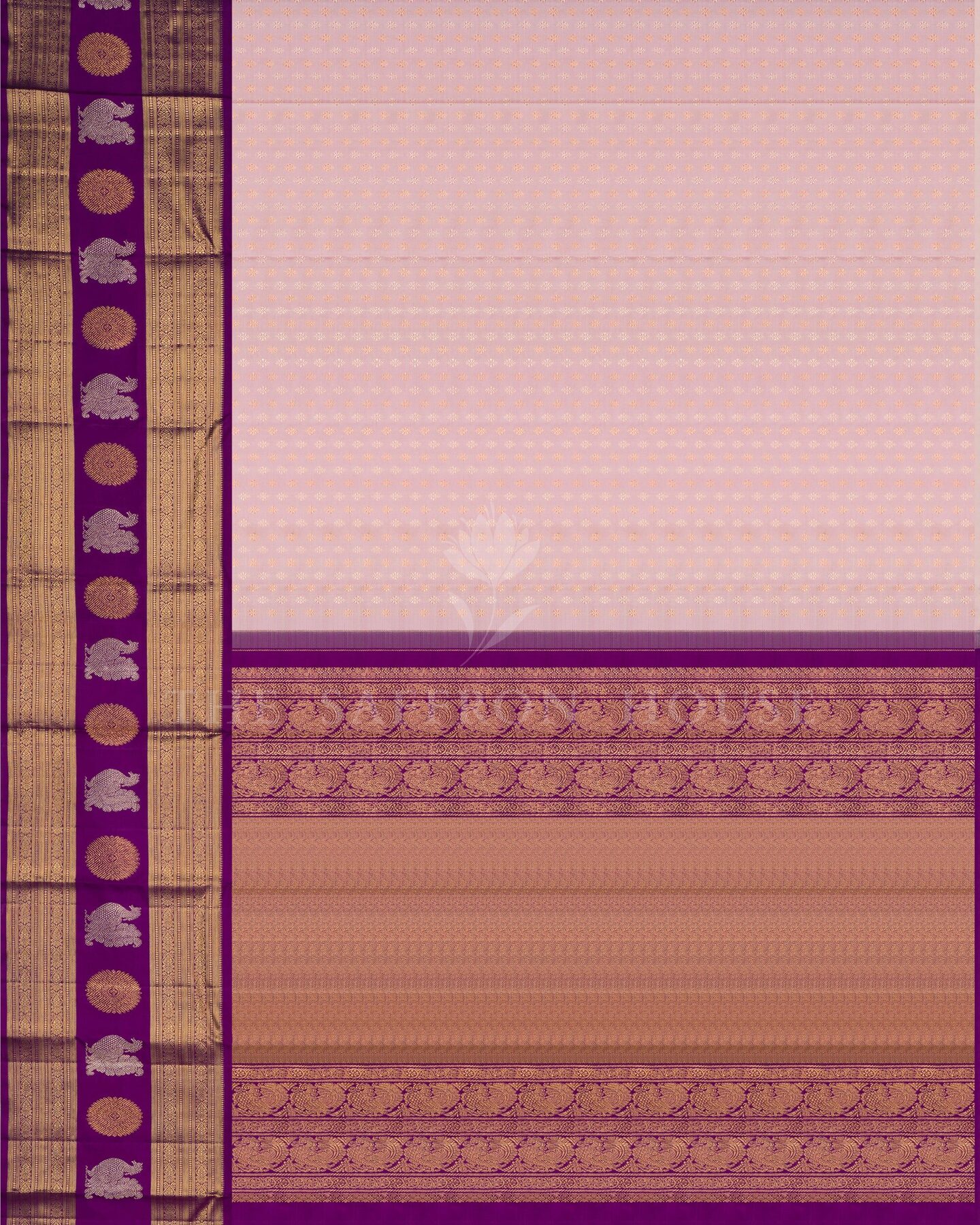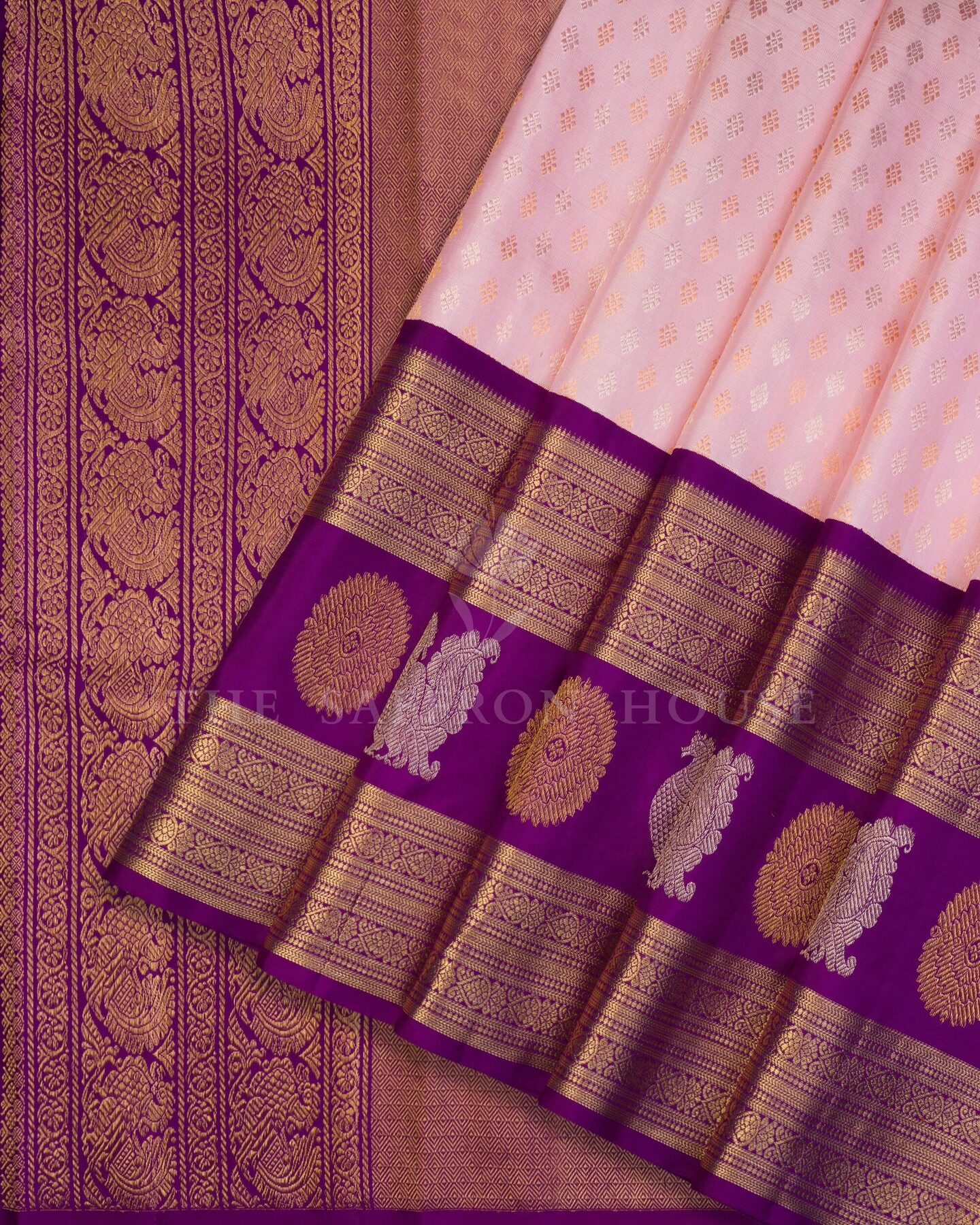 There is something about the interplay of pink and violet that feels both ancient and alive. This Korvai Kanjivaram silk saree opens with soft and luminous as rose petals, its surface shimmering with the unhurried rhythm of the loom.