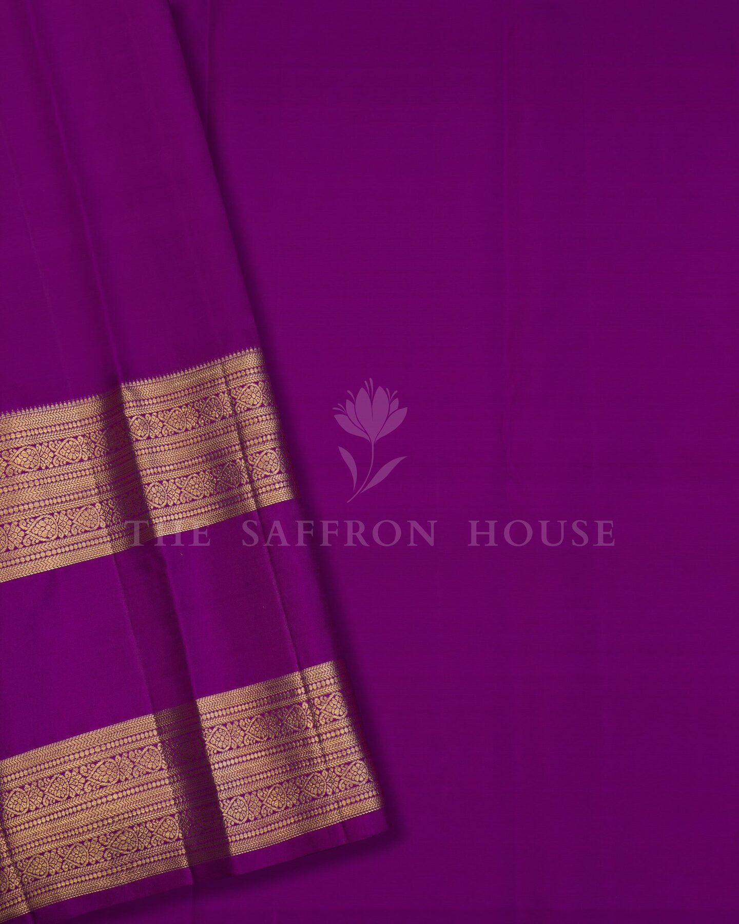 The body is woven with intricate traditional motifs, each thread placed with precision and purpose. A richly woven border frames the drape with confident definition, while silver and gold zari runs through the weave, catching light the way temple gold does — slowly, deeply, unforgettably.