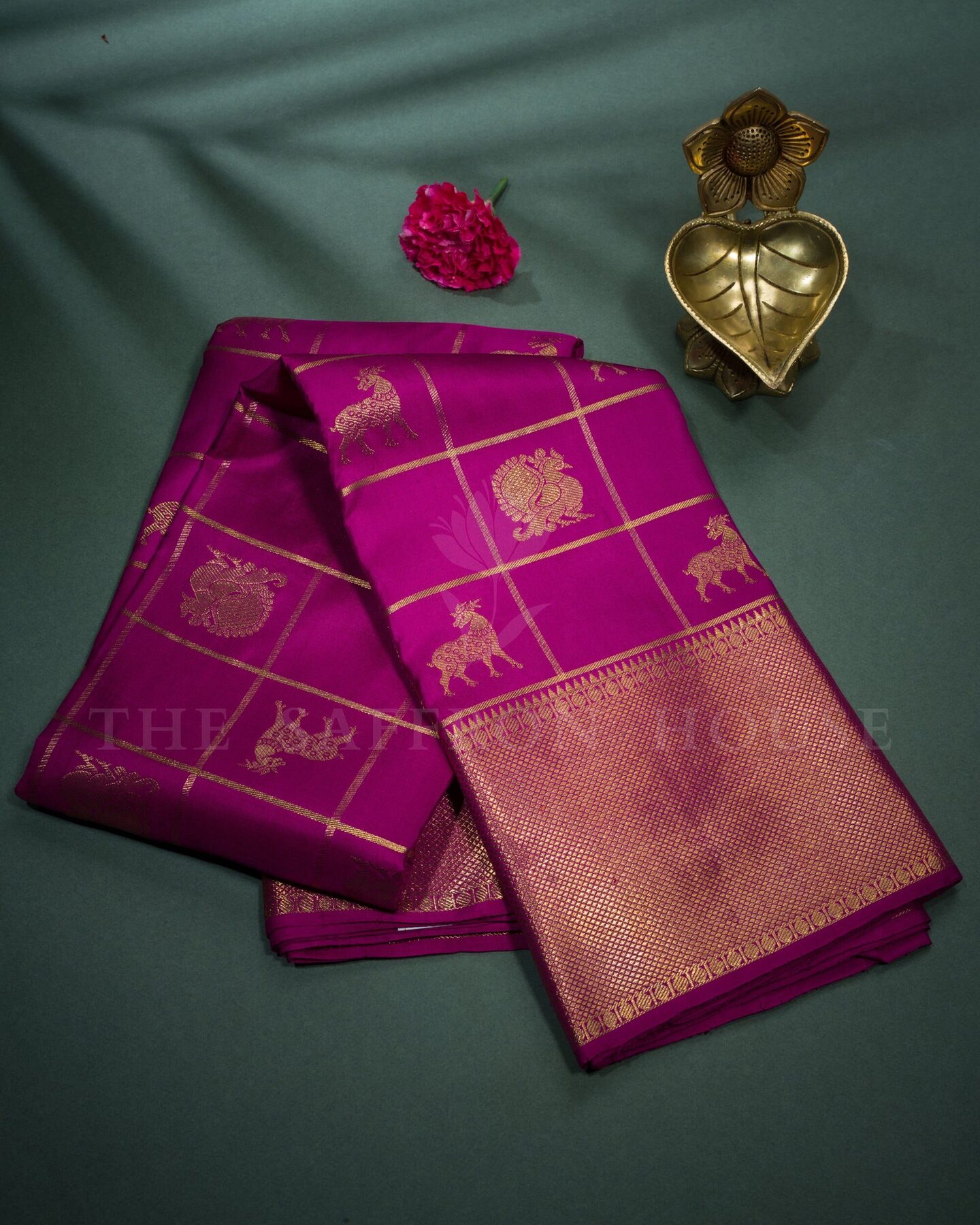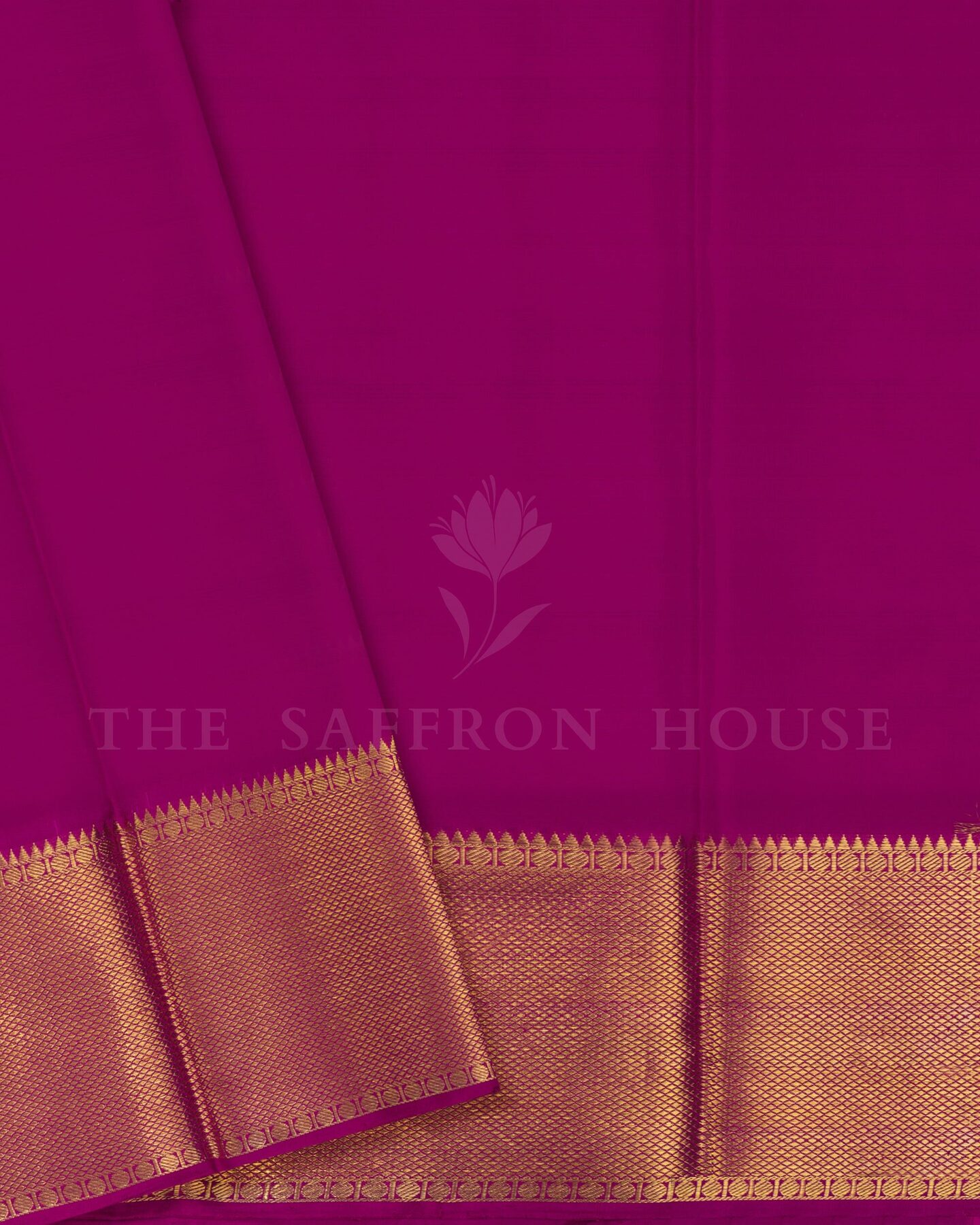 Some colours hold memory. Magenta — electric and unapologetically bold — becomes something entirely new when woven into pure Kanjivaram silk. This Kattam saree carries that colour with quiet authority and grace.