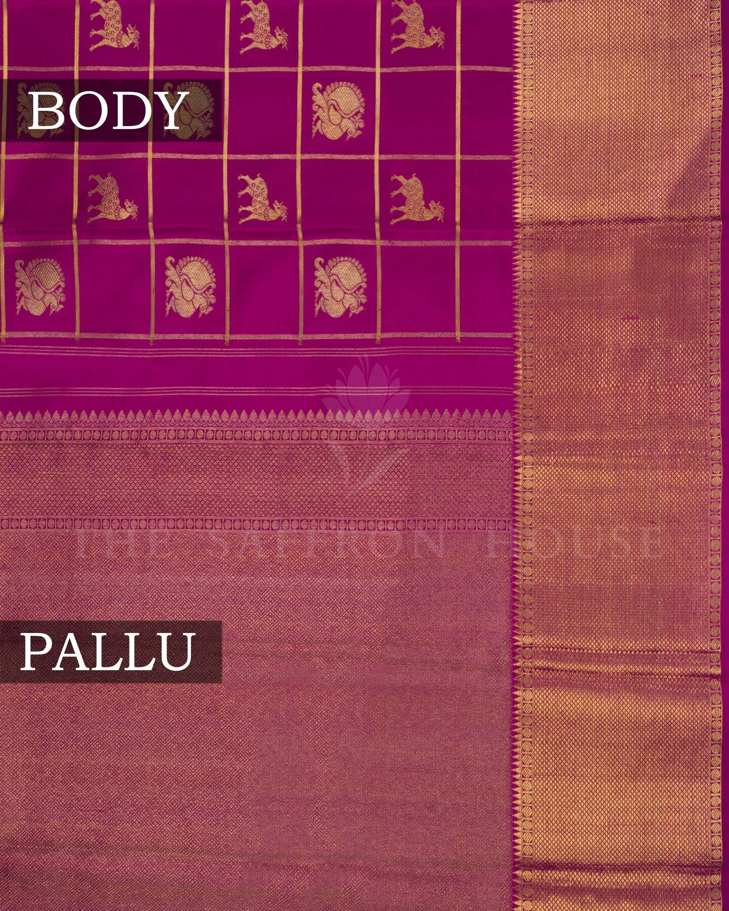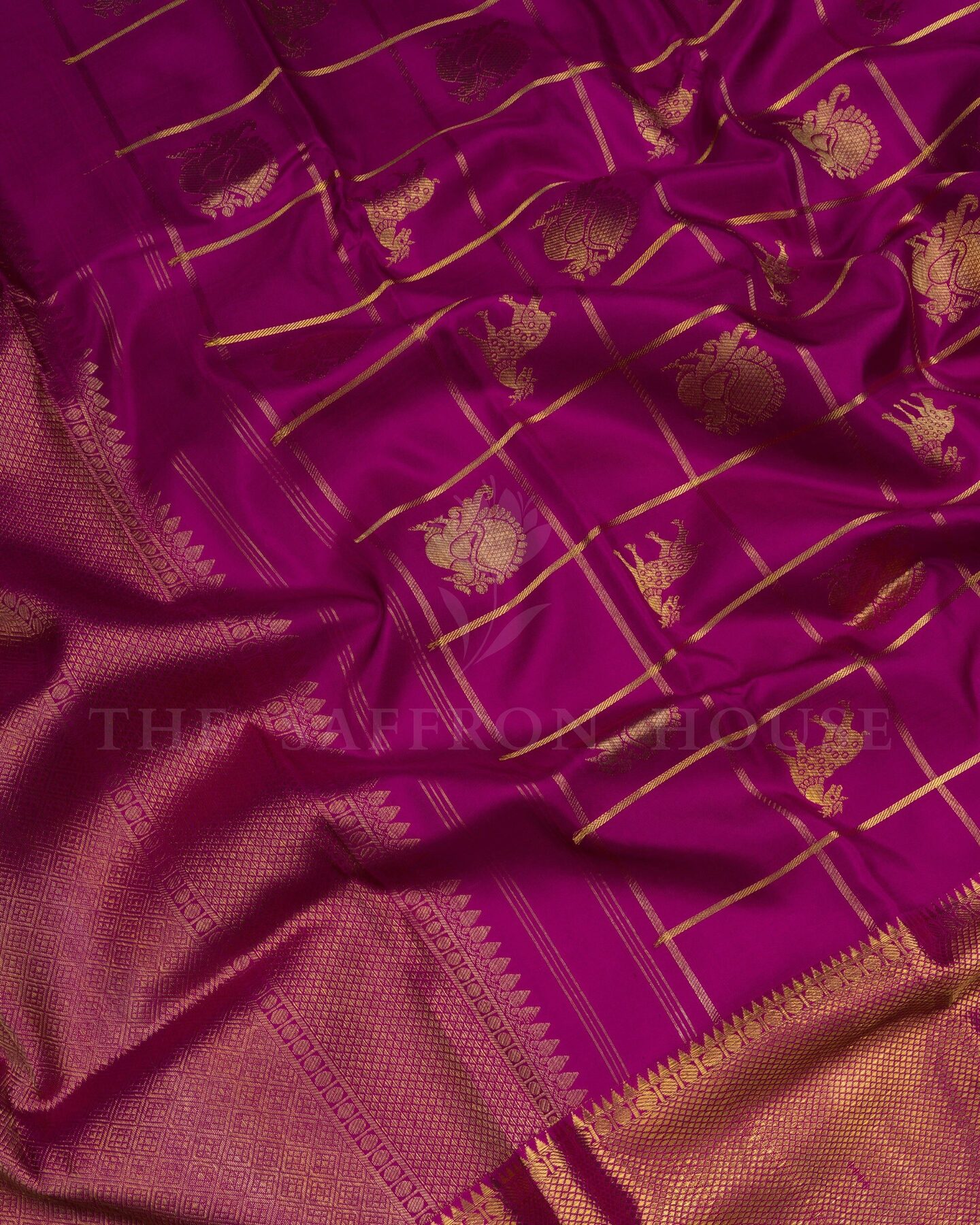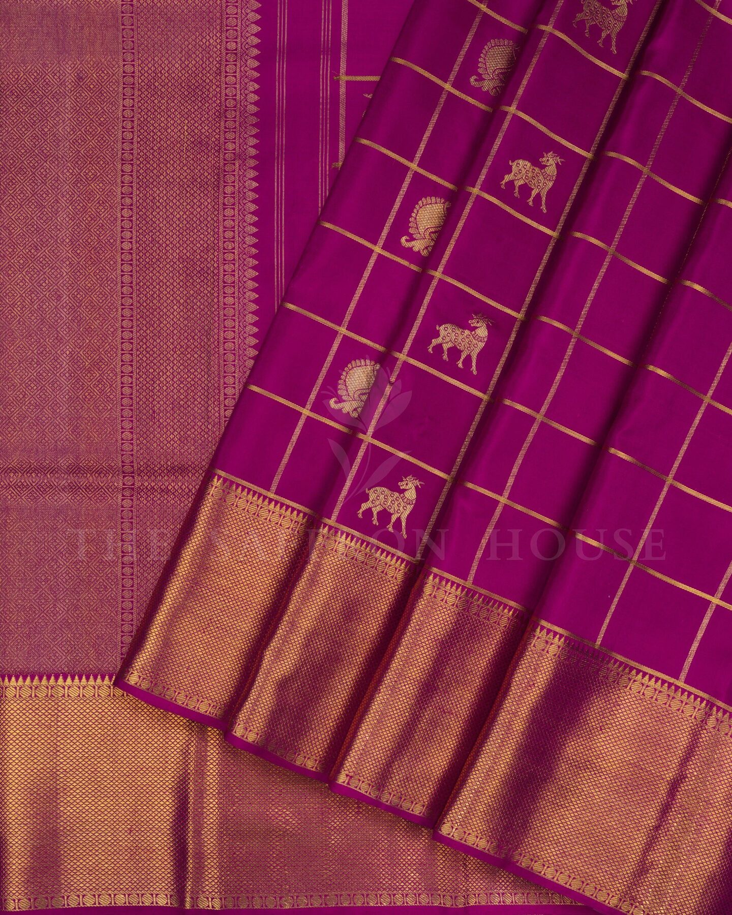 The body is adorned with traditional checks with peacock & deer motifs, each thread placed with precision and purpose. The self border frames the drape with confident definition, while gold zari runs through the weave, catching light the way temple gold does — slowly, deeply, unforgettably.