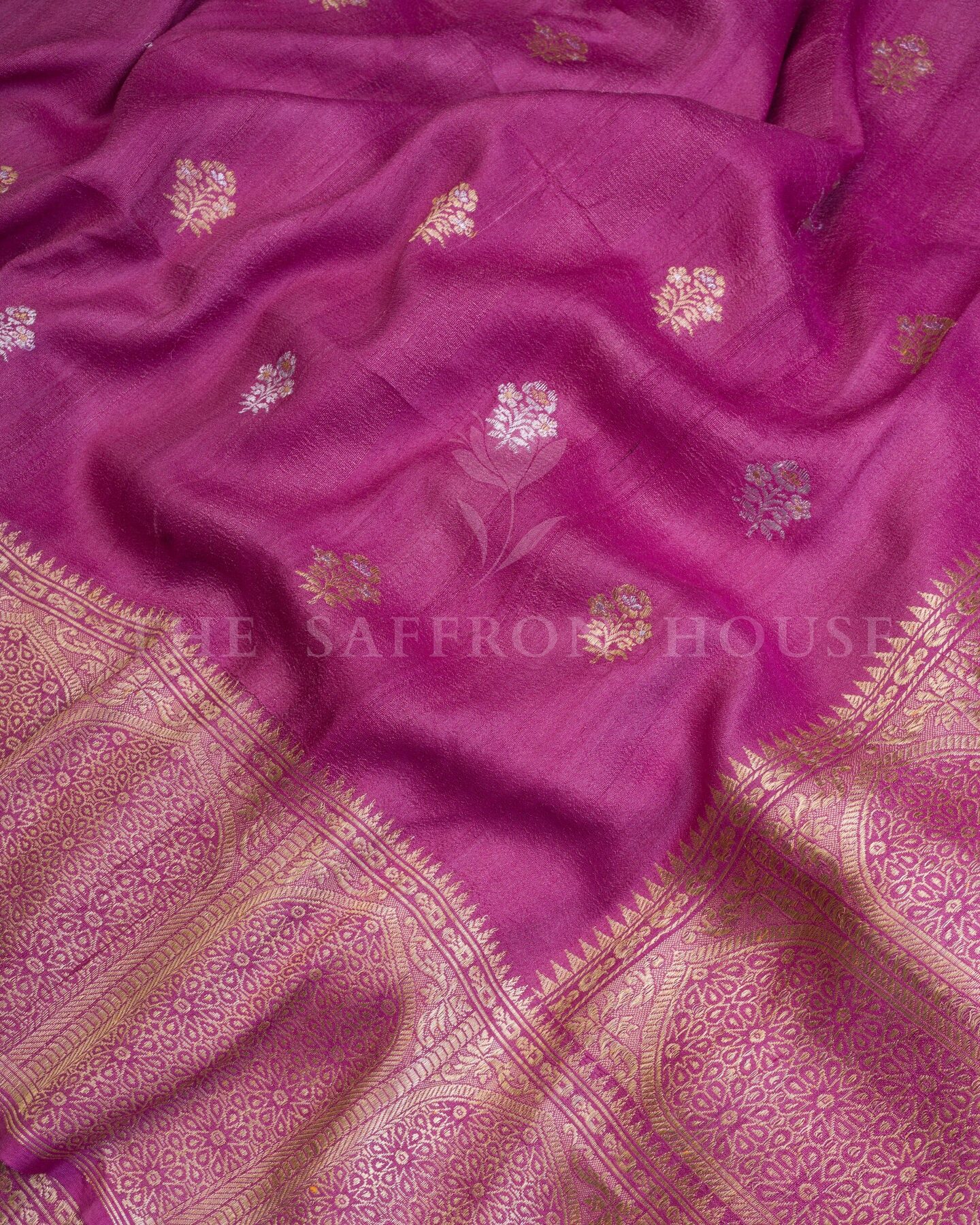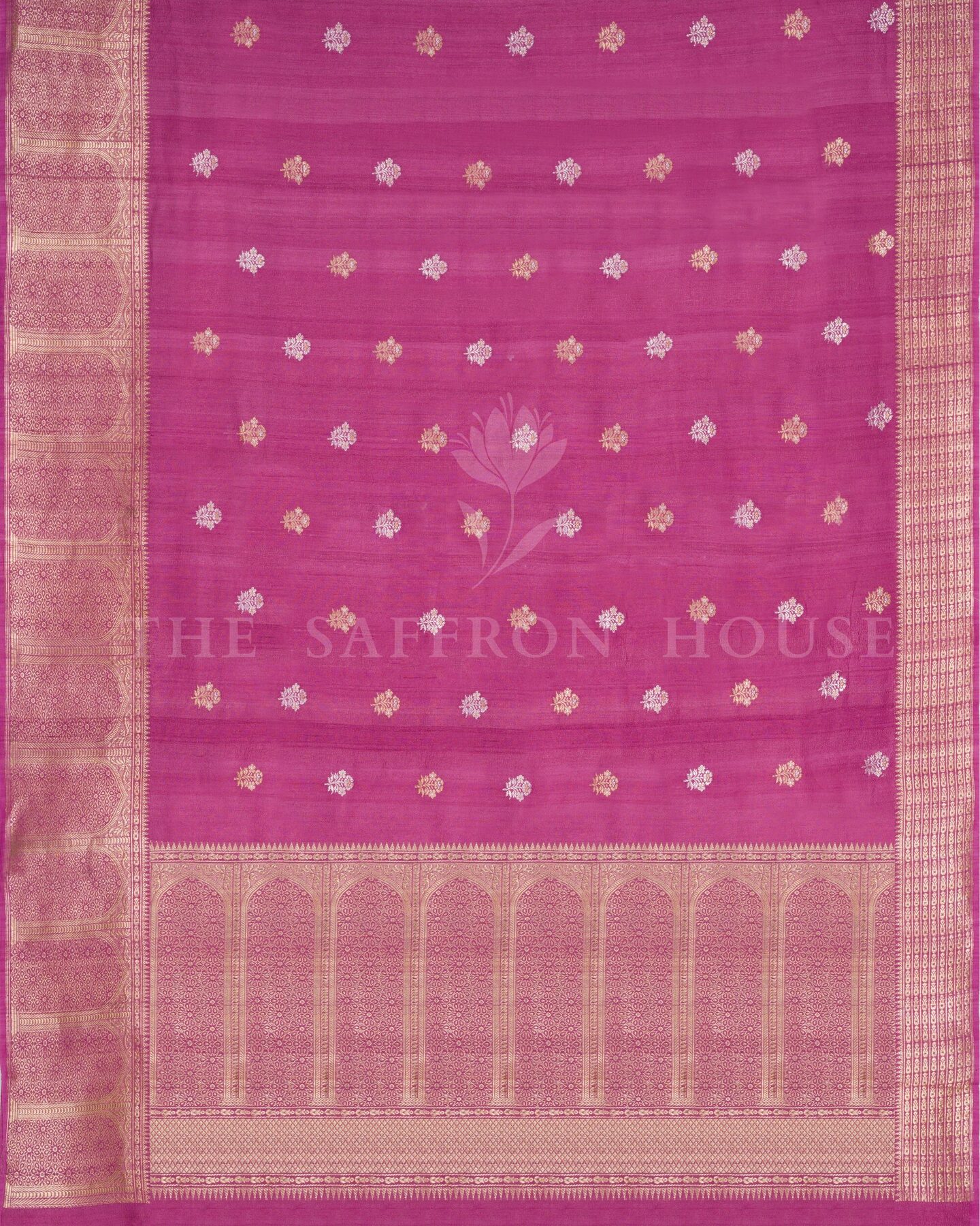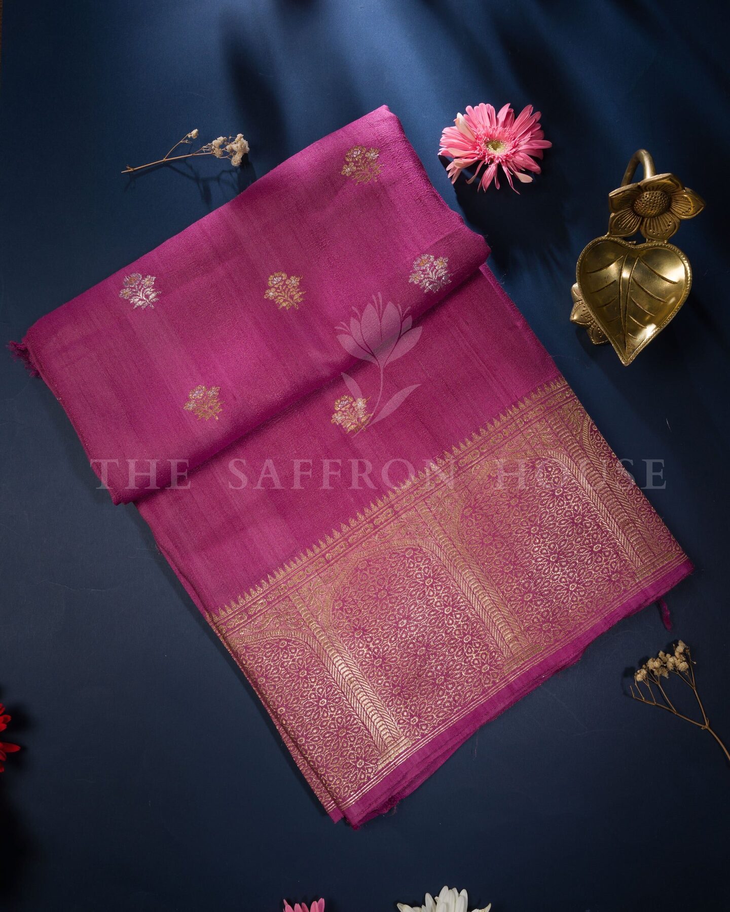 Some colours hold memory. Magenta Pink — radiant in its own quiet way — becomes something entirely new when woven into pure Kanjivaram silk. This Jaal saree carries that colour with quiet authority and grace.