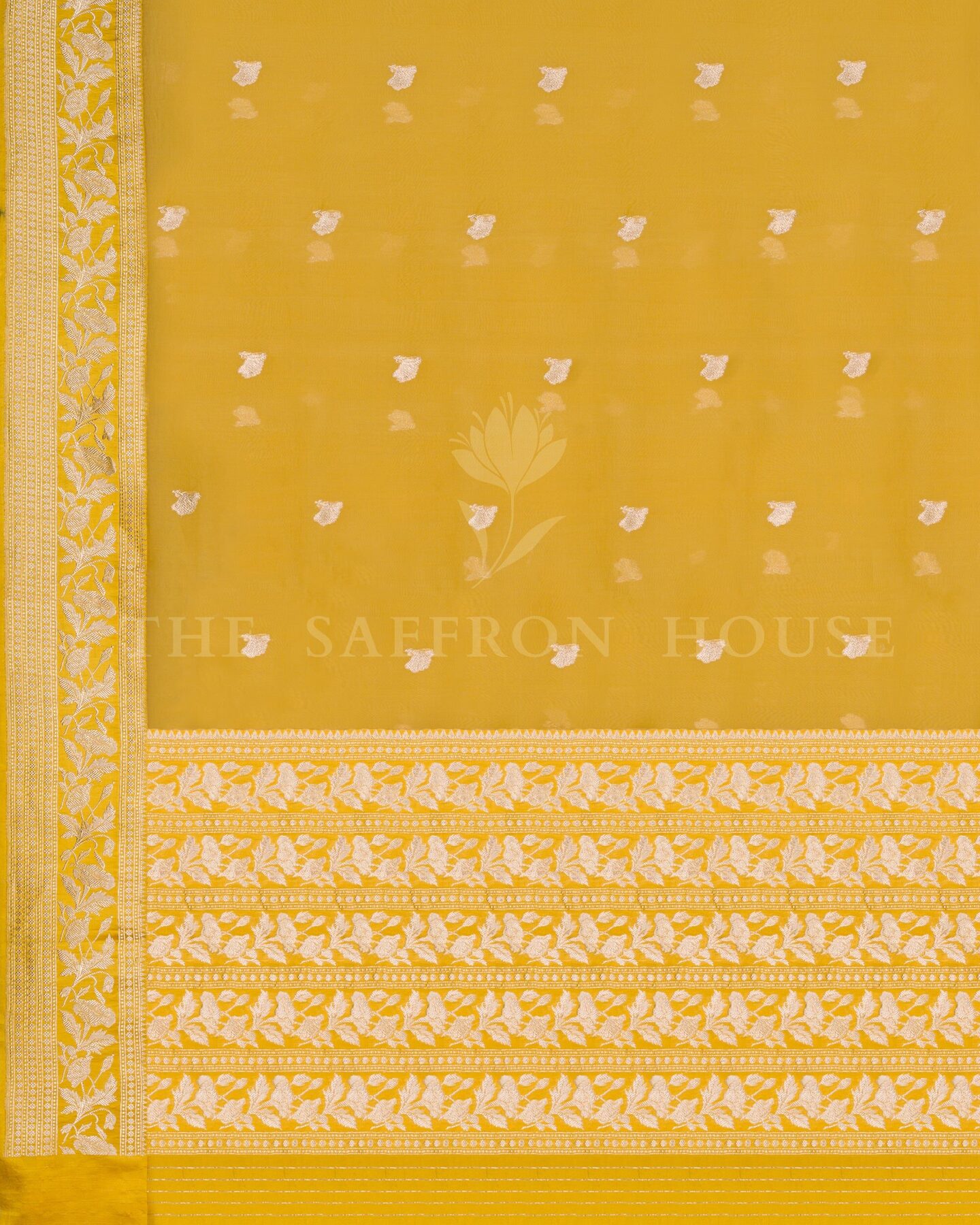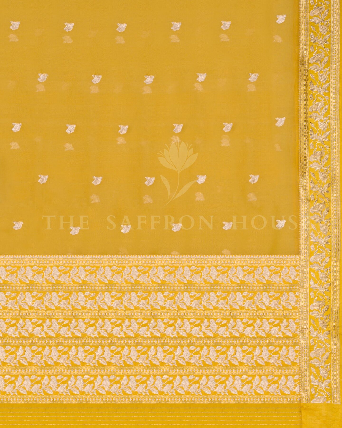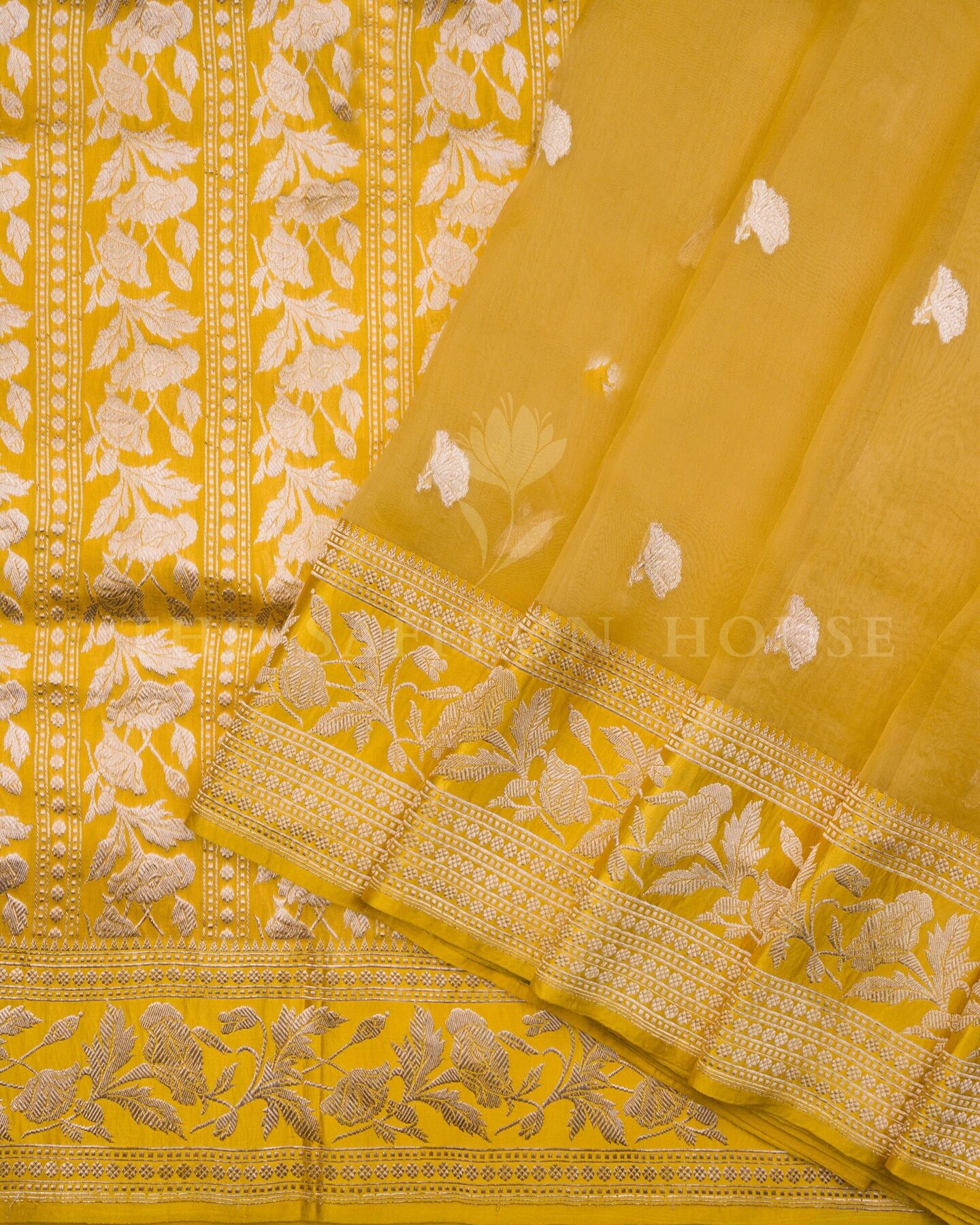 Kora silk, also known as organza, is a sheer, crisp, and lightweight fabric made from silk yarns.. Woven in the revered looms of Varanasi, this saree is a product of traditional karigari—where skill, symmetry, and story come together in every motif.