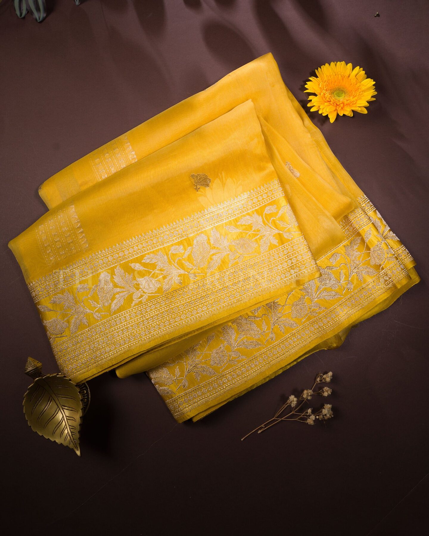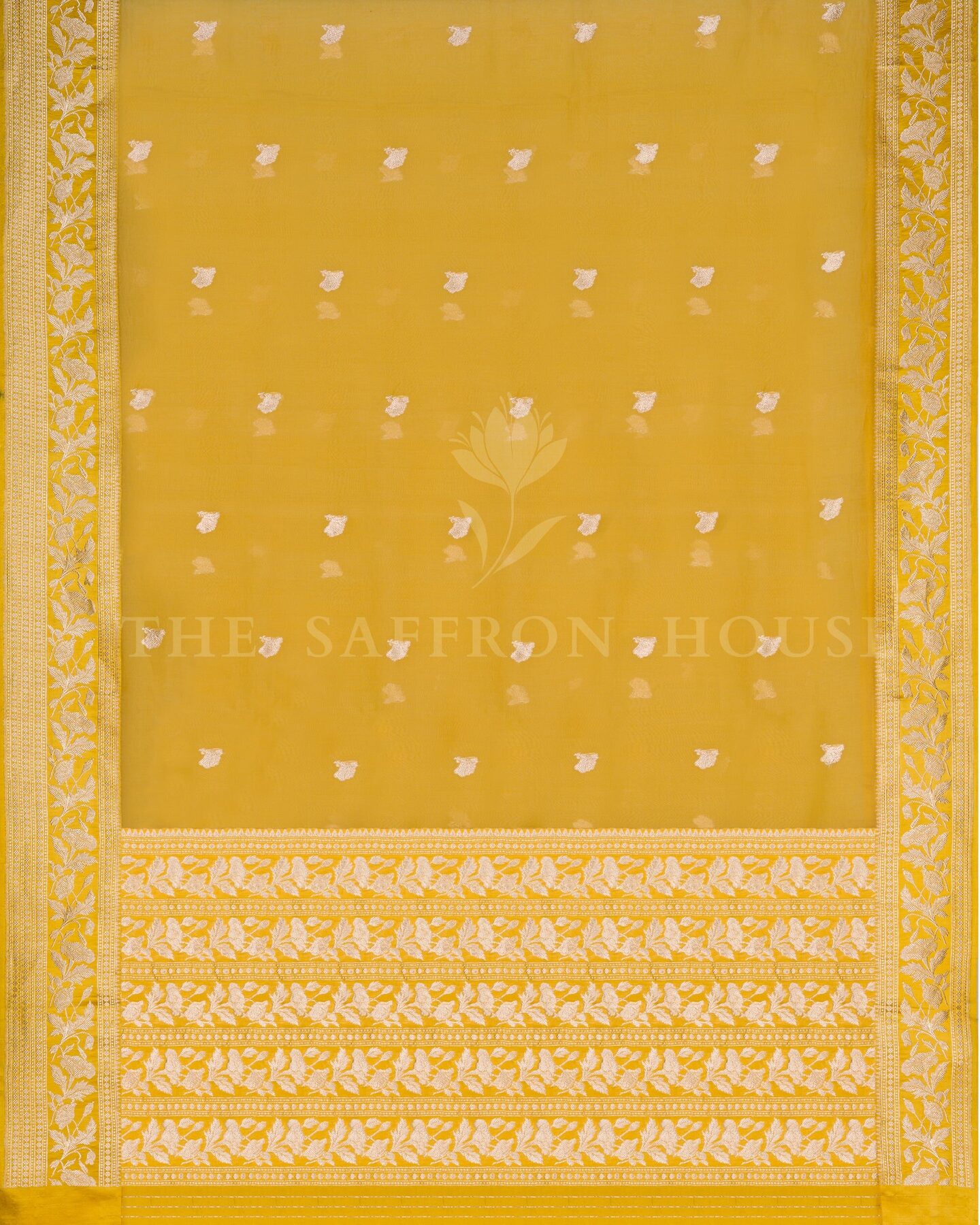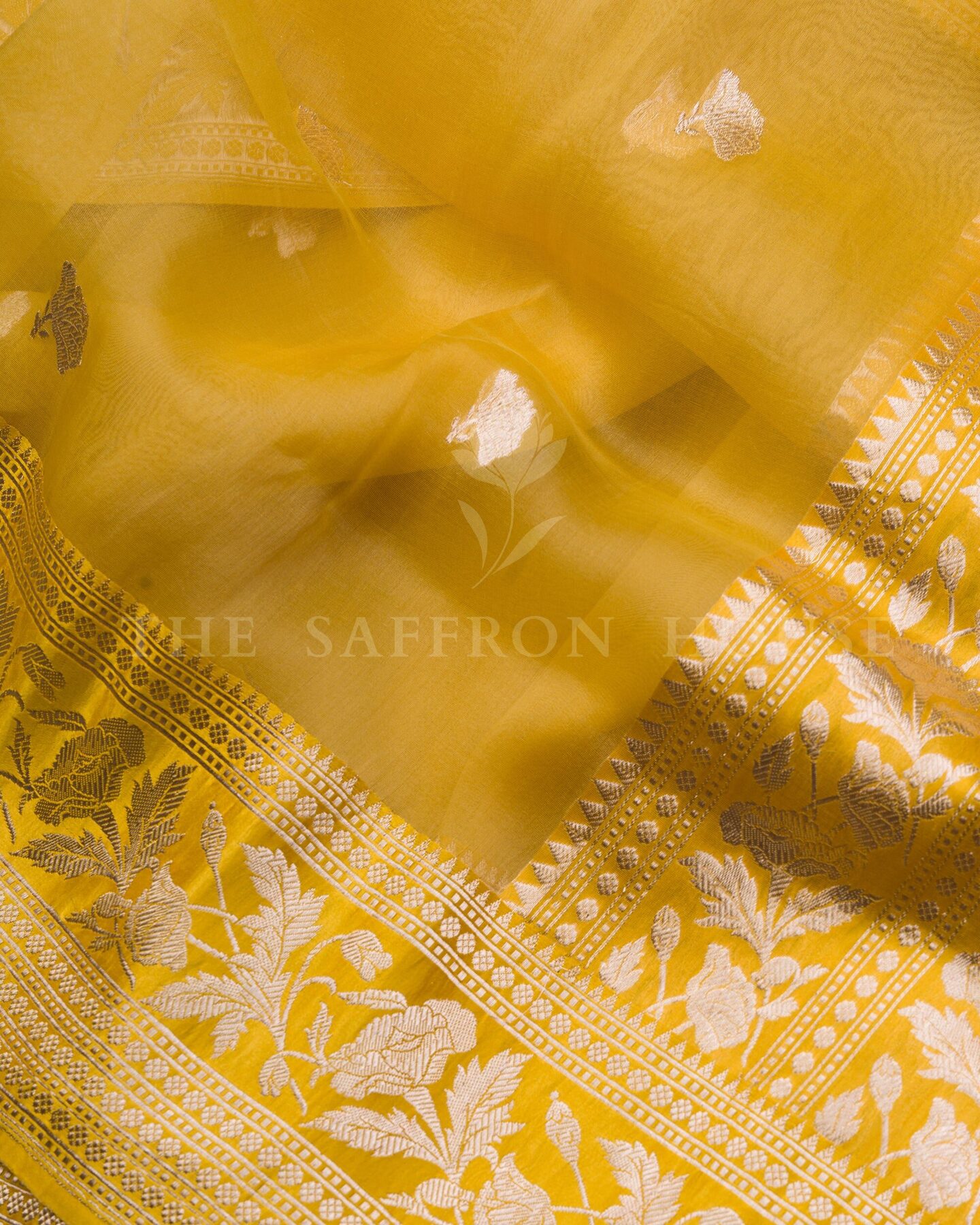 Kora silk, also known as organza, is a sheer, crisp, and lightweight fabric made from silk yarns.. Woven in the revered looms of Varanasi, this saree is a product of traditional karigari—where skill, symmetry, and story come together in every motif.