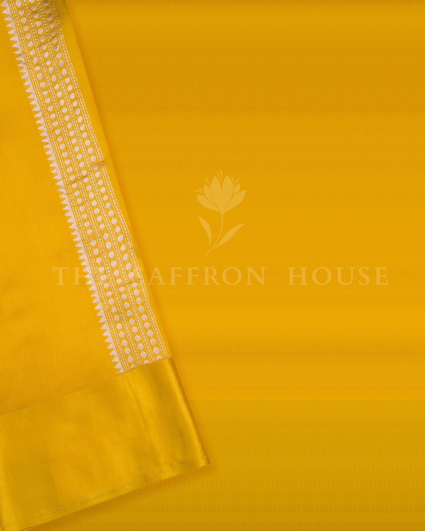 Some colours hold memory. Gold — luminous as temple gold at dusk — becomes something entirely new when woven into pure Kanjivaram silk. This Kora saree carries that colour with quiet authority and grace.