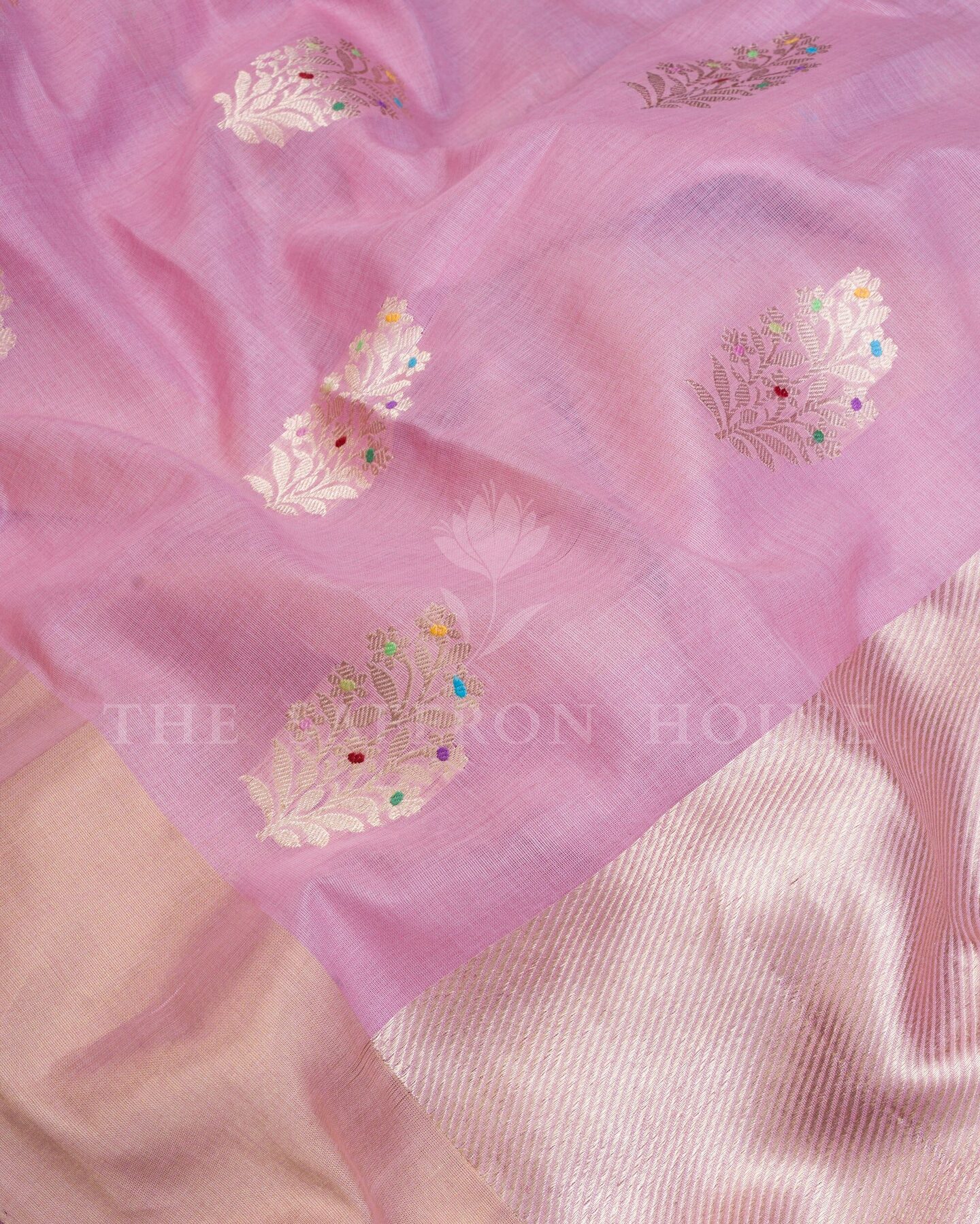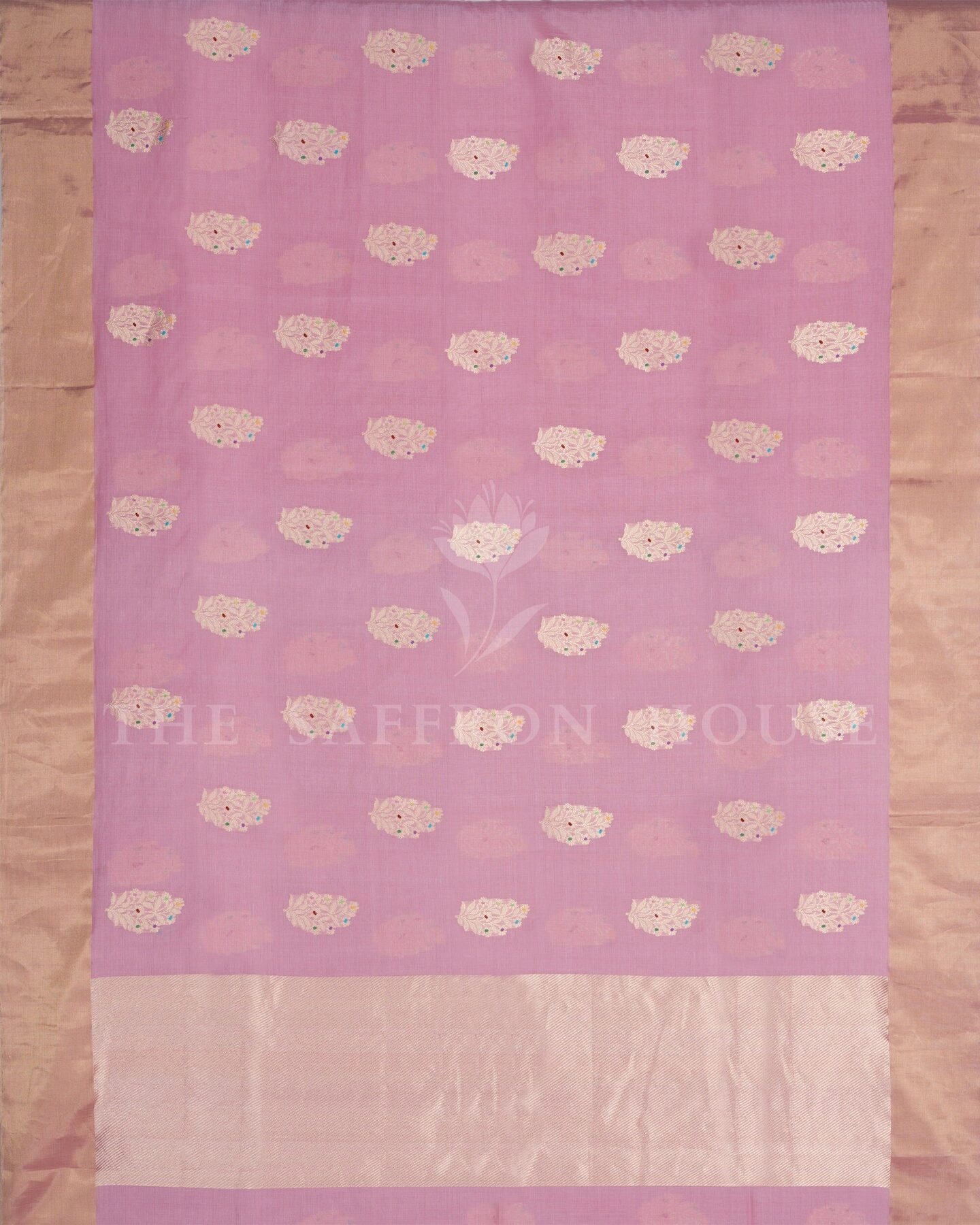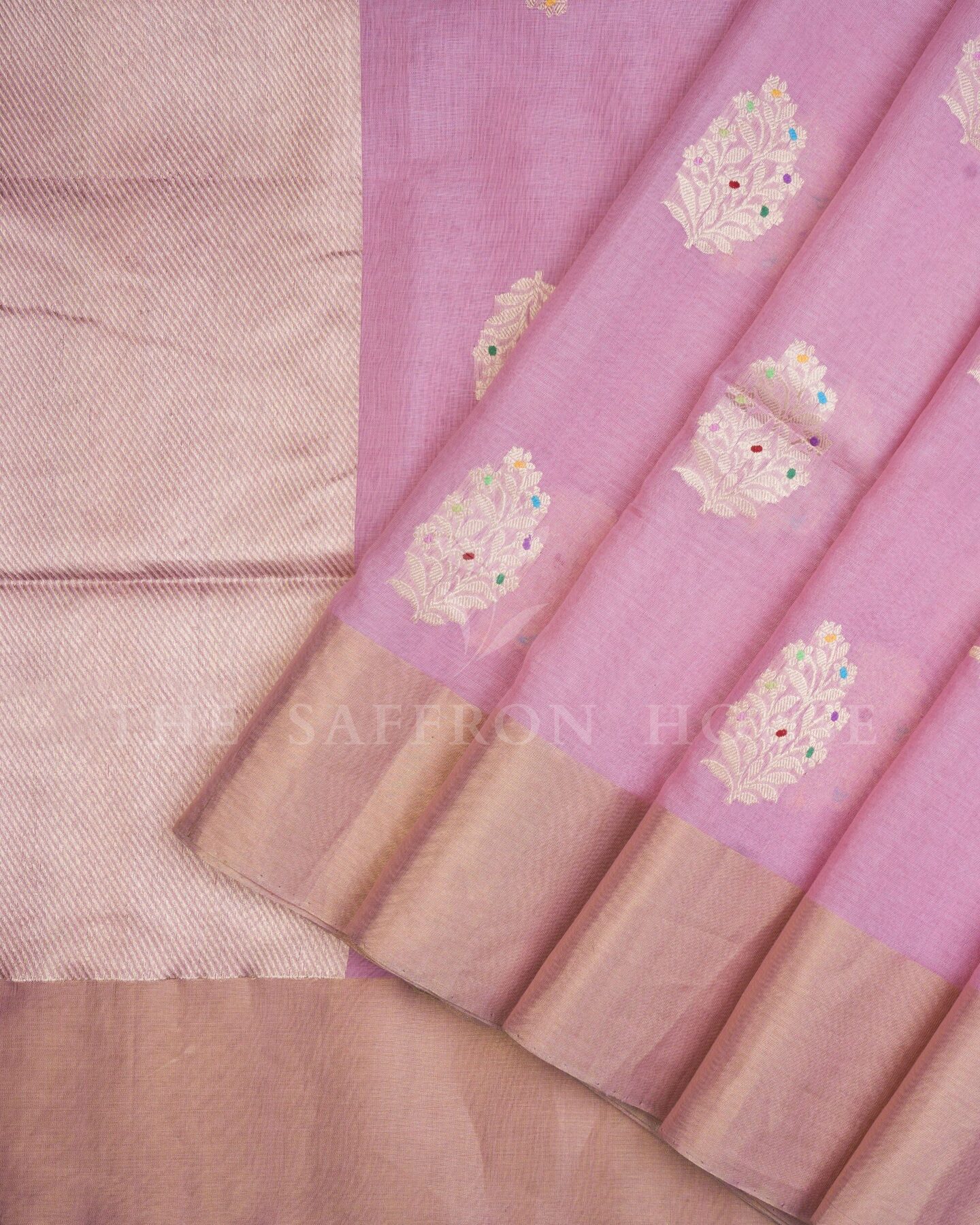 There is something about the interplay of mauve and pink that feels both ancient and alive. This Tissue Kanjivaram silk saree opens with radiant in its own quiet way, its surface shimmering with the unhurried rhythm of the loom.