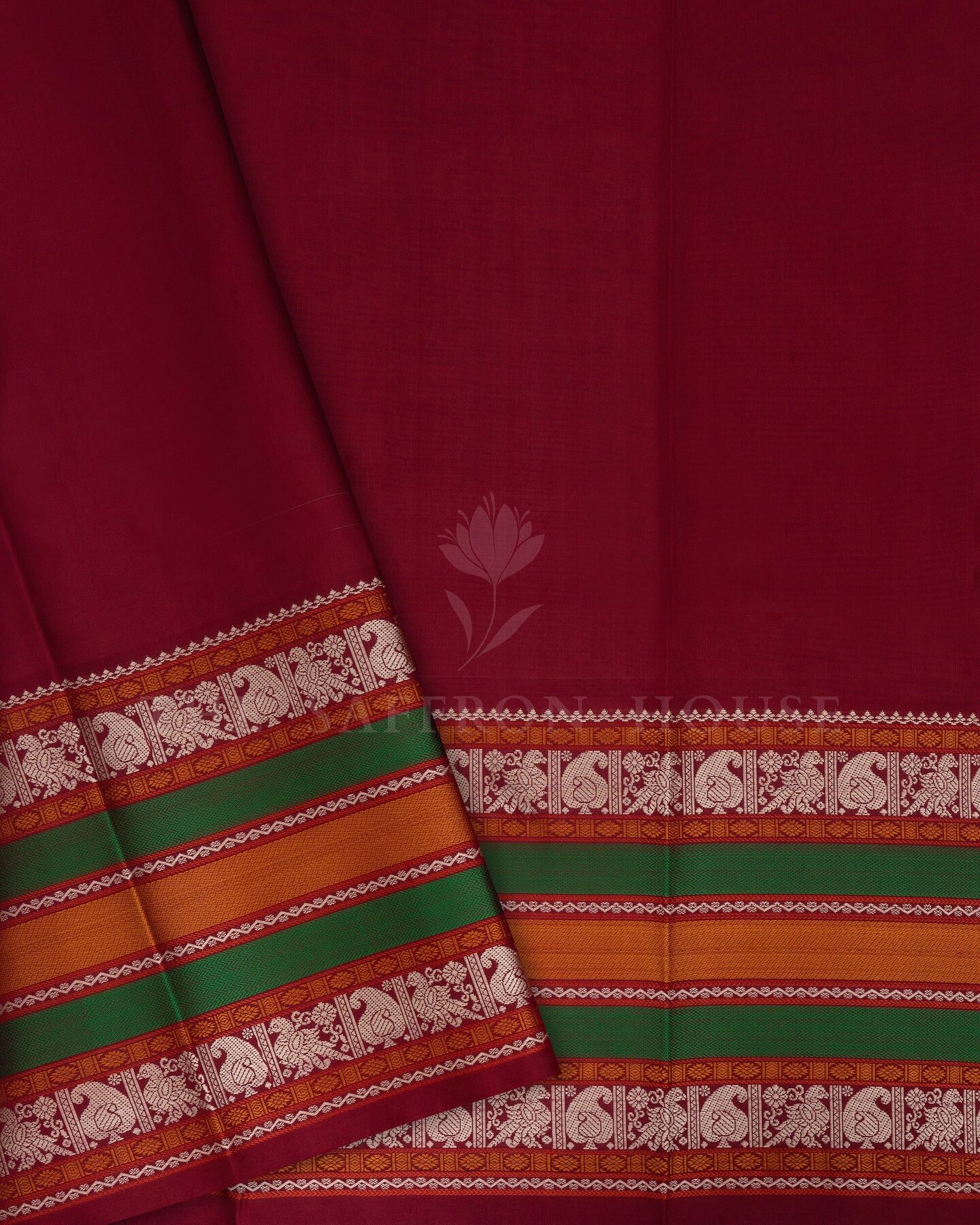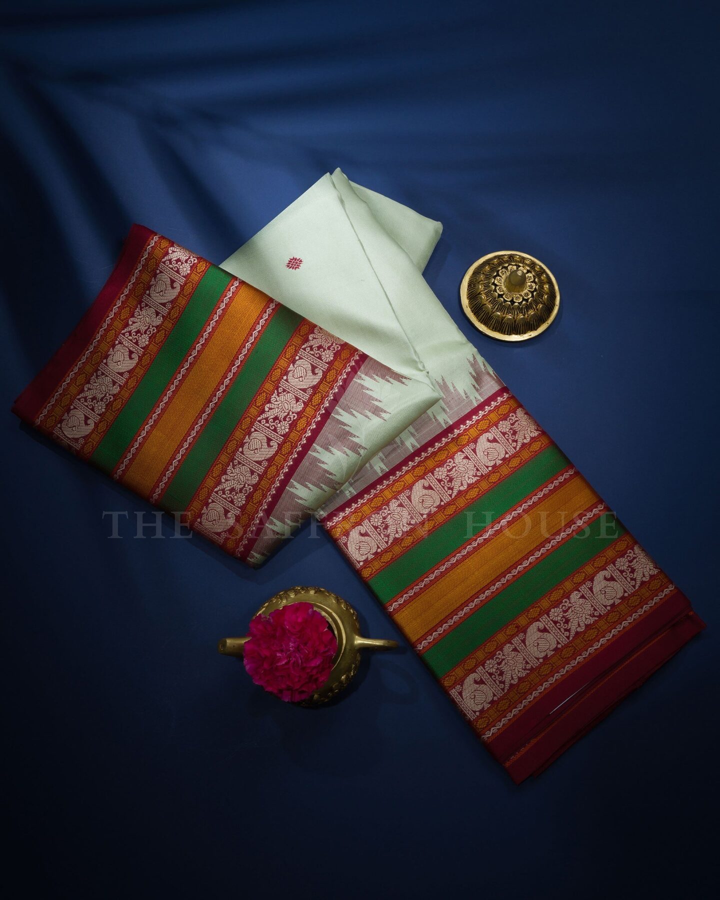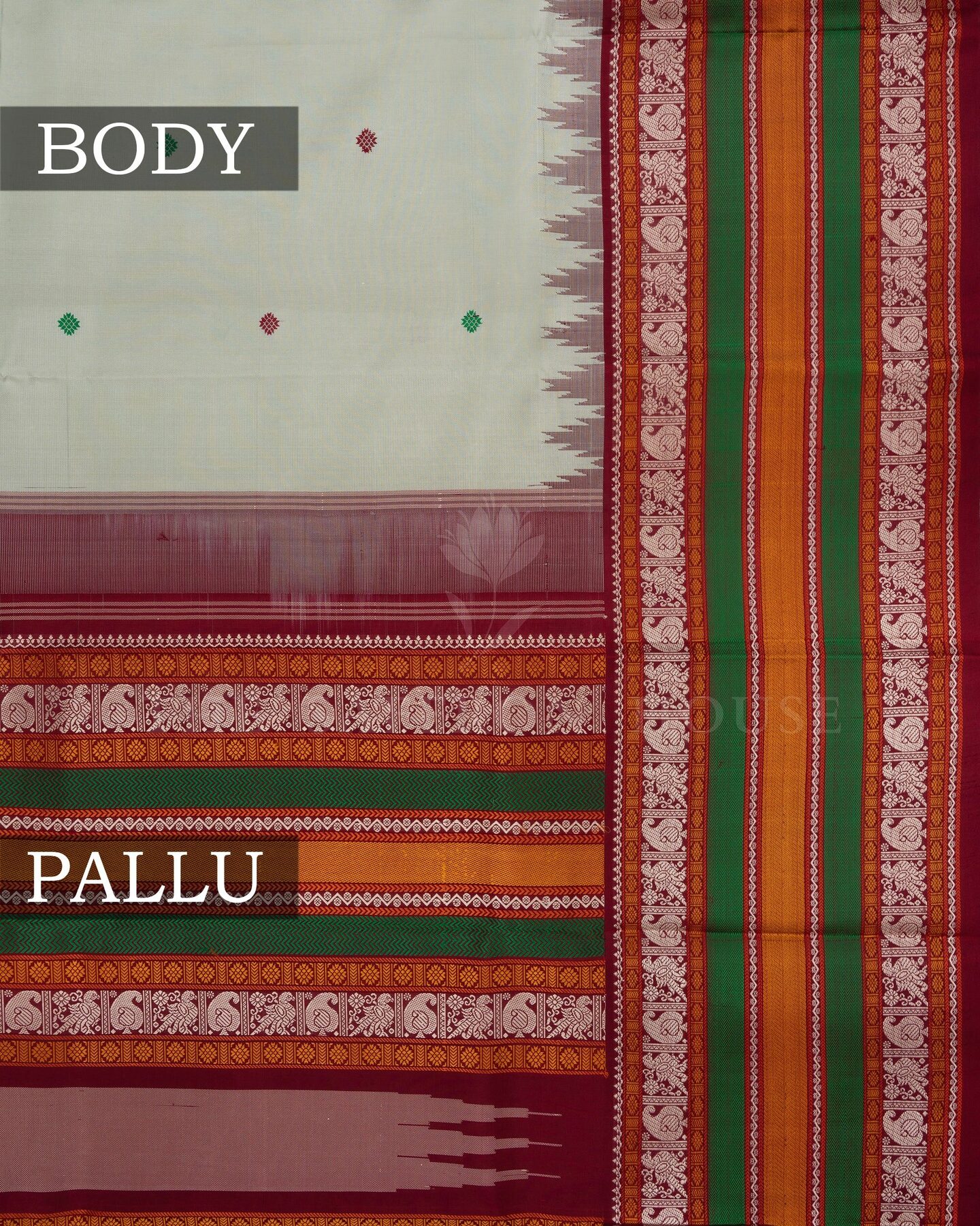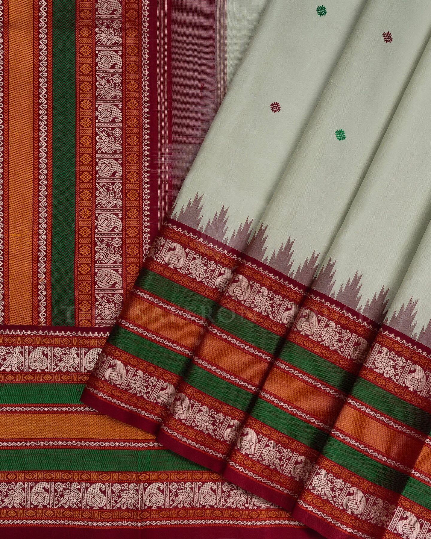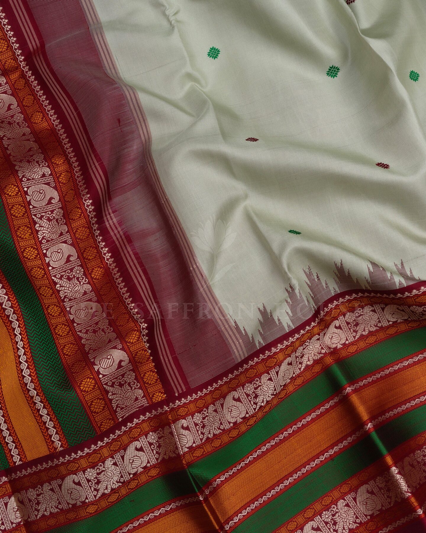 The body is adorned with maroon & green small thread work motifs, each thread placed with precision and purpose. The maroon border frames the drape with confident definition, while gold zari runs through the weave, catching light the way temple gold does — slowly, deeply, unforgettably.