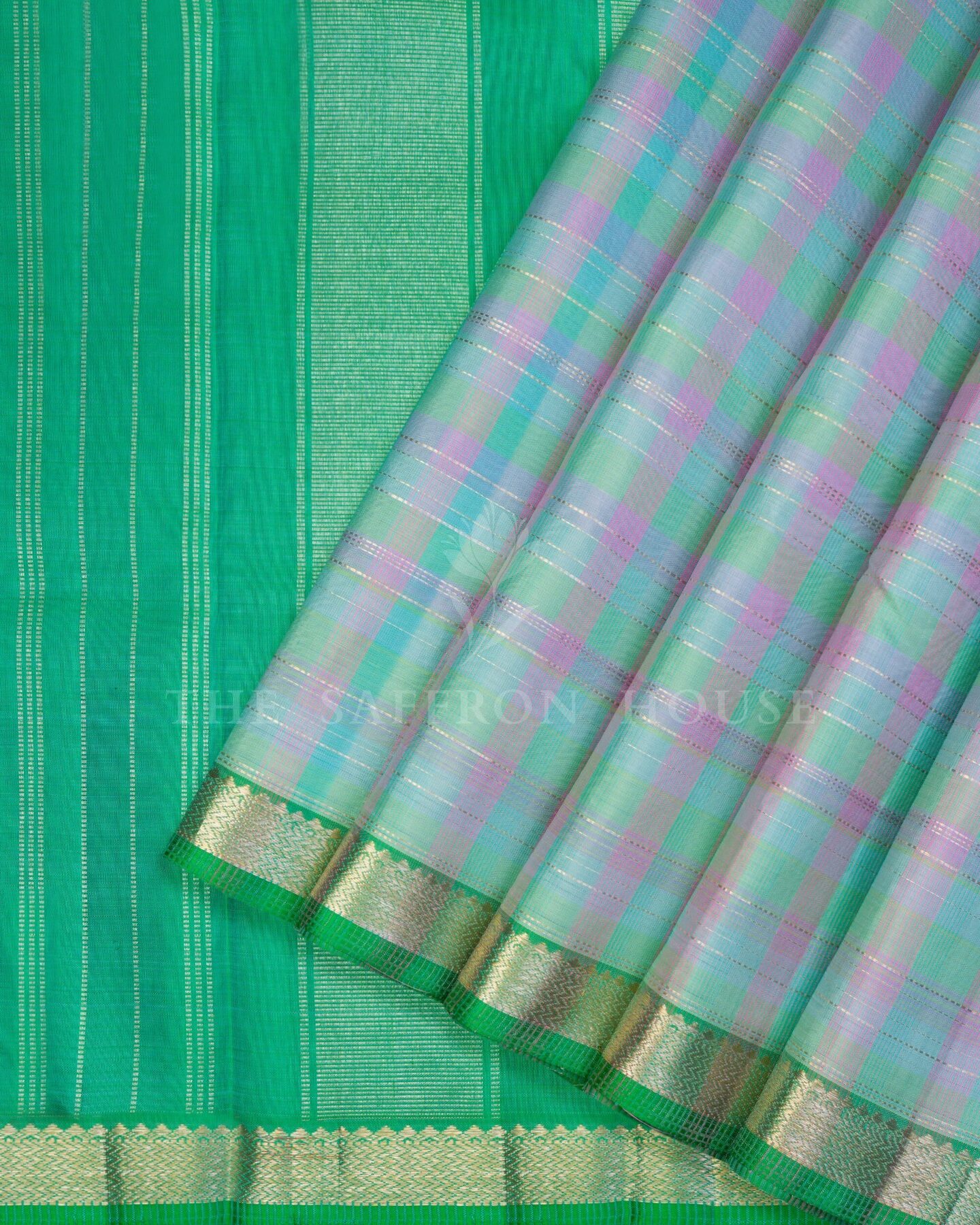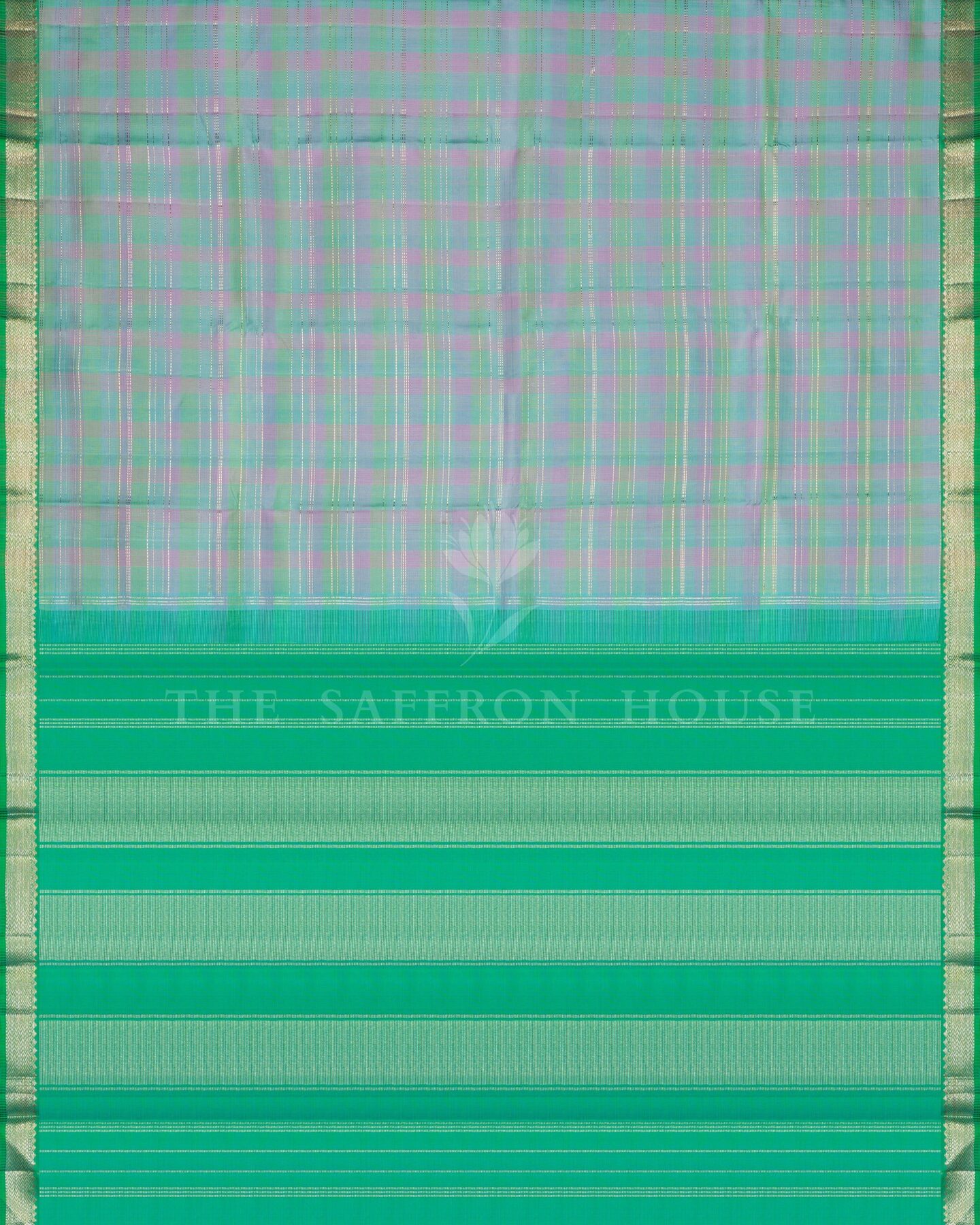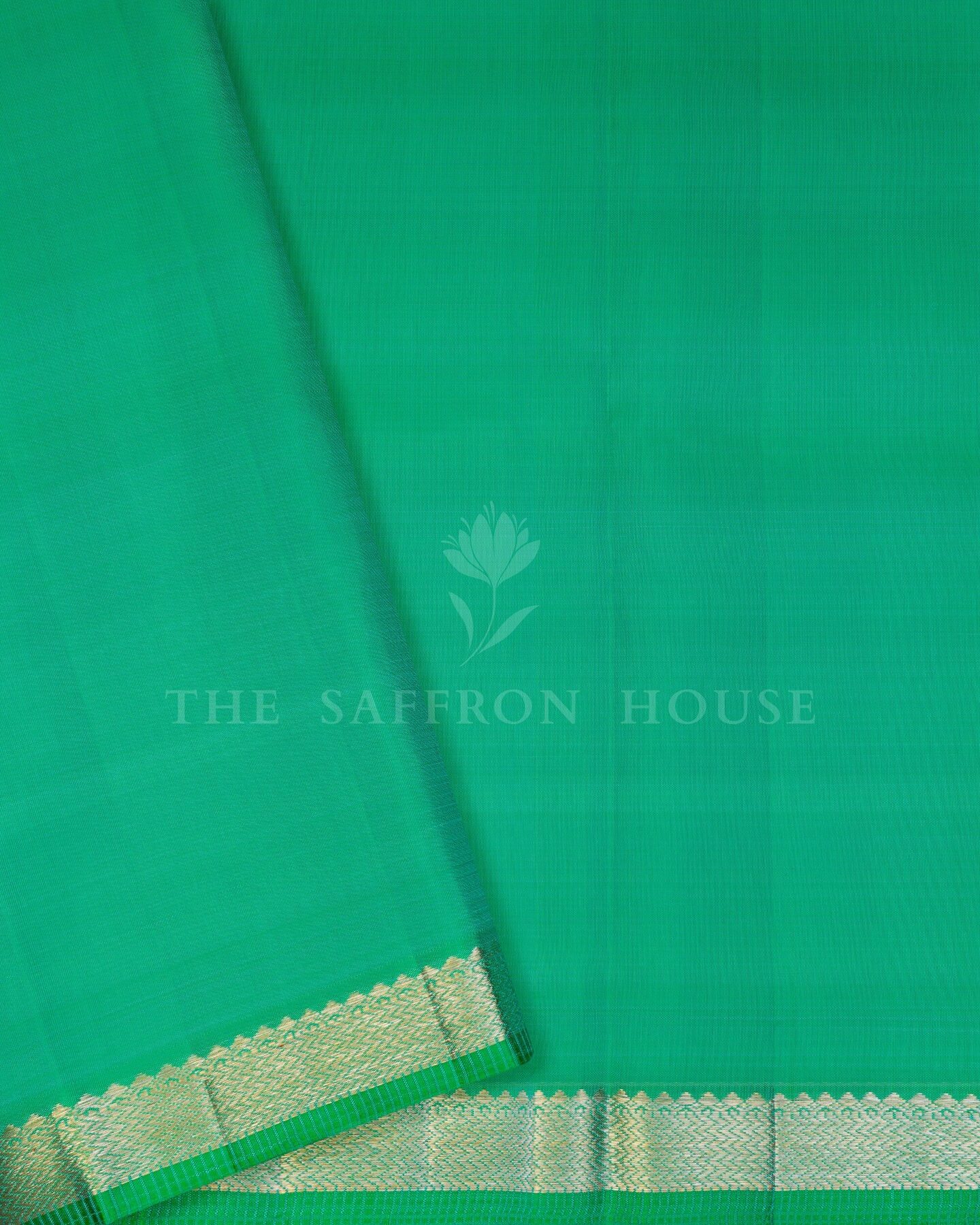 There is something about the interplay of pastels and emerald green that feels both ancient and alive. This Kattam Kanjivaram silk saree opens with radiant in its own quiet way, its surface shimmering with the unhurried rhythm of the loom.