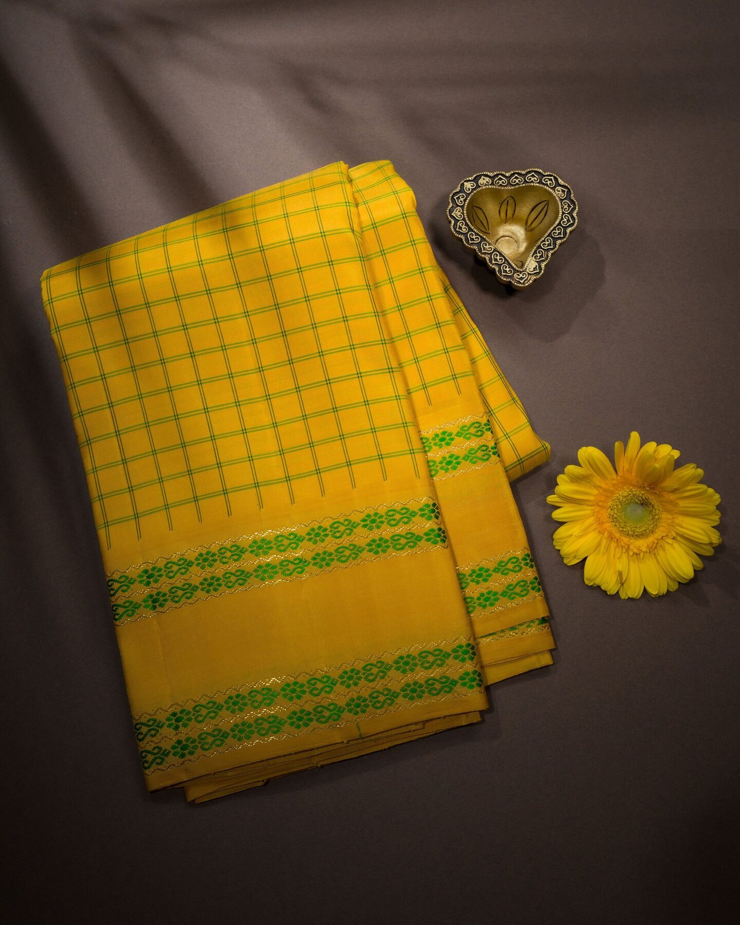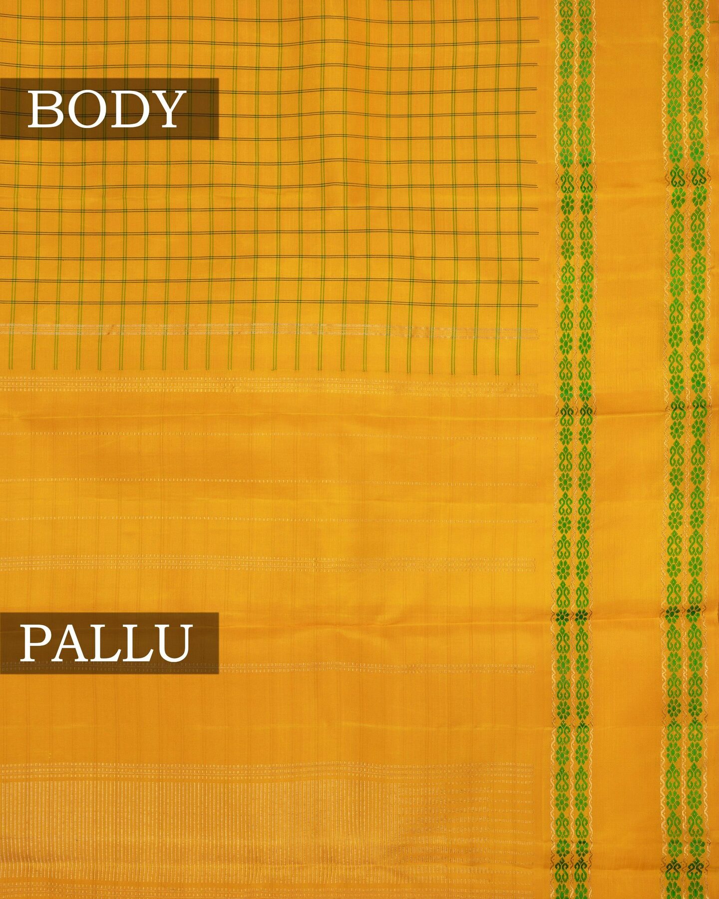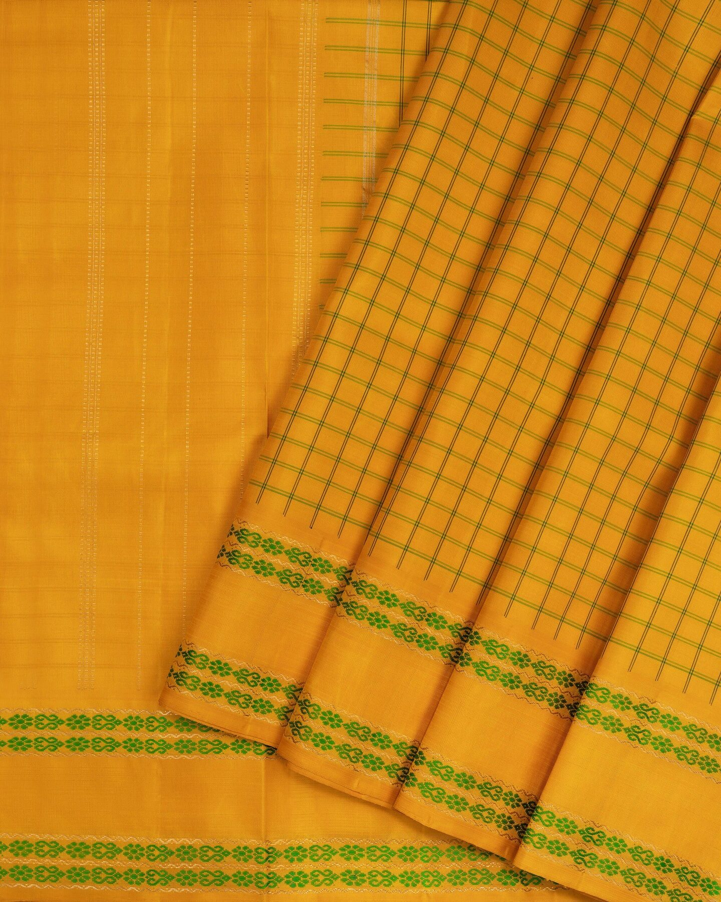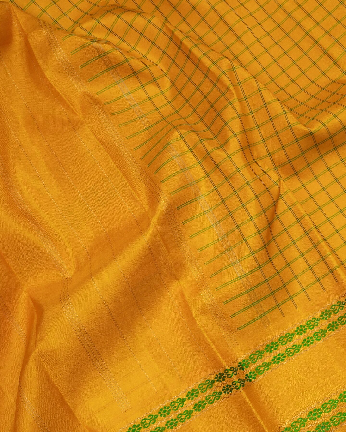 The body is adorned with leaf green medium checks, each thread placed with precision and purpose. The self border frames the drape with confident definition, while gold zari runs through the weave, catching light the way temple gold does — slowly, deeply, unforgettably.