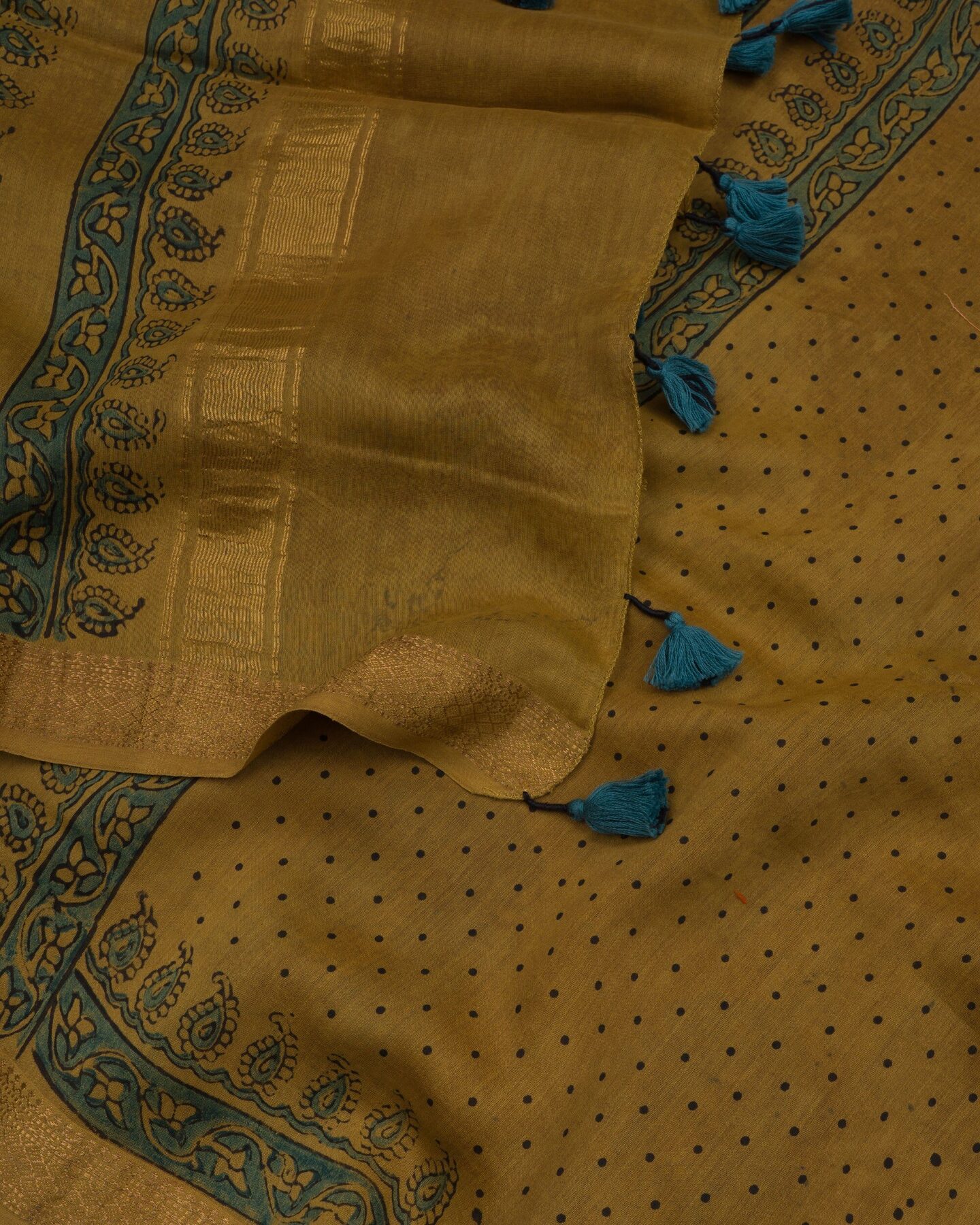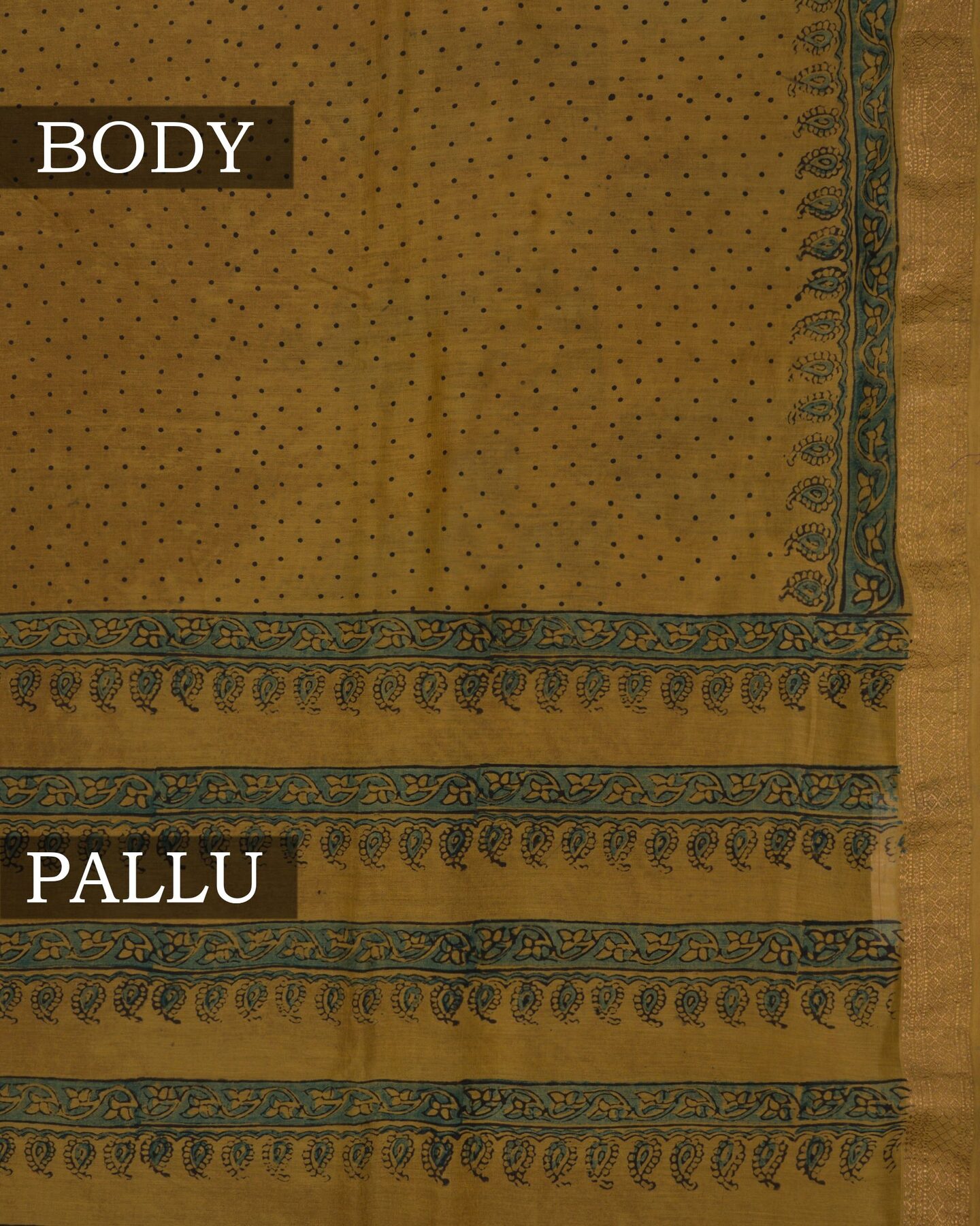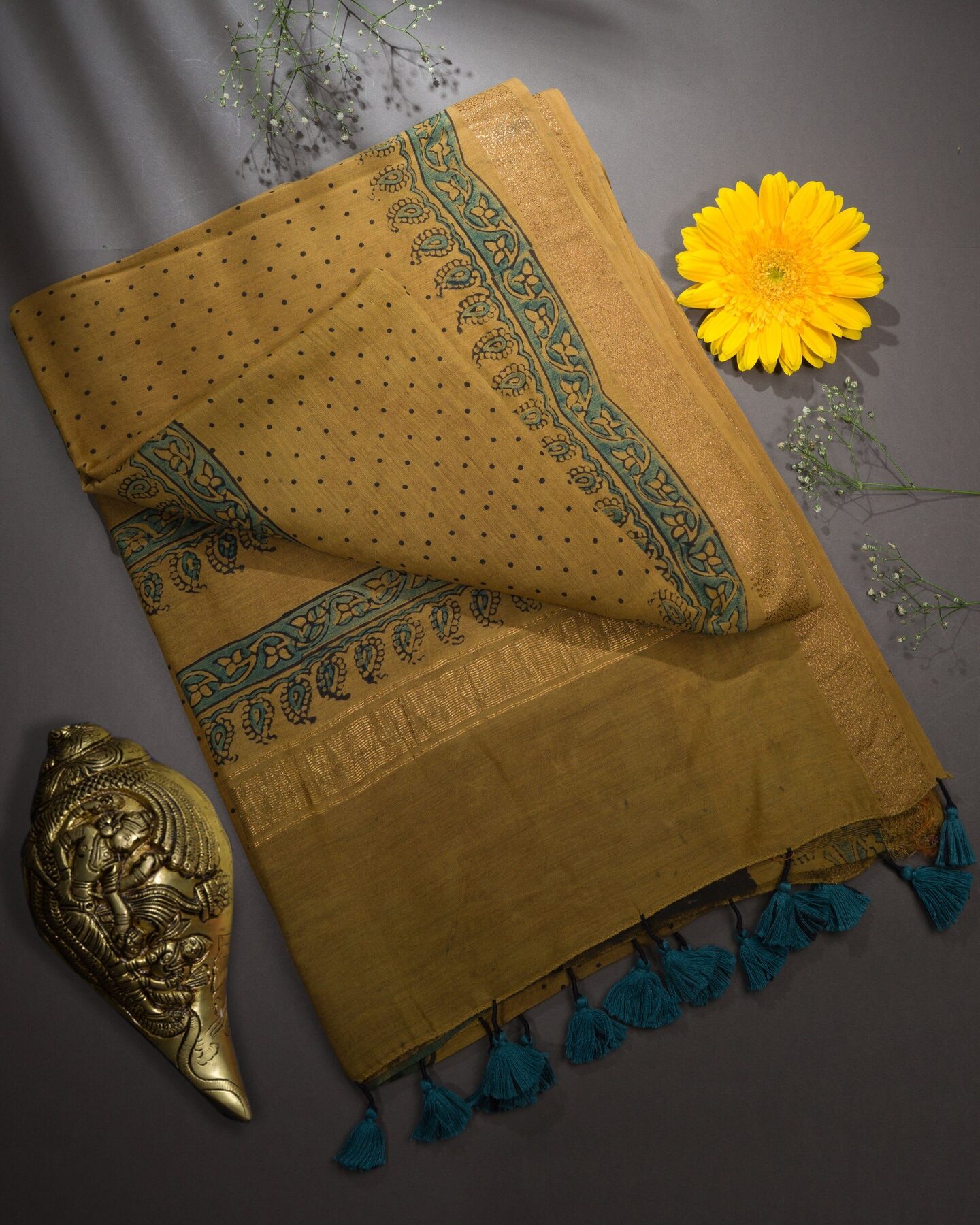 The body is adorned with small polka dot, each thread placed with precision and purpose. The self border frames the drape with confident definition, while gold zari runs through the weave, catching light the way temple gold does — slowly, deeply, unforgettably.