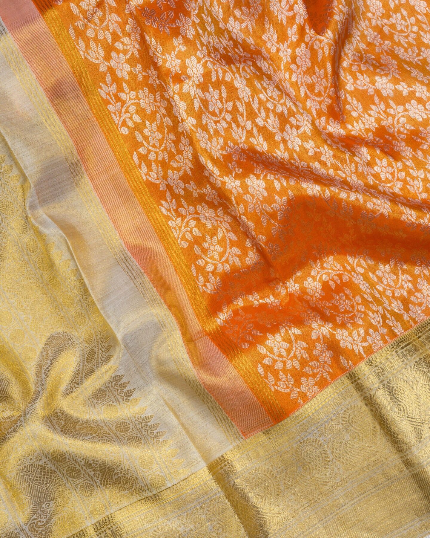 There is something about the interplay of orange and gold that feels both ancient and alive. This Brocade Kanjivaram silk saree opens with vibrant as a marigold garland at the threshold, its surface shimmering with the unhurried rhythm of the loom.