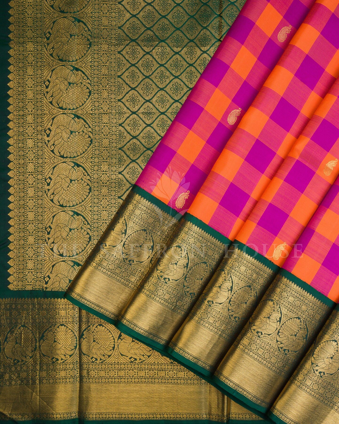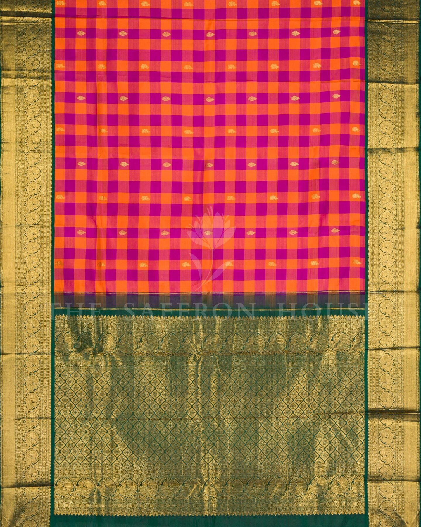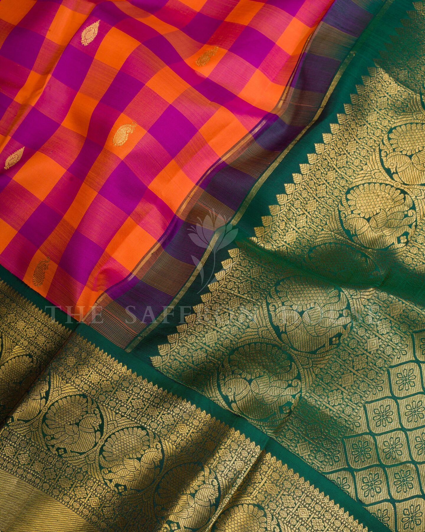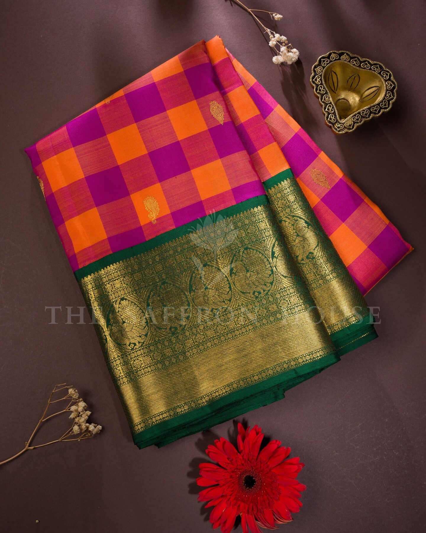 There is something about the interplay of orange and magenta that feels both ancient and alive. This Korvai Kanjivaram silk saree opens with vibrant as a marigold garland at the threshold, its surface shimmering with the unhurried rhythm of the loom.