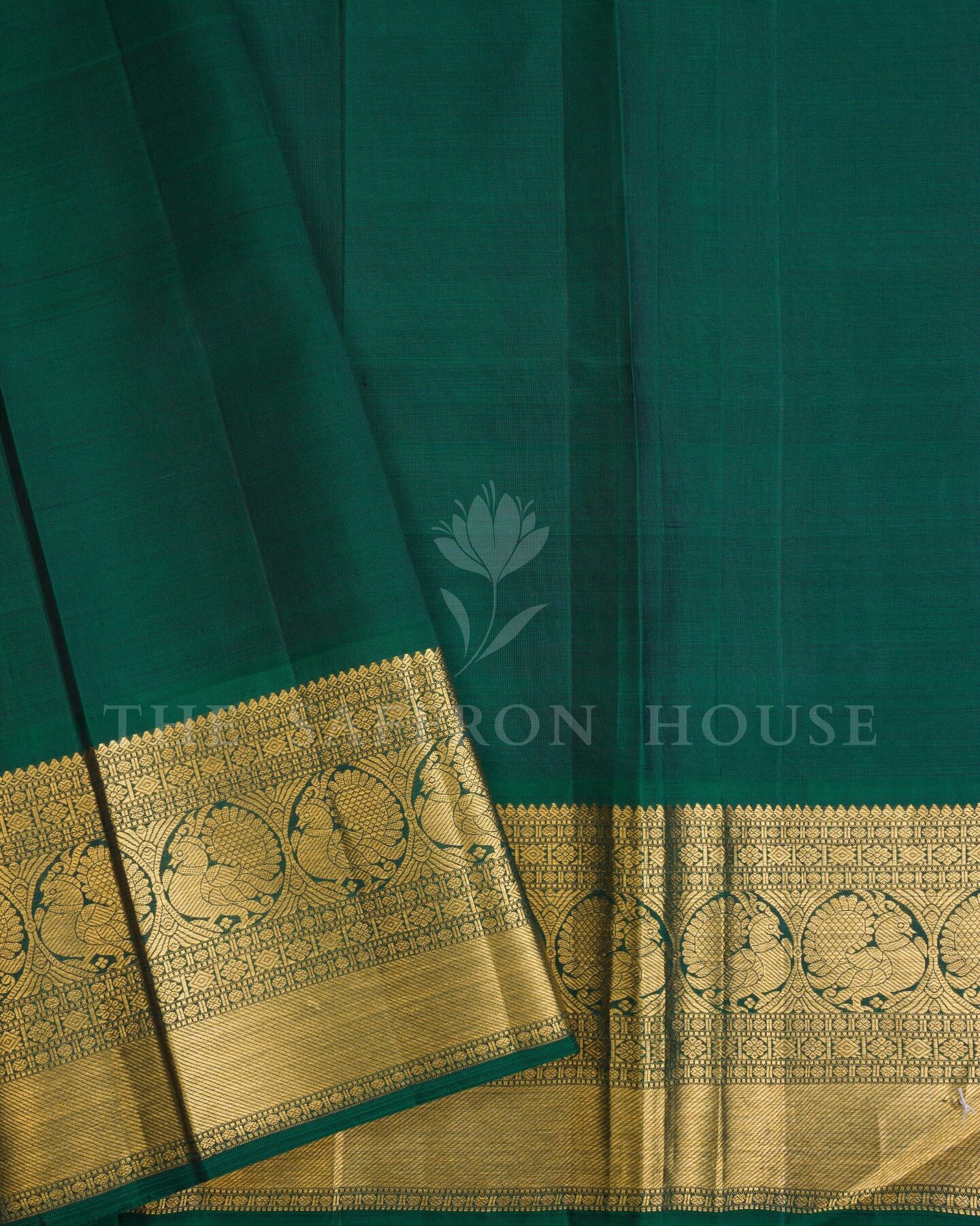 The body is woven with intricate traditional motifs, each thread placed with precision and purpose. A richly woven border frames the drape with confident definition, while gold zari runs through the weave, catching light the way temple gold does — slowly, deeply, unforgettably.