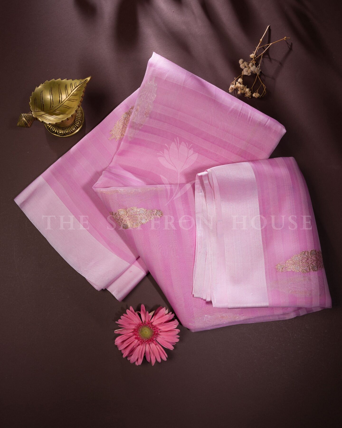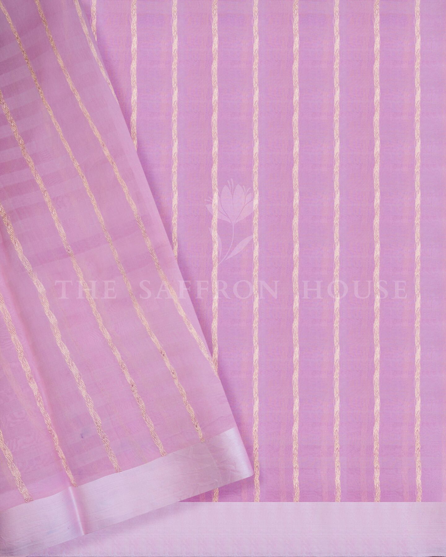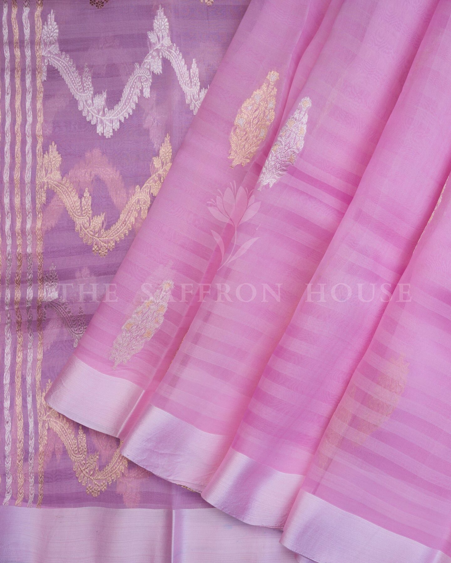 There is something about the interplay of pink and lilac that feels both ancient and alive. This Kora Kanjivaram silk saree opens with soft and luminous as rose petals, its surface shimmering with the unhurried rhythm of the loom.