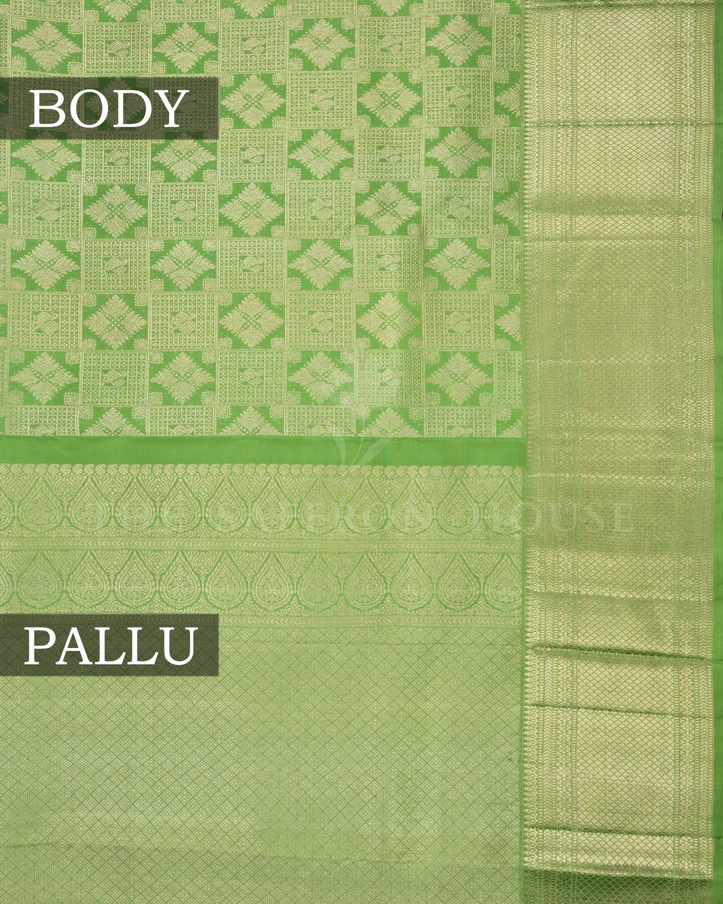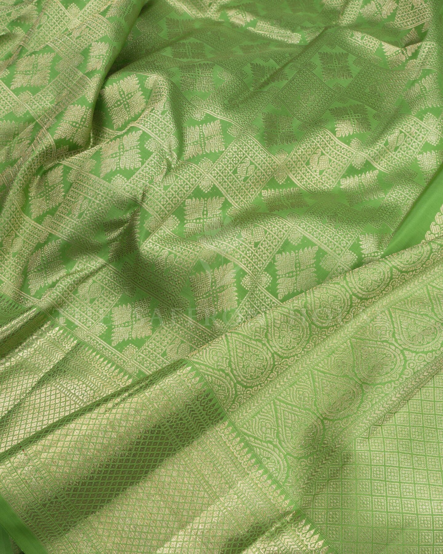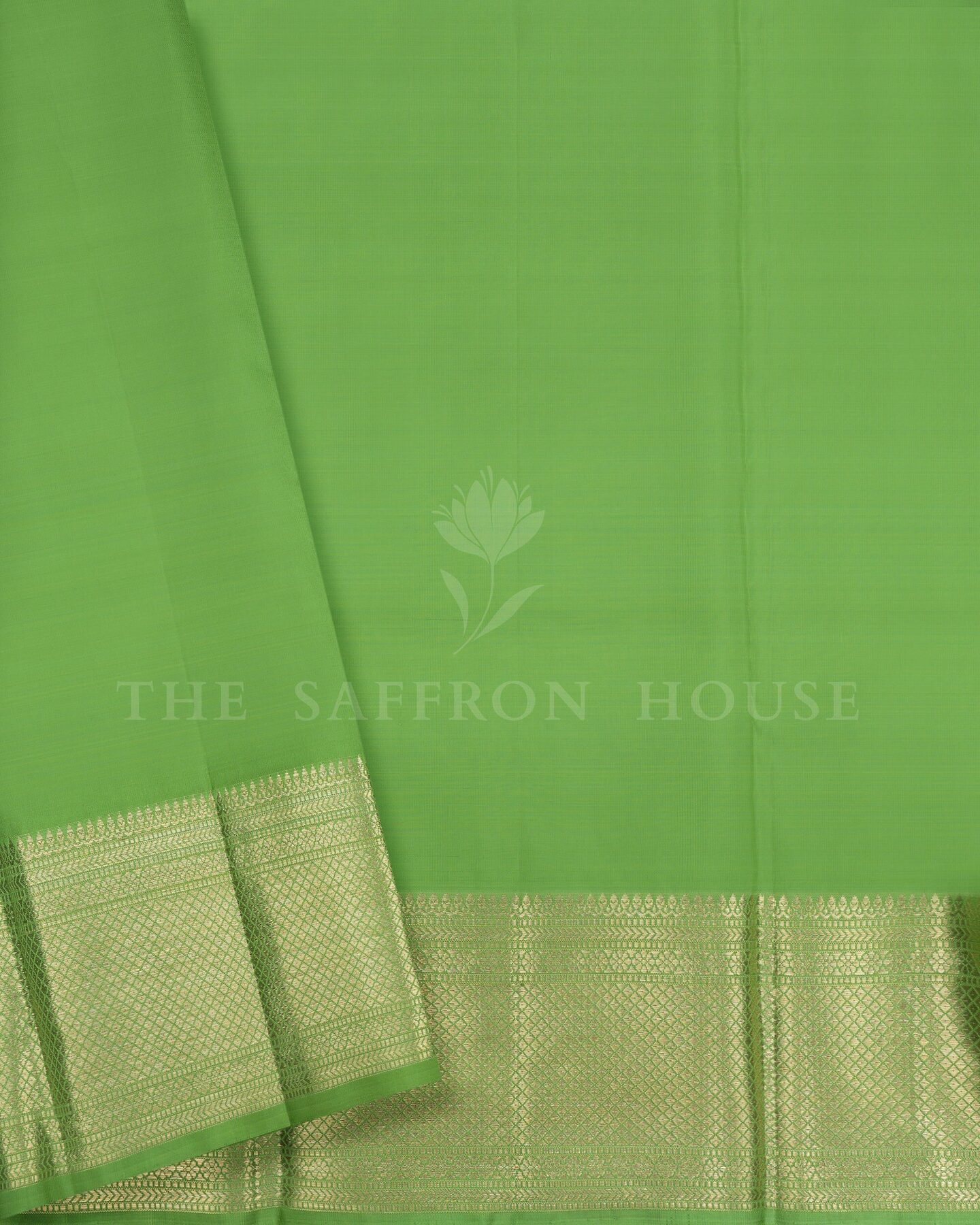 Some colours hold memory. Parrot Green — radiant in its own quiet way — becomes something entirely new when woven into pure Kanjivaram silk. This Brocade saree carries that colour with quiet authority and grace.