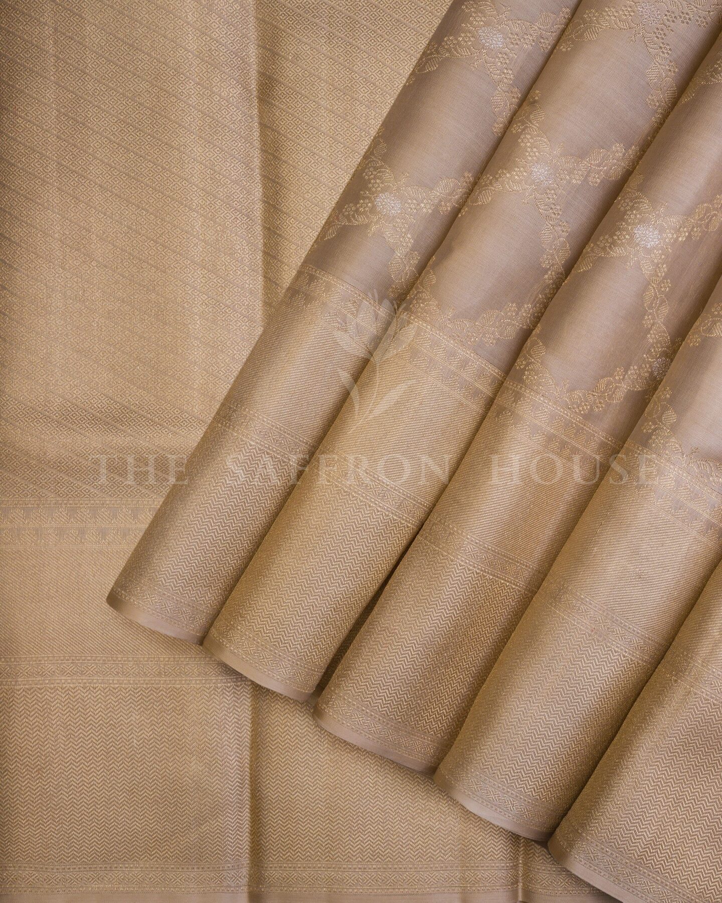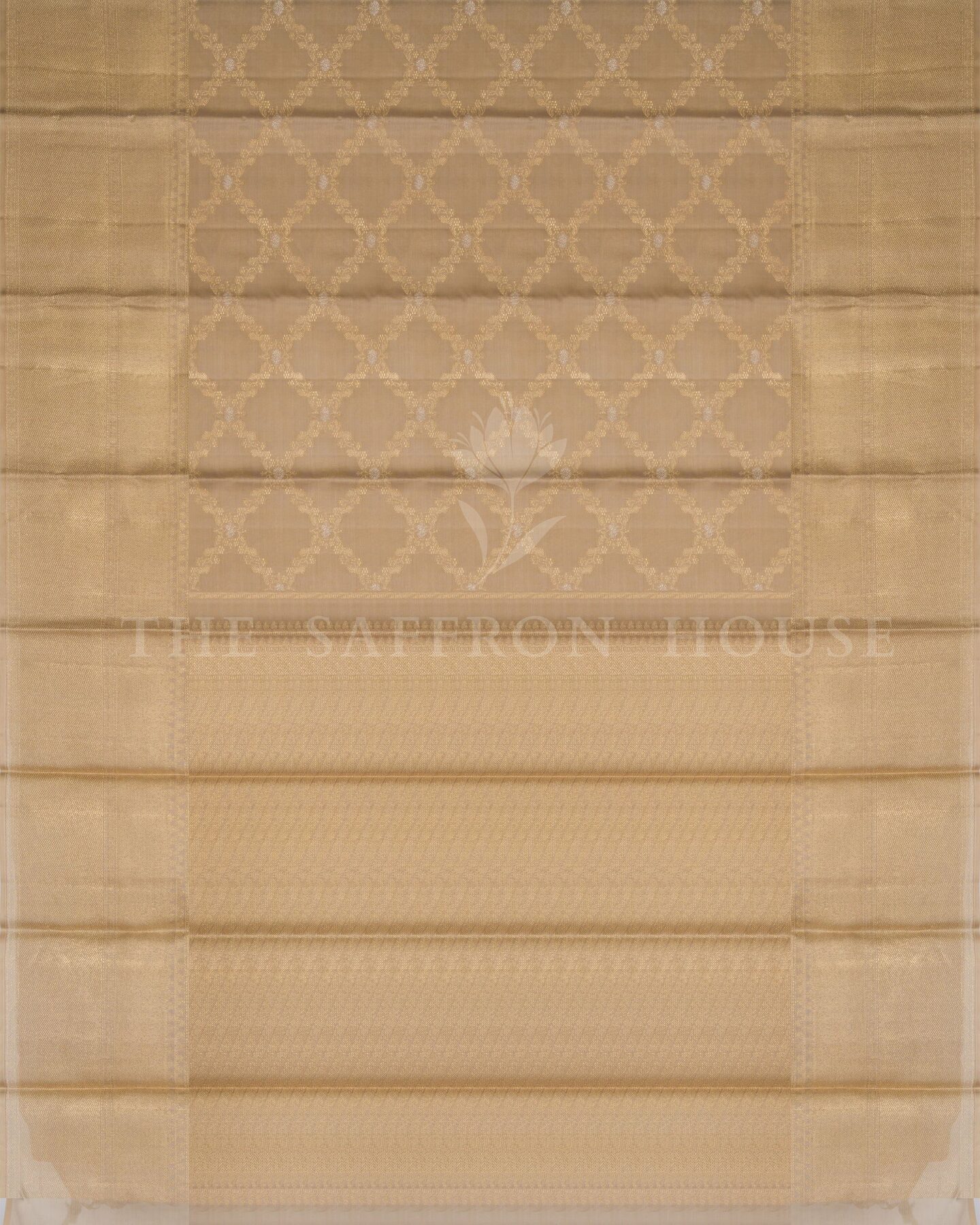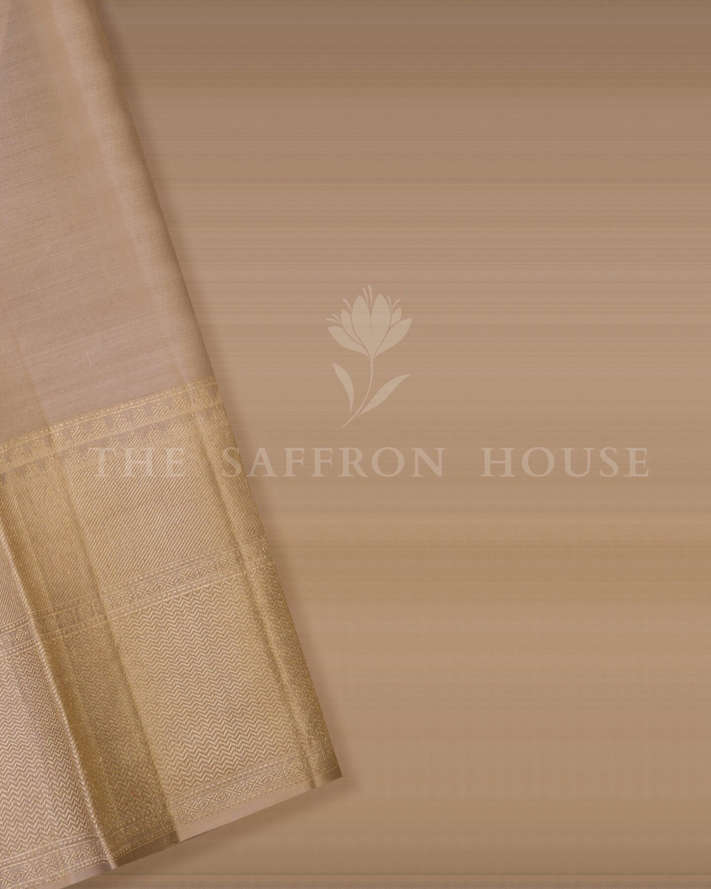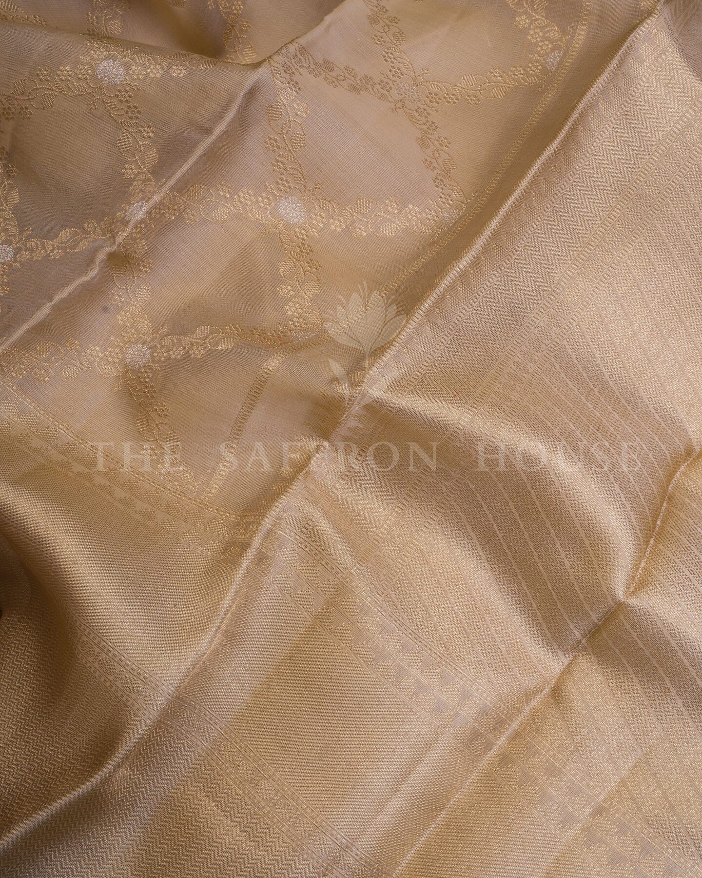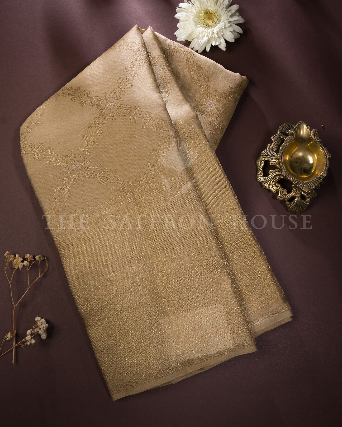 Some colours hold memory. Gold — luminous as temple gold at dusk — becomes something entirely new when woven into pure Kanjivaram silk. This Kora saree carries that colour with quiet authority and grace.