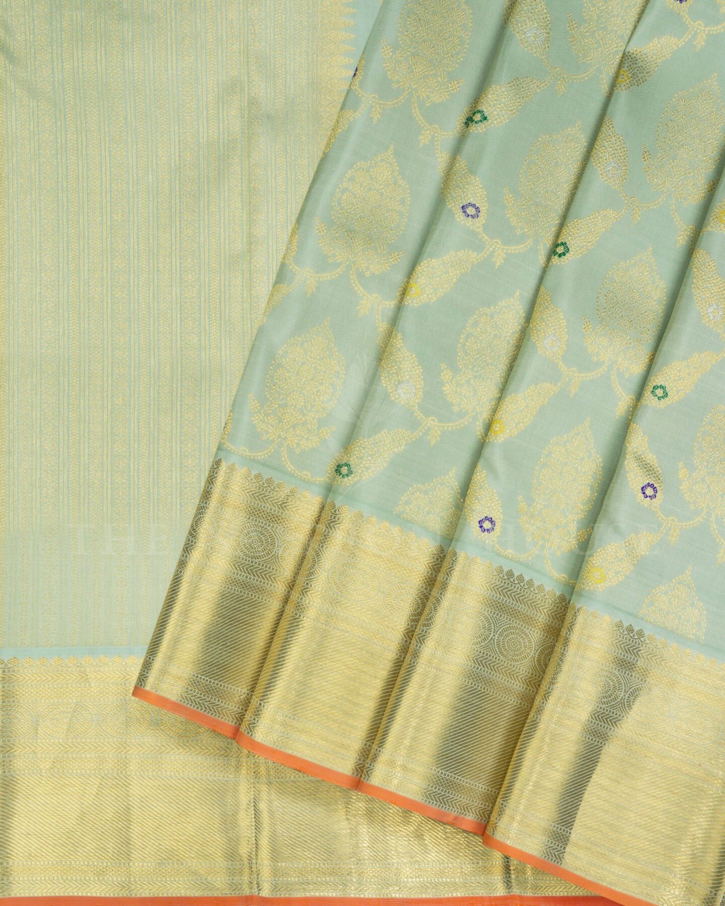 The body is adorned with meenakari jal design, each thread placed with precision and purpose. The mint green border frames the drape with confident definition, while silver and gold zari runs through the weave, catching light the way temple gold does — slowly, deeply, unforgettably.