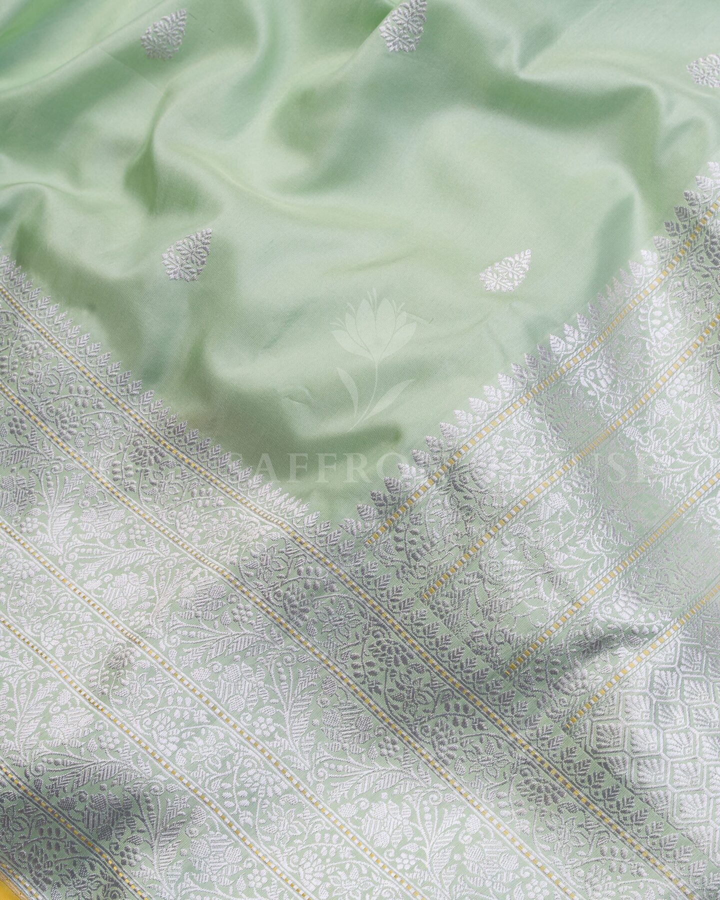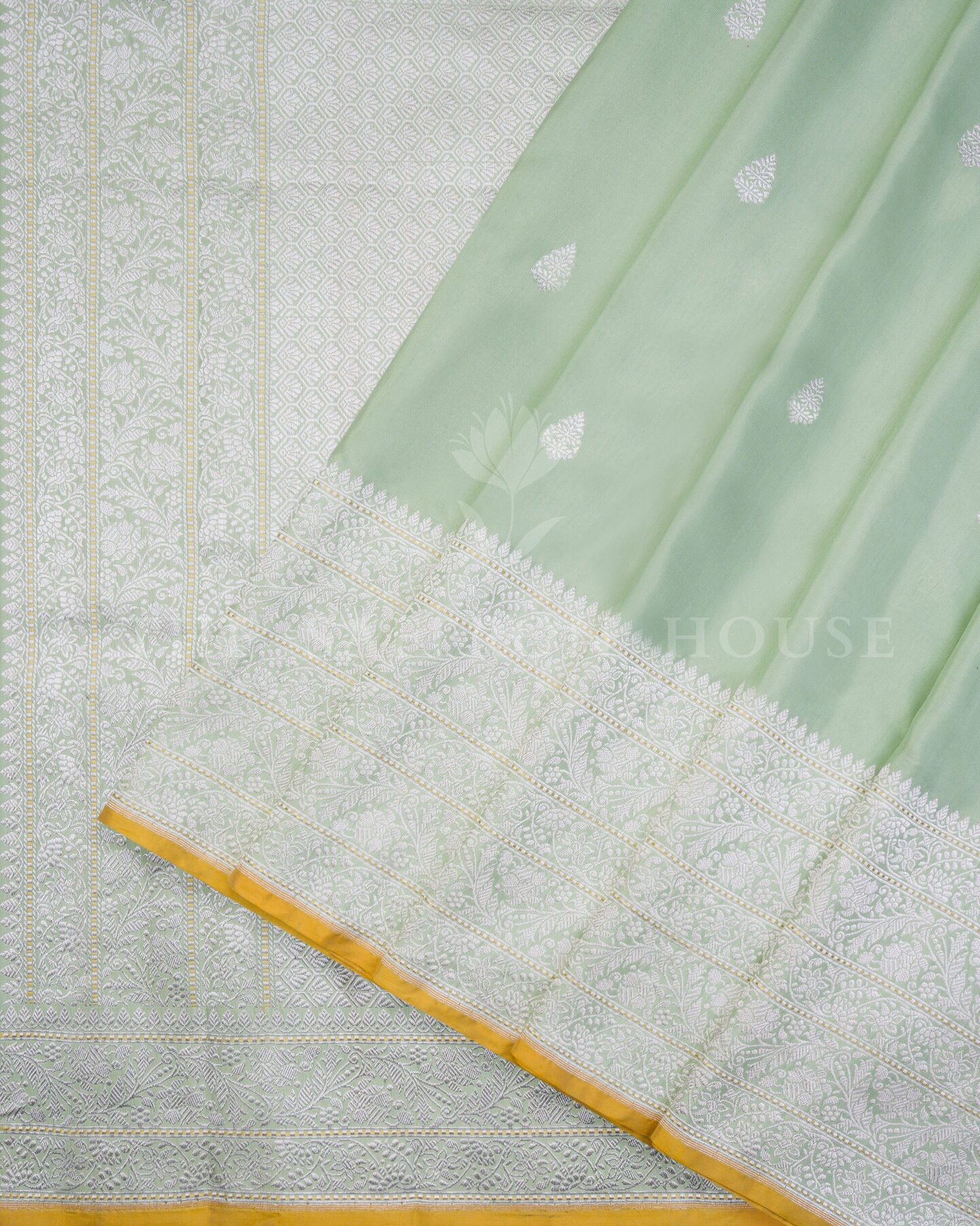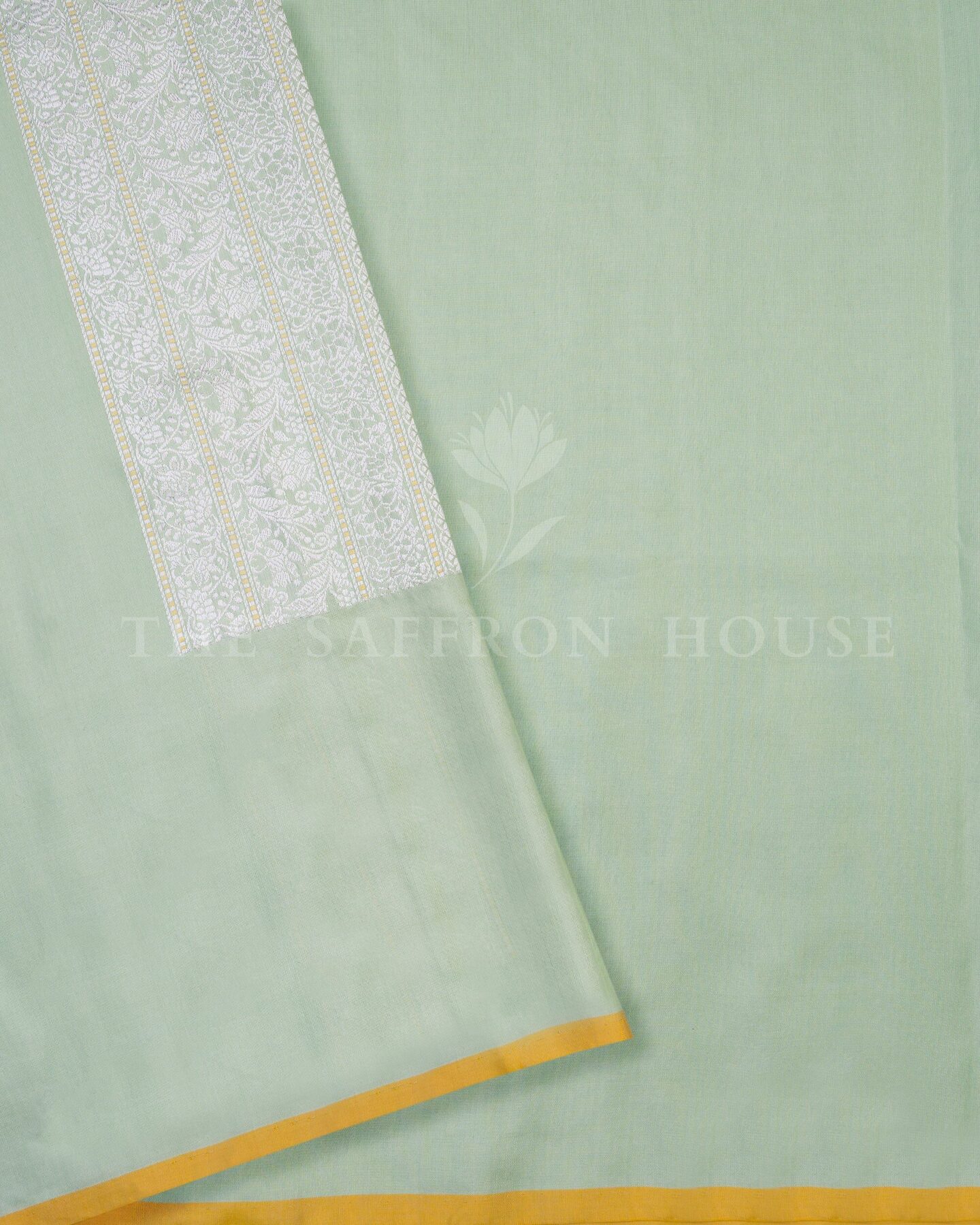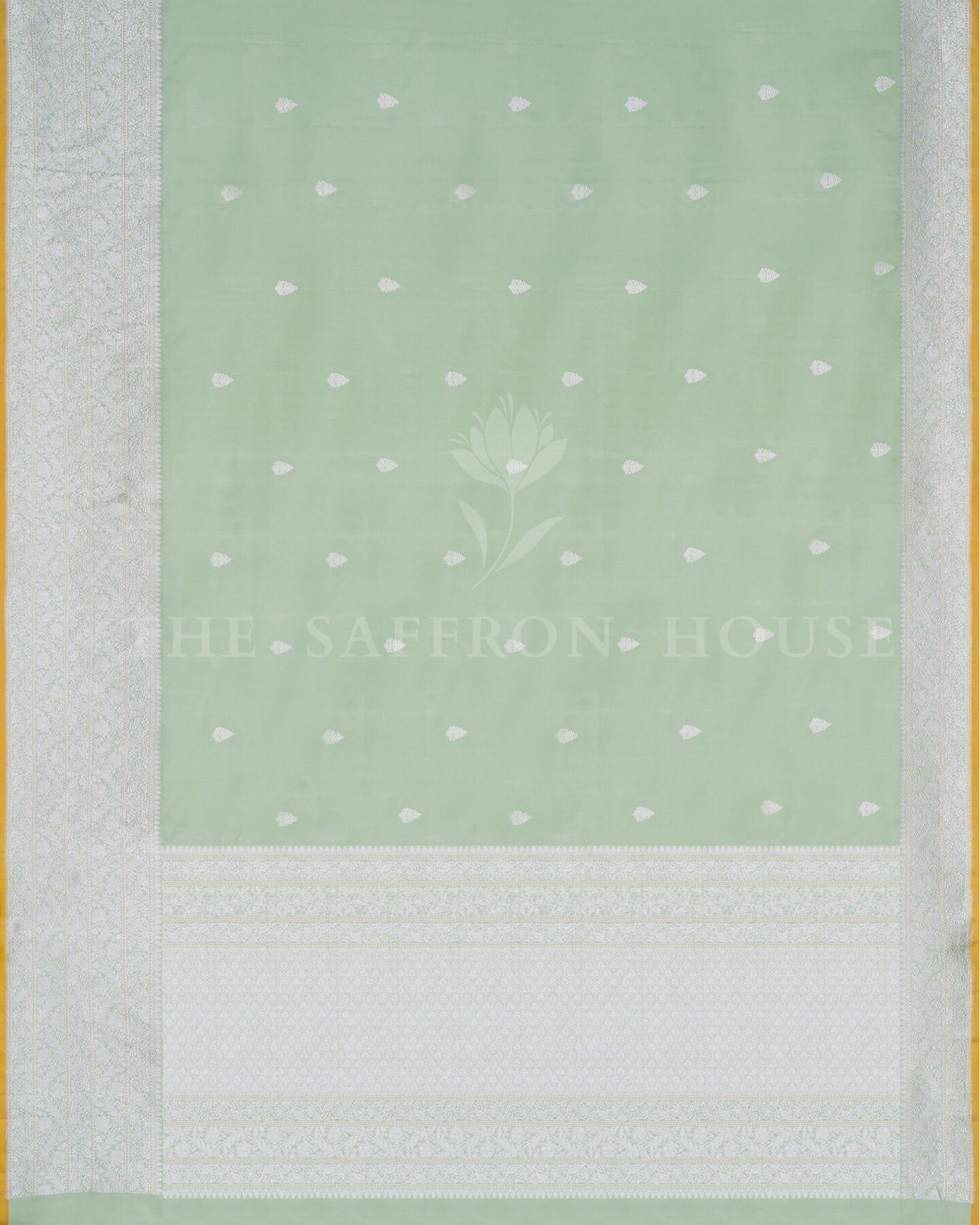 There is something about the interplay of mustard and mint that feels both ancient and alive. This Jaal Kanjivaram silk saree opens with radiant in its own quiet way, its surface shimmering with the unhurried rhythm of the loom.