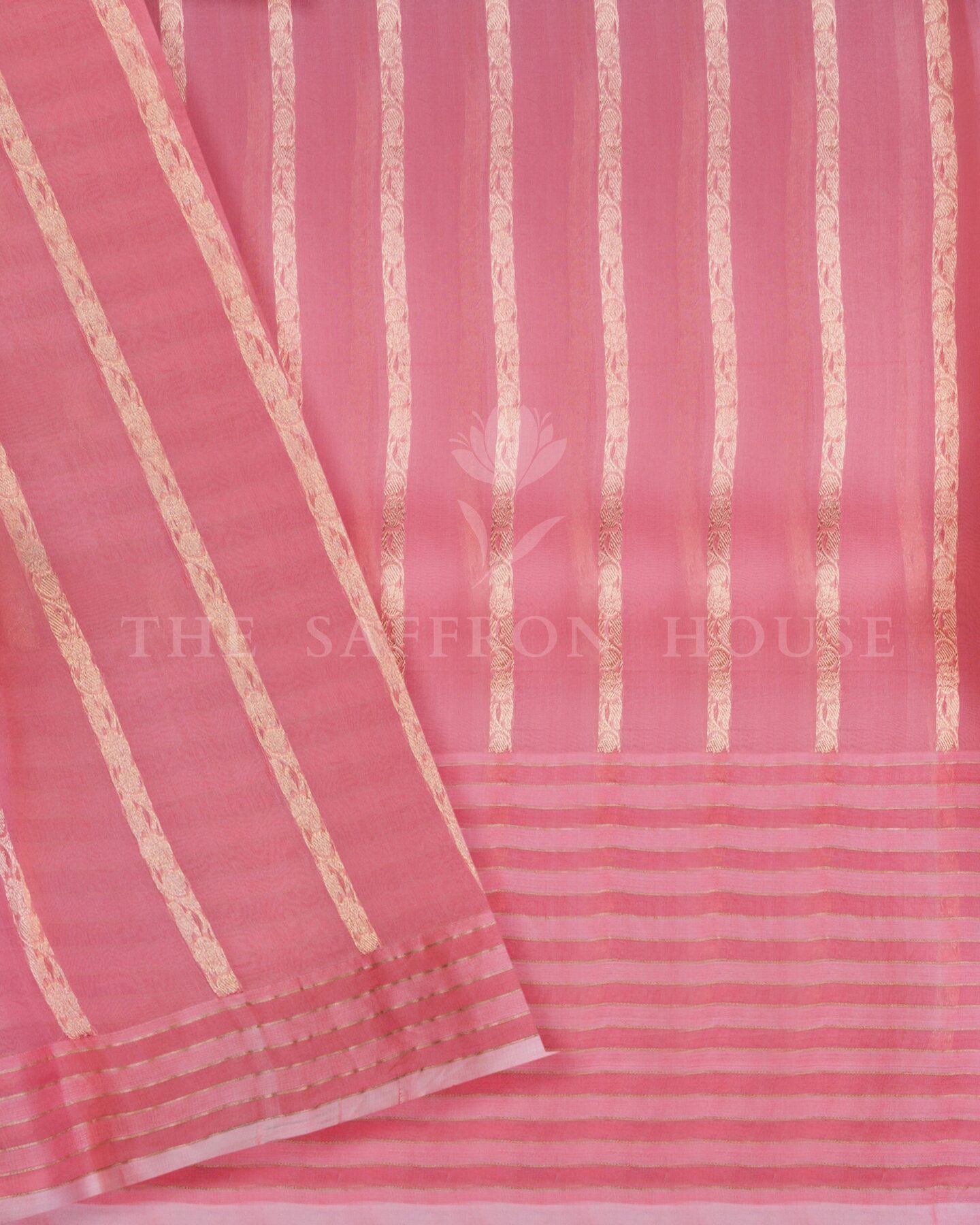 There is something about the interplay of pink and pastels that feels both ancient and alive. This Kora Kanjivaram silk saree opens with soft and luminous as rose petals, its surface shimmering with the unhurried rhythm of the loom.