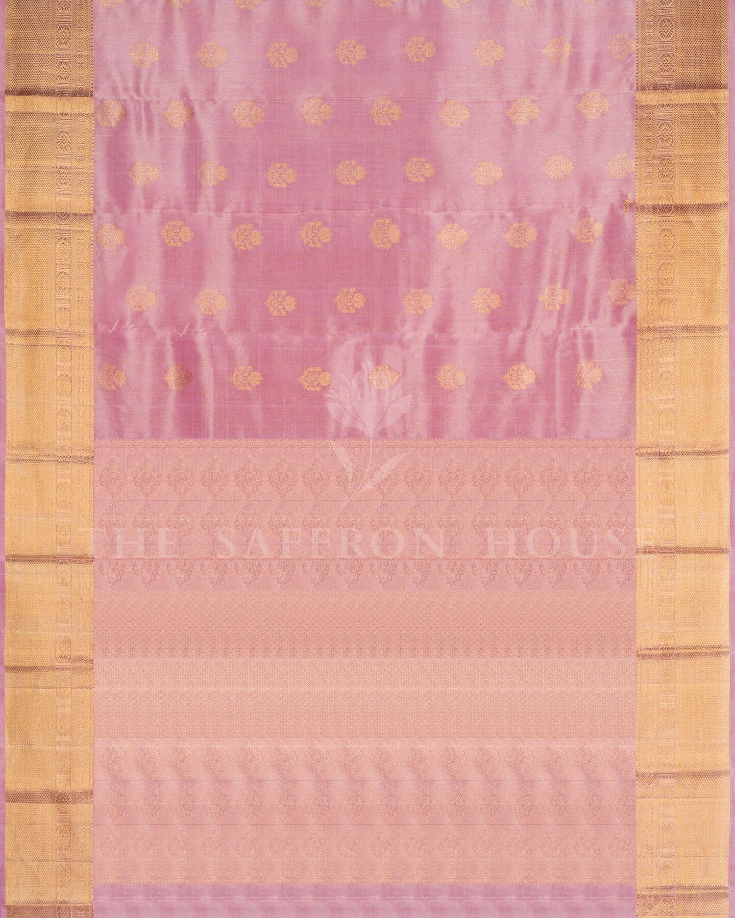 The body is woven with intricate traditional motifs, each thread placed with precision and purpose. A richly woven border frames the drape with confident definition, while gold zari runs through the weave, catching light the way temple gold does — slowly, deeply, unforgettably.
