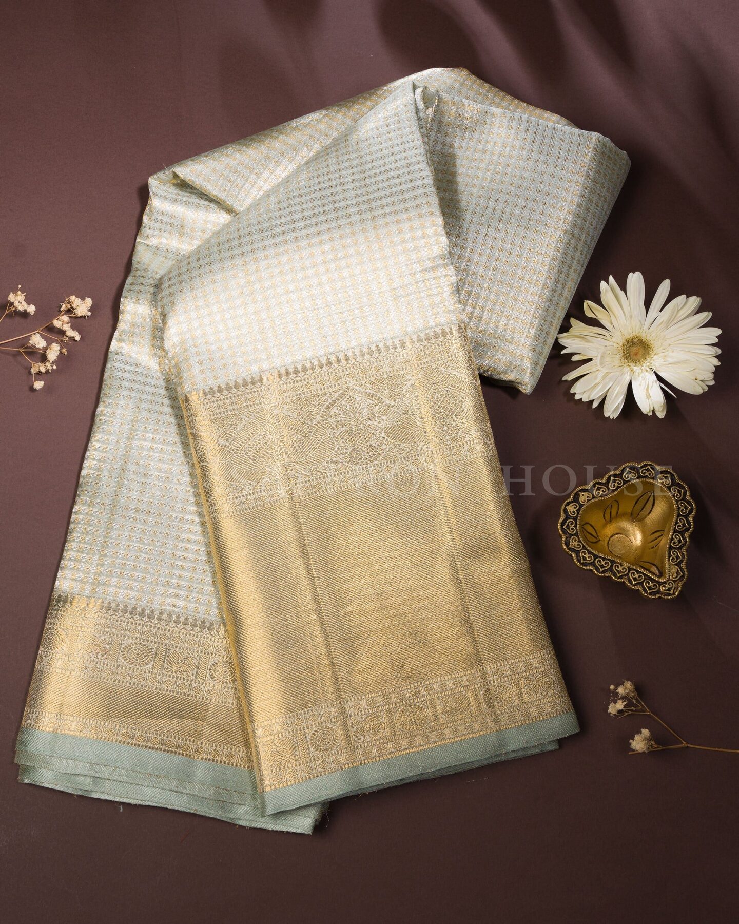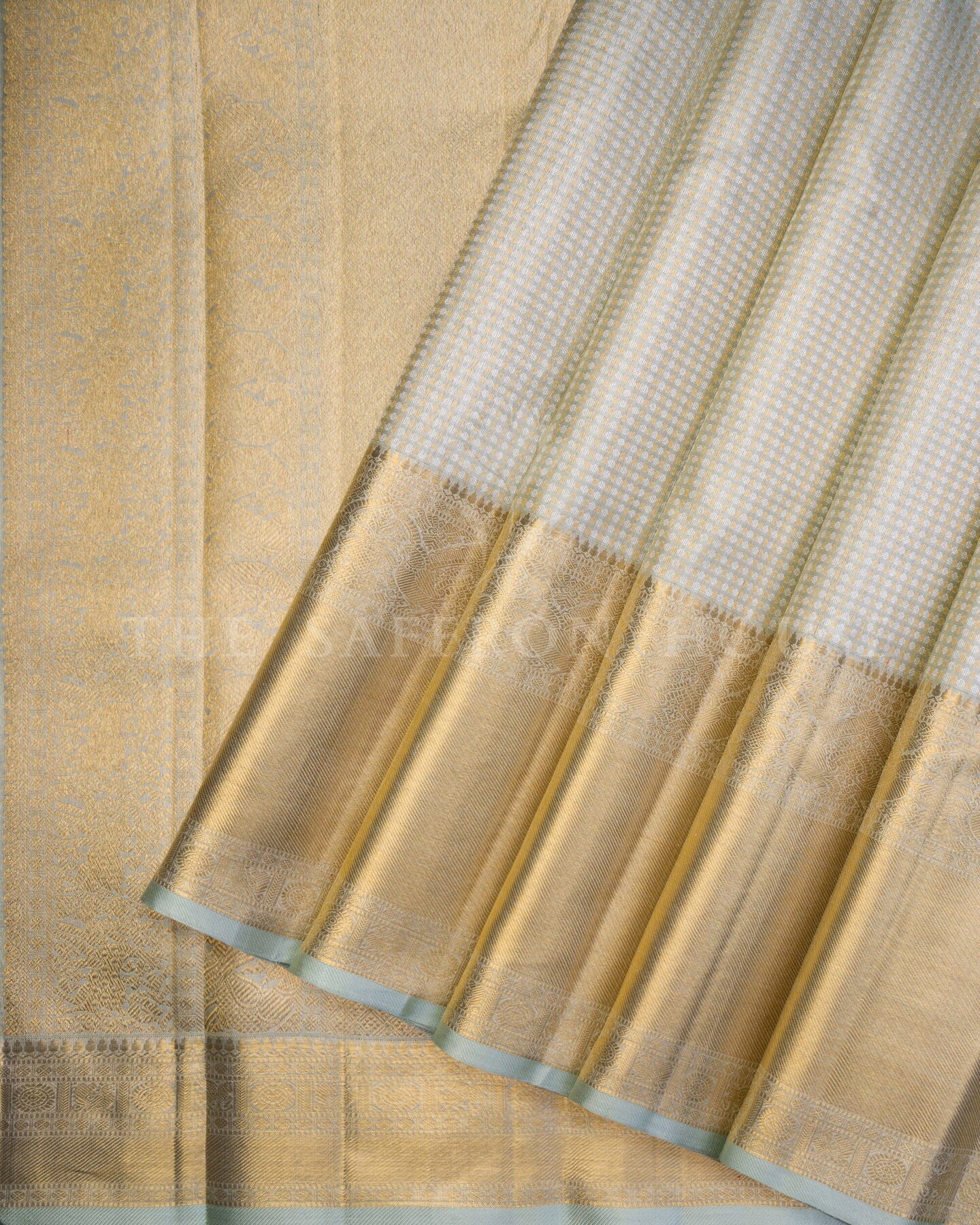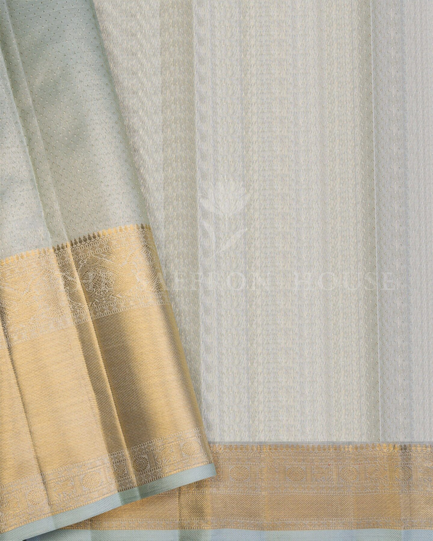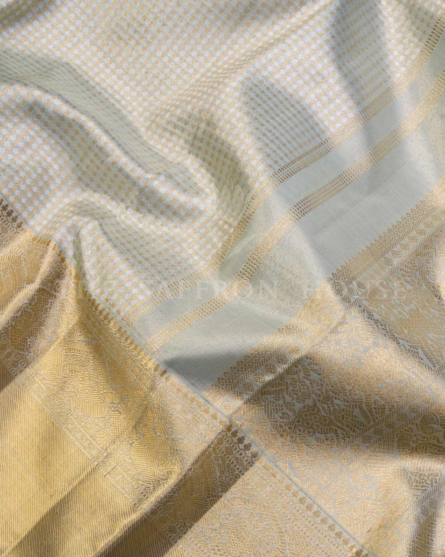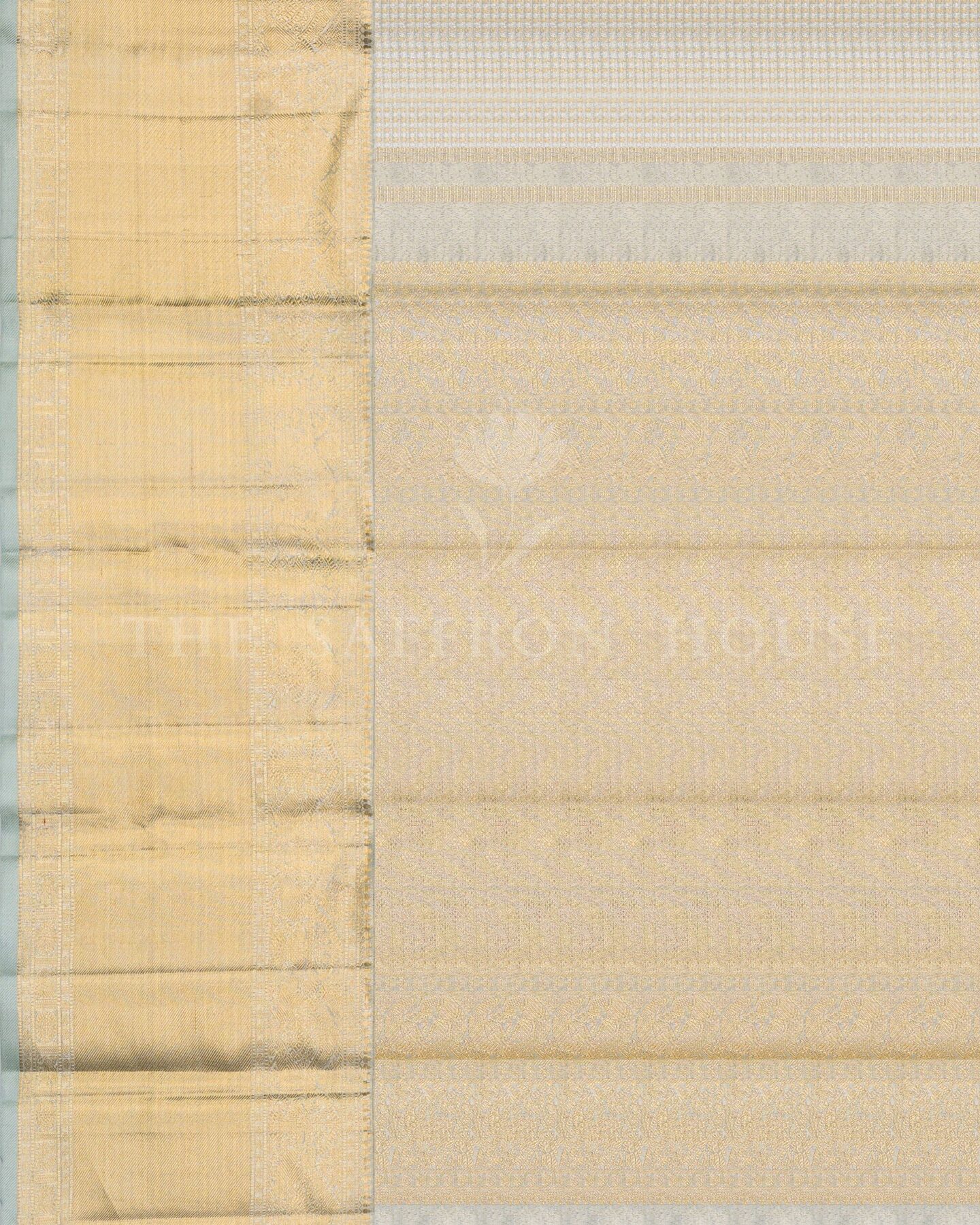 Some colours hold memory. Pista Green — radiant in its own quiet way — becomes something entirely new when woven into pure Kanjivaram silk. This Kattam saree carries that colour with quiet authority and grace.
