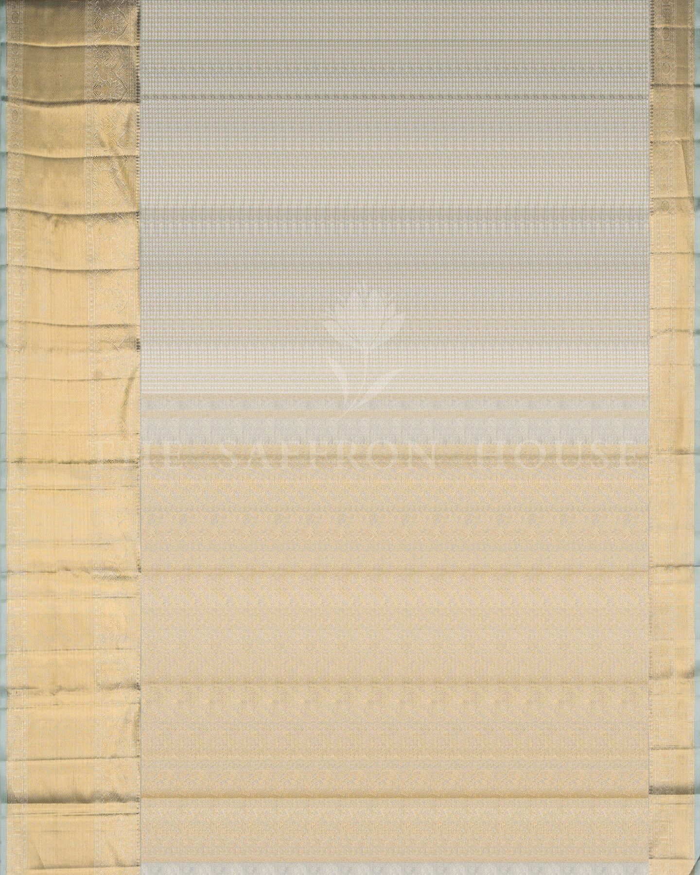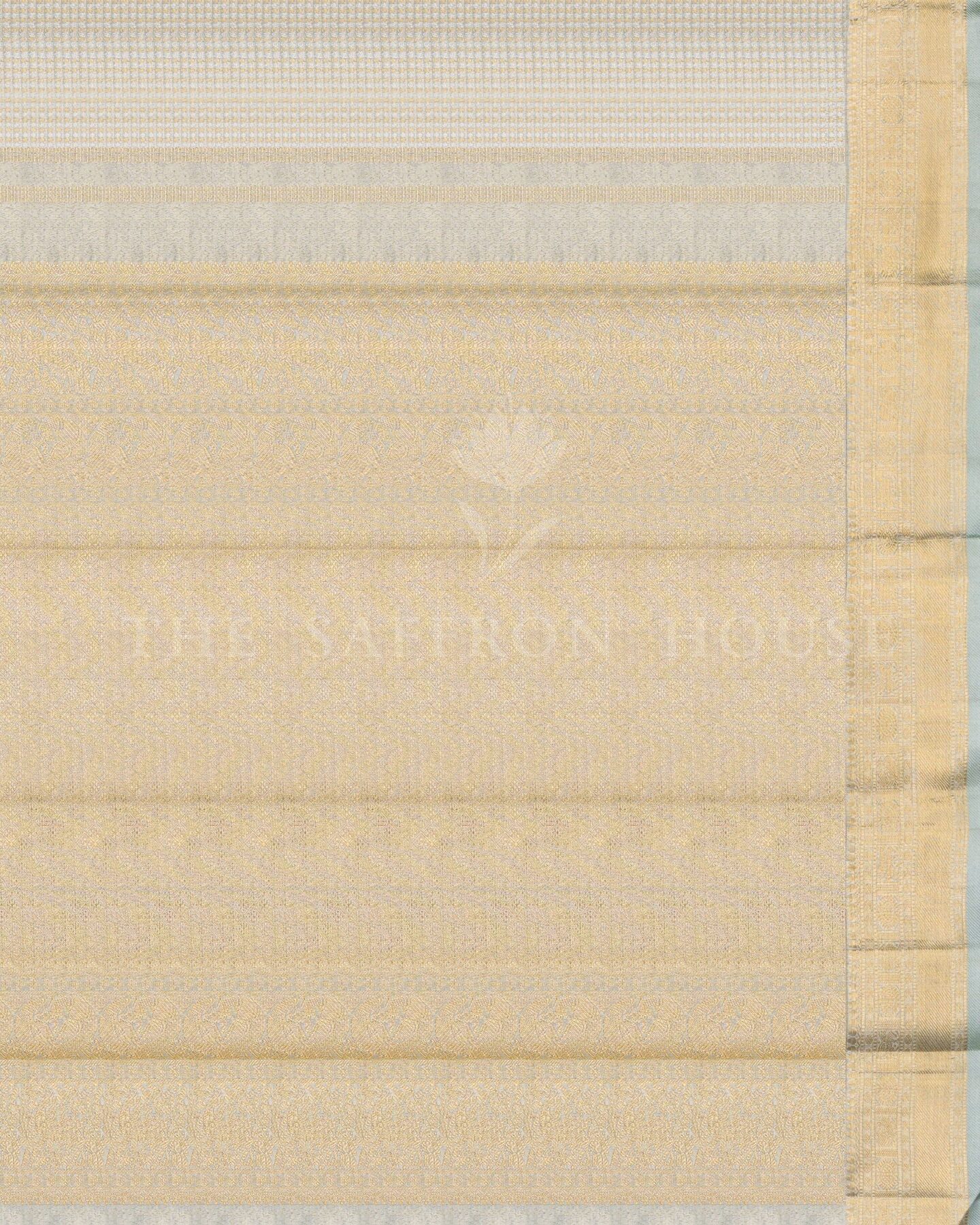 The body is woven with intricate traditional motifs, each thread placed with precision and purpose. A richly woven border frames the drape with confident definition, while silver and gold zari runs through the weave, catching light the way temple gold does — slowly, deeply, unforgettably.