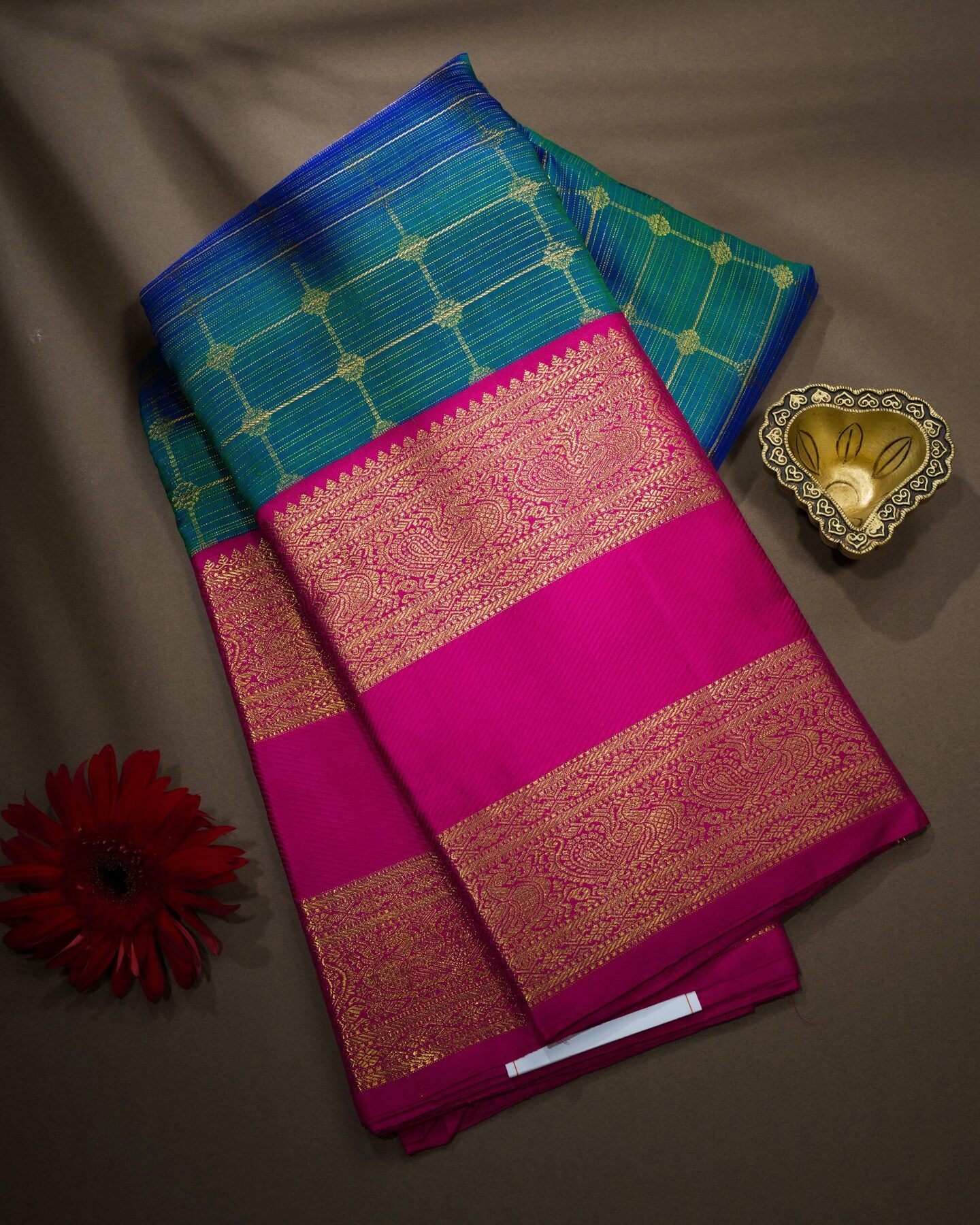 There is something about the interplay of peacock blue and pink that feels both ancient and alive. This Kattam Kanjivaram silk saree opens with shimmering like a peacock's iridescent plume, its surface shimmering with the unhurried rhythm of the loom.
