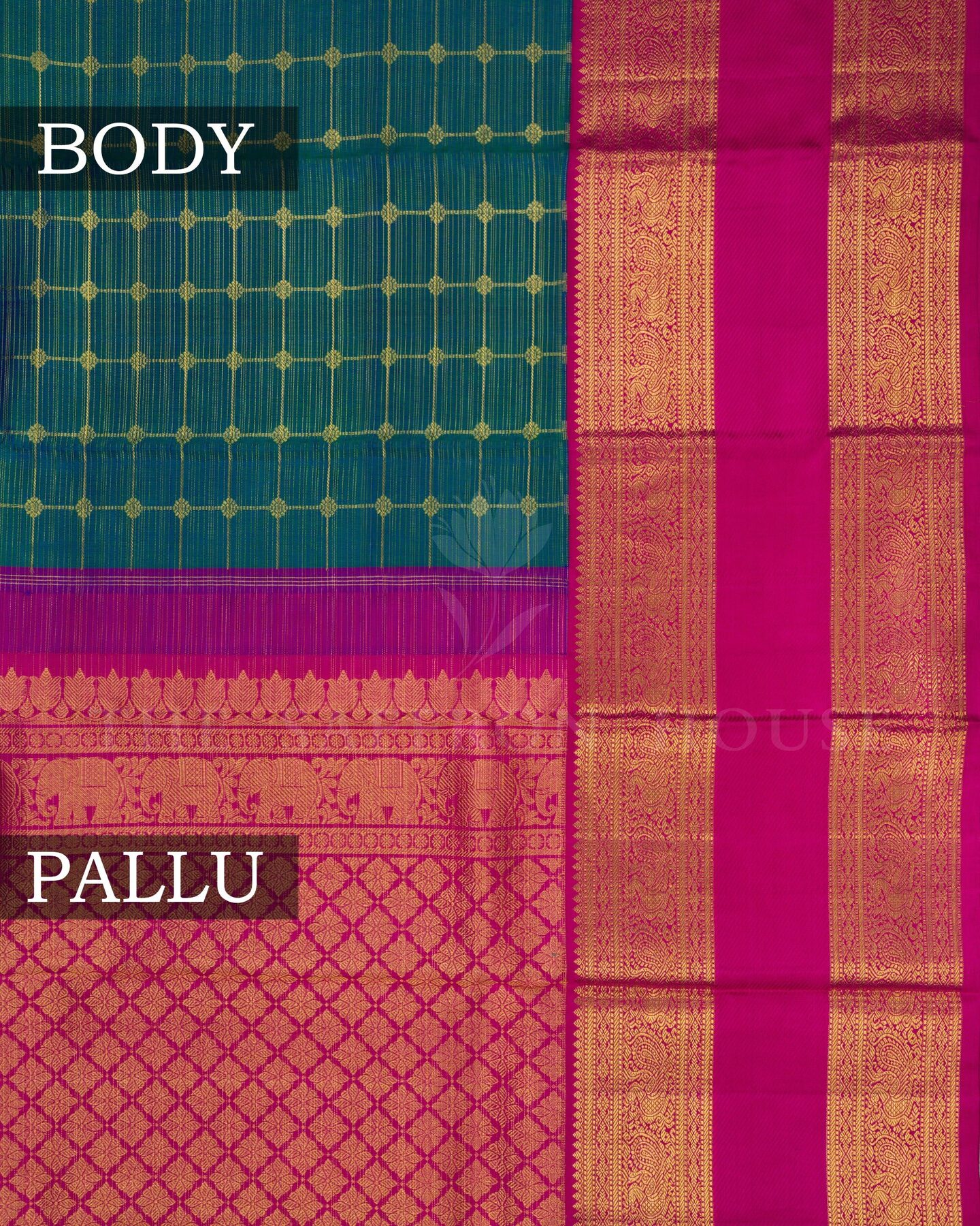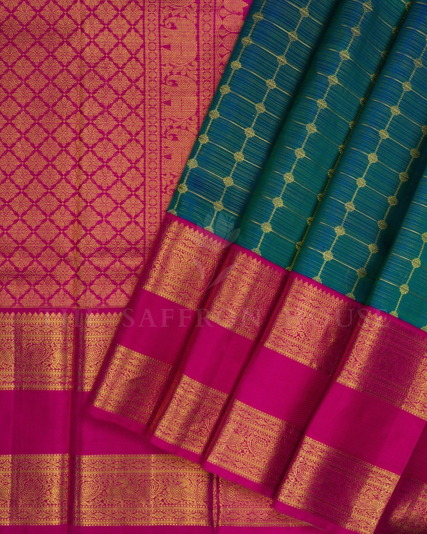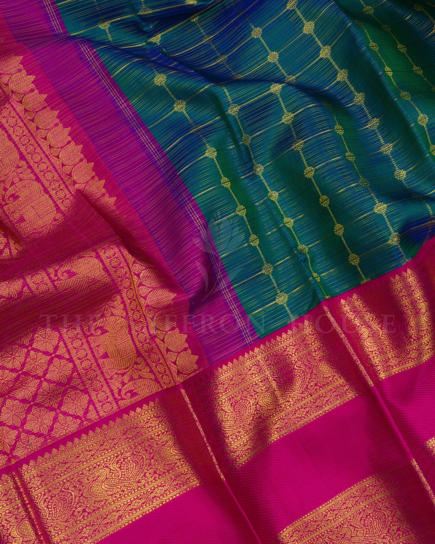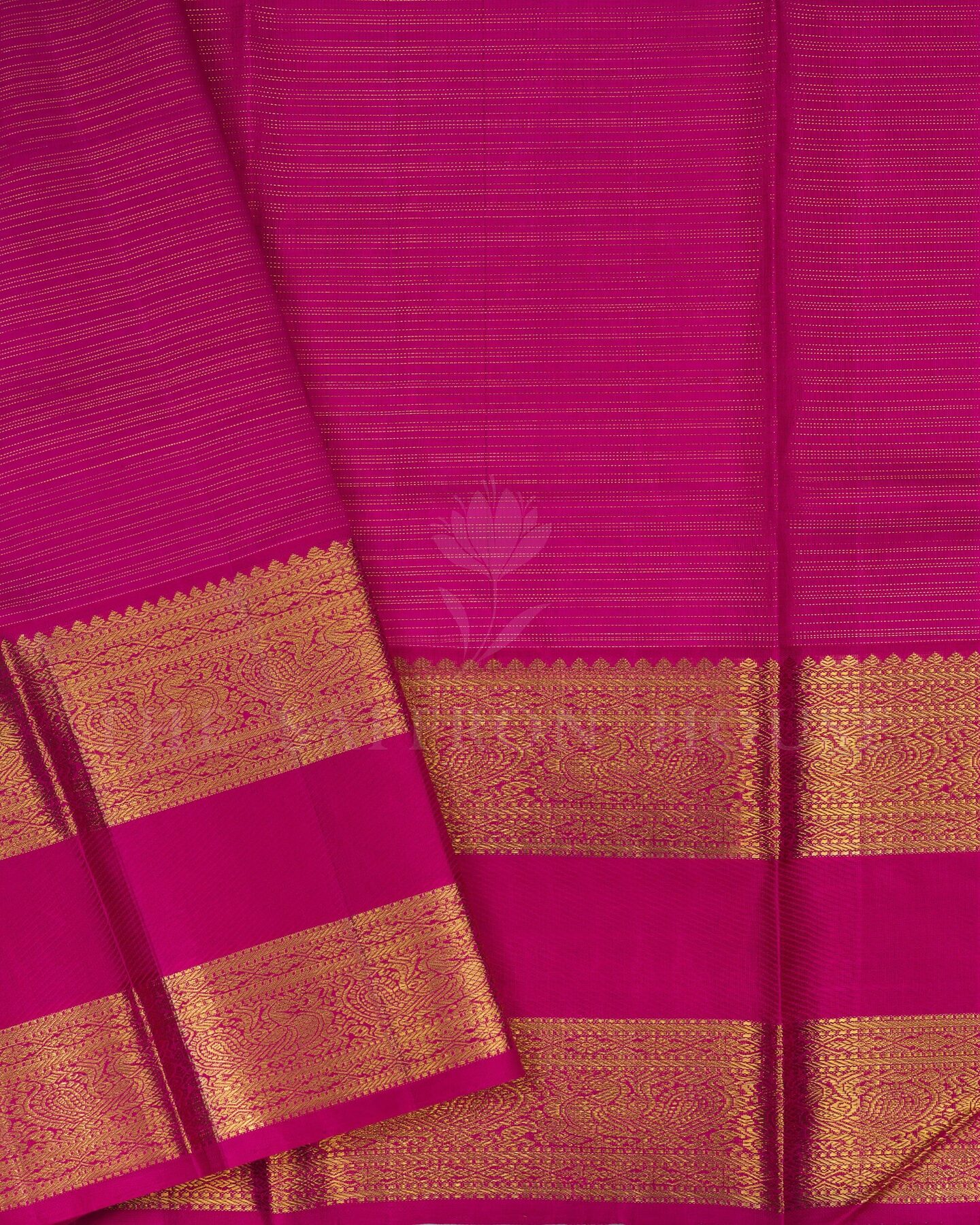 The body is adorned with vairaoosi with checks & motifs, each thread placed with precision and purpose. The dark pink border frames the drape with confident definition, while gold zari runs through the weave, catching light the way temple gold does — slowly, deeply, unforgettably.