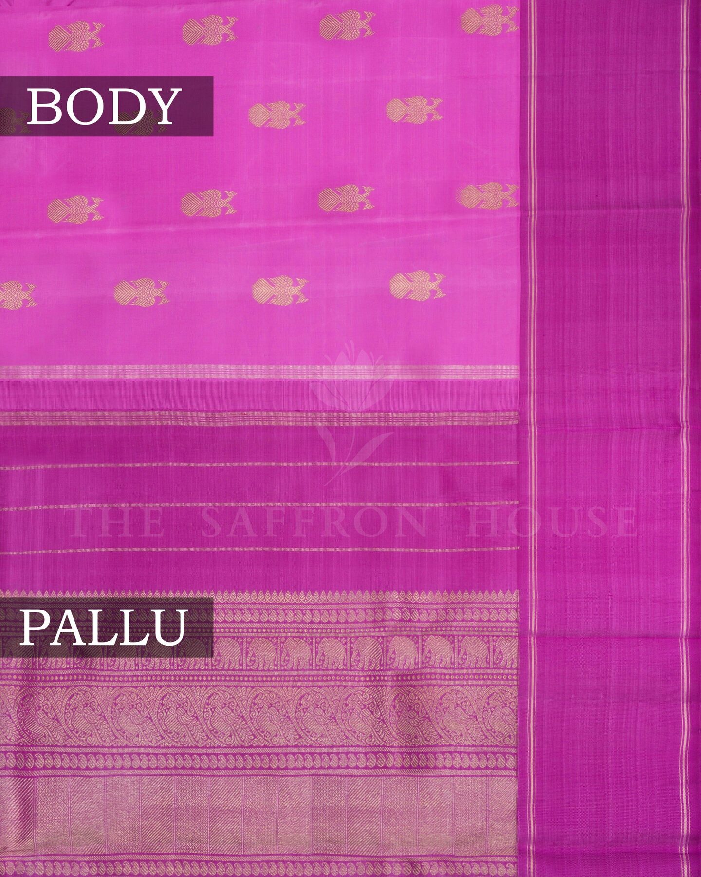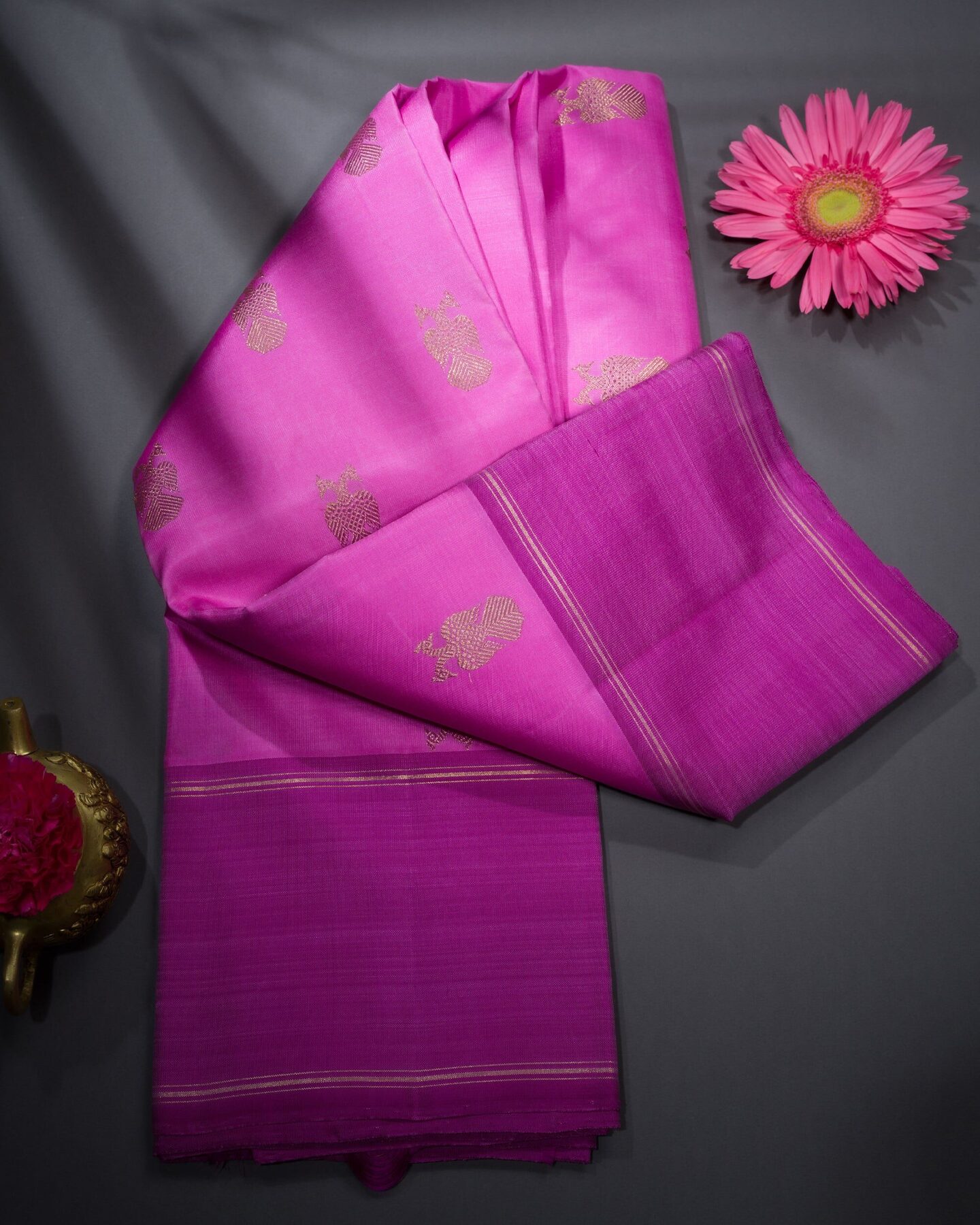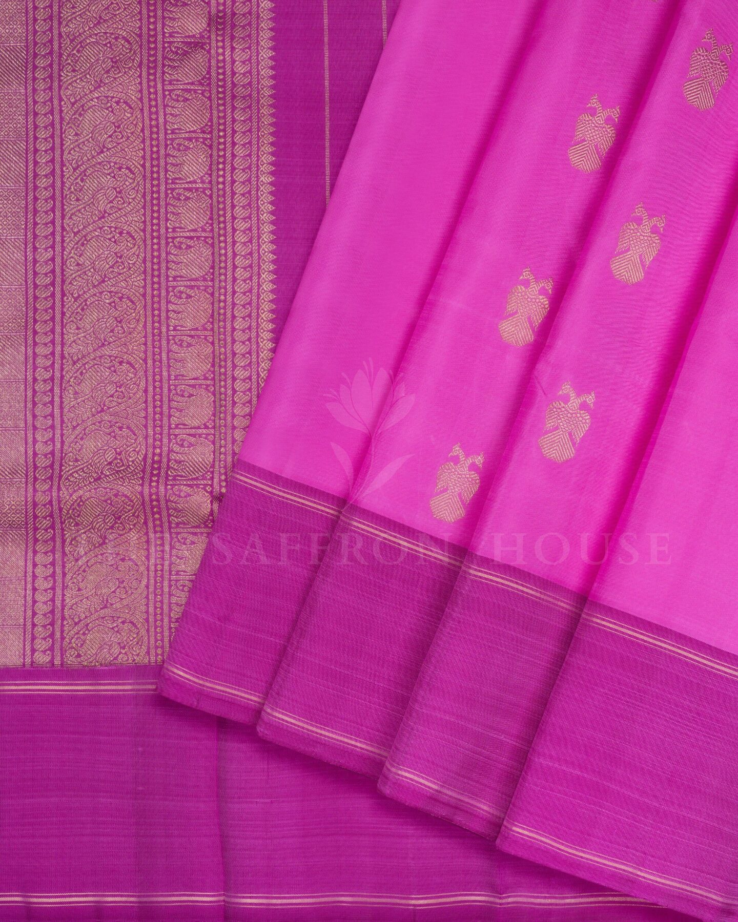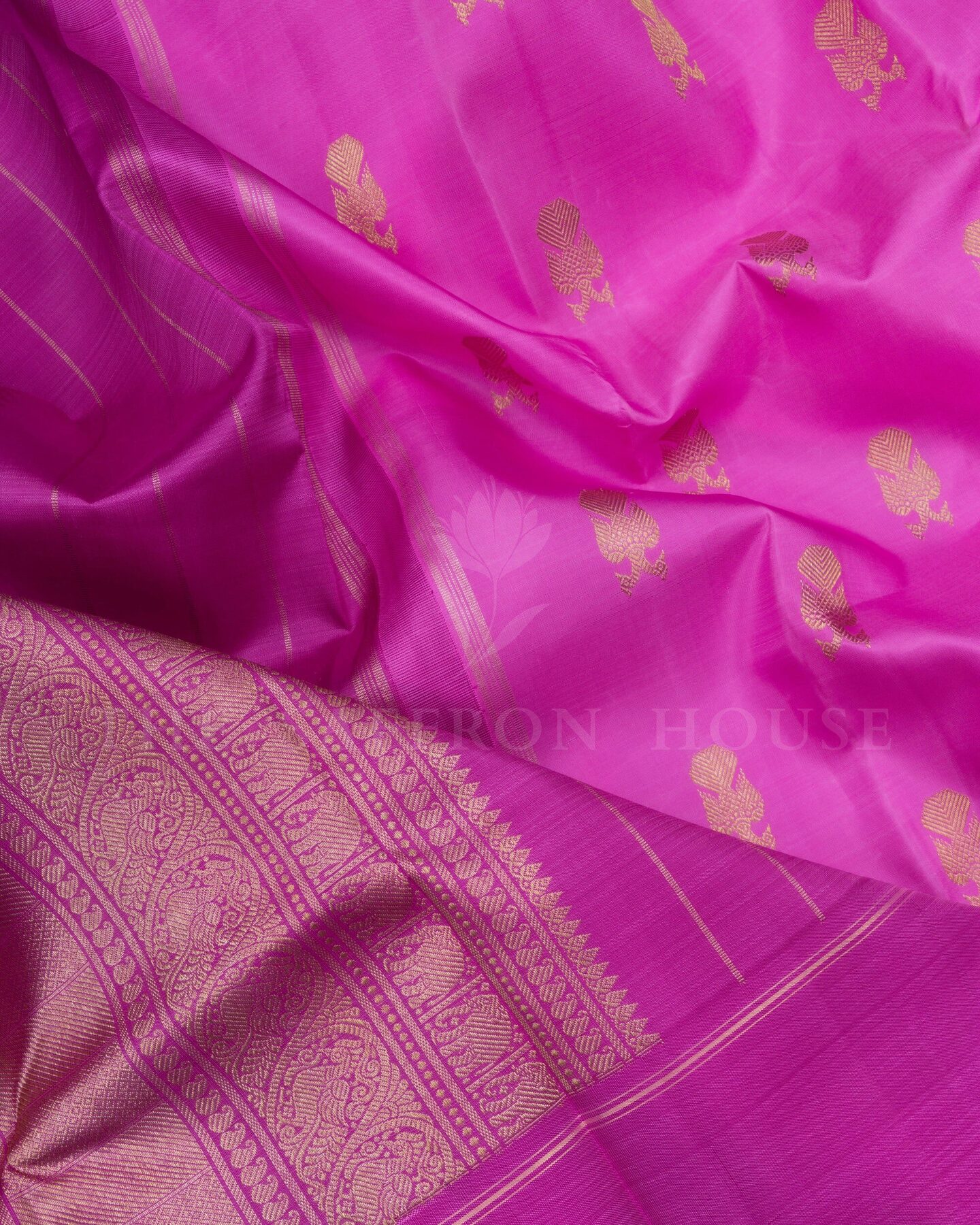 The body is adorned with gandaberunda motifs, each thread placed with precision and purpose. The dark pink border frames the drape with confident definition, while gold zari runs through the weave, catching light the way temple gold does — slowly, deeply, unforgettably.