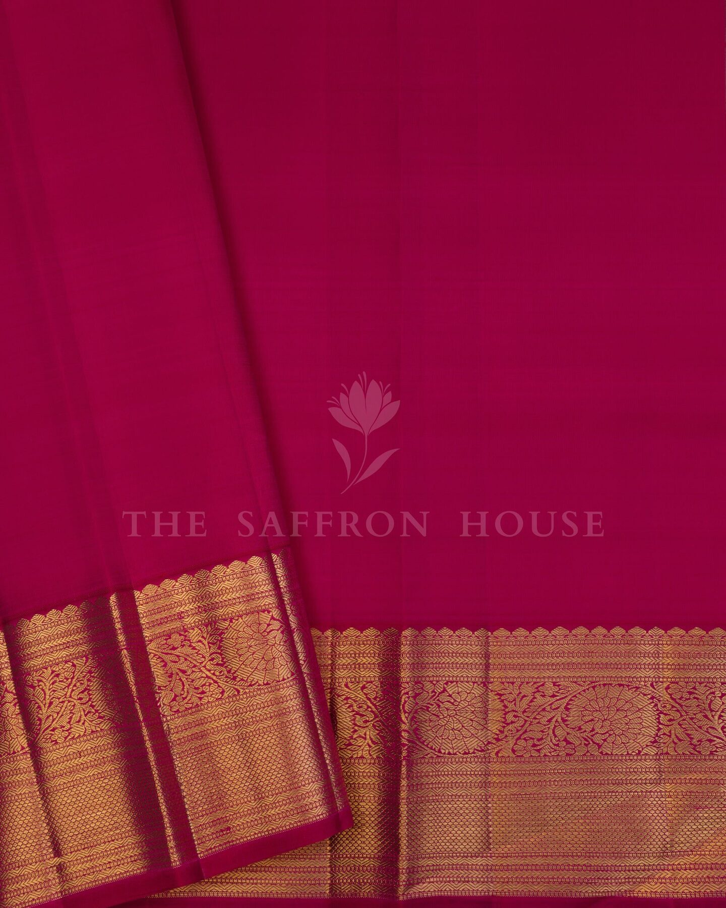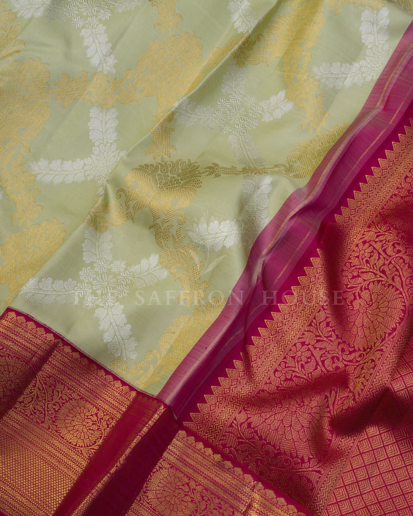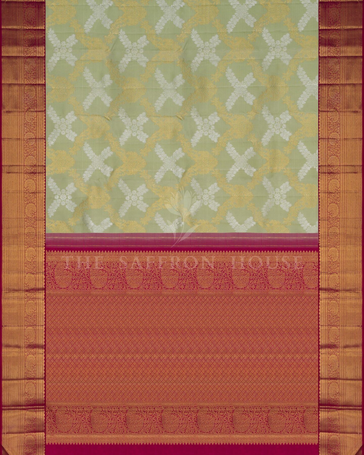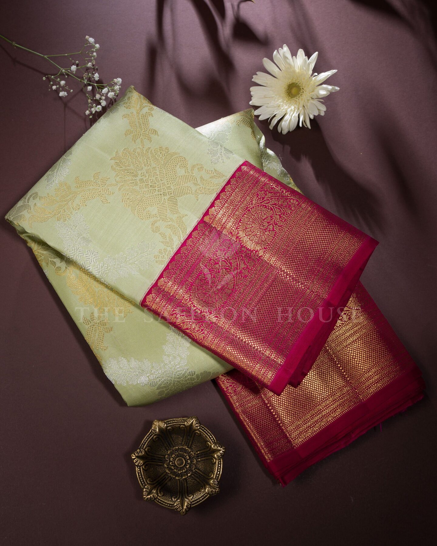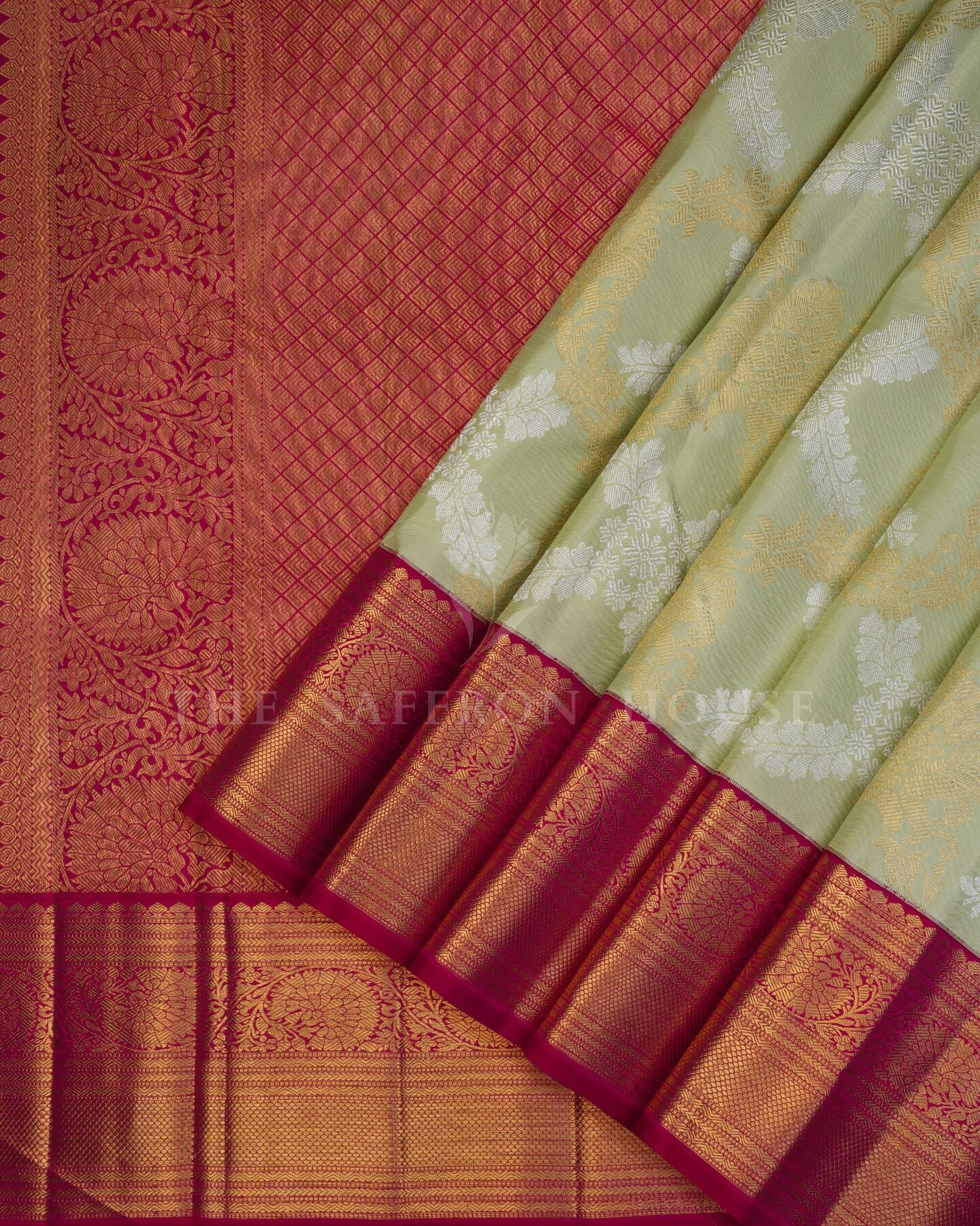 There is something about the interplay of pista green and maroon that feels both ancient and alive. This Handwoven Kanjivaram silk saree opens with radiant in its own quiet way, its surface shimmering with the unhurried rhythm of the loom.