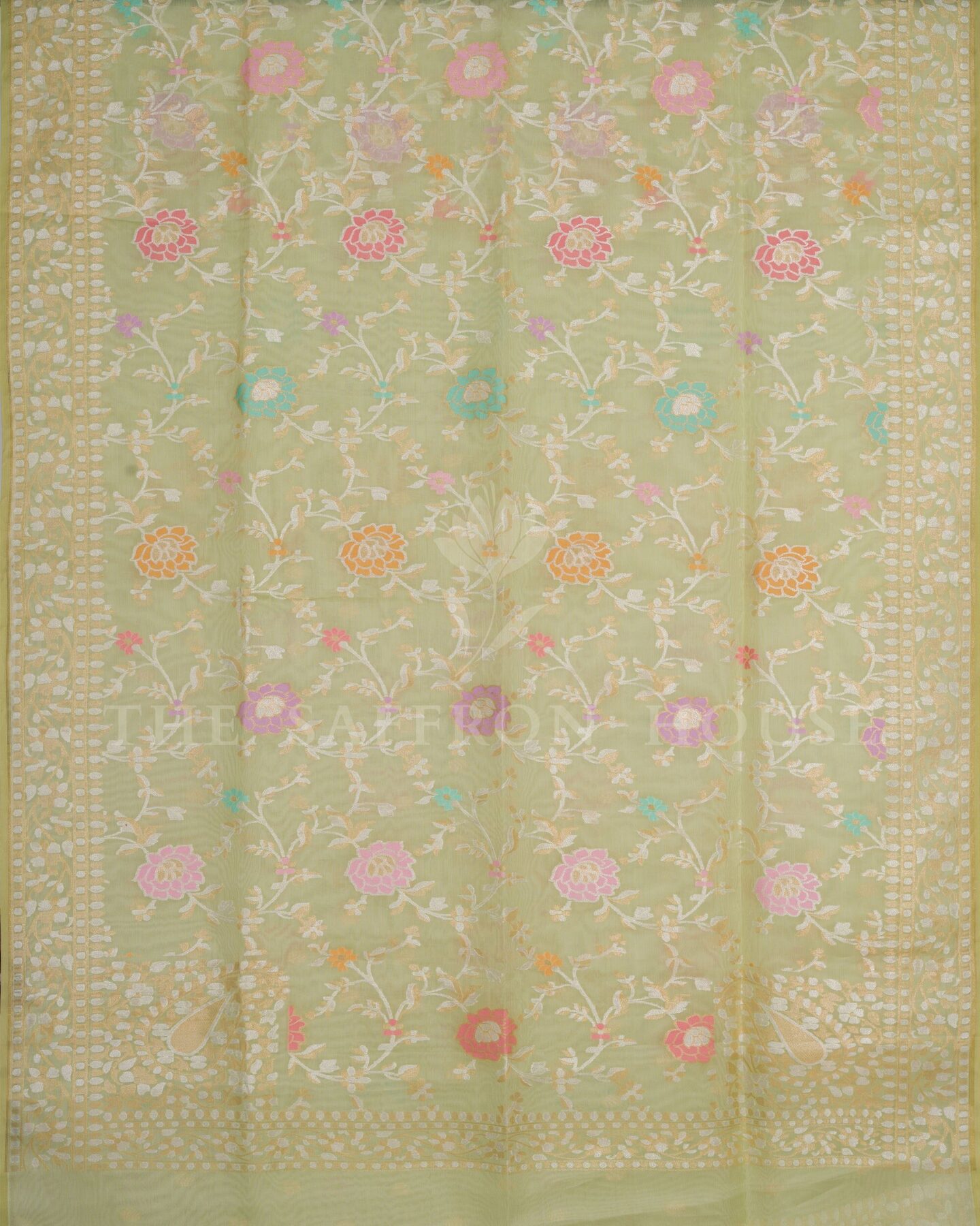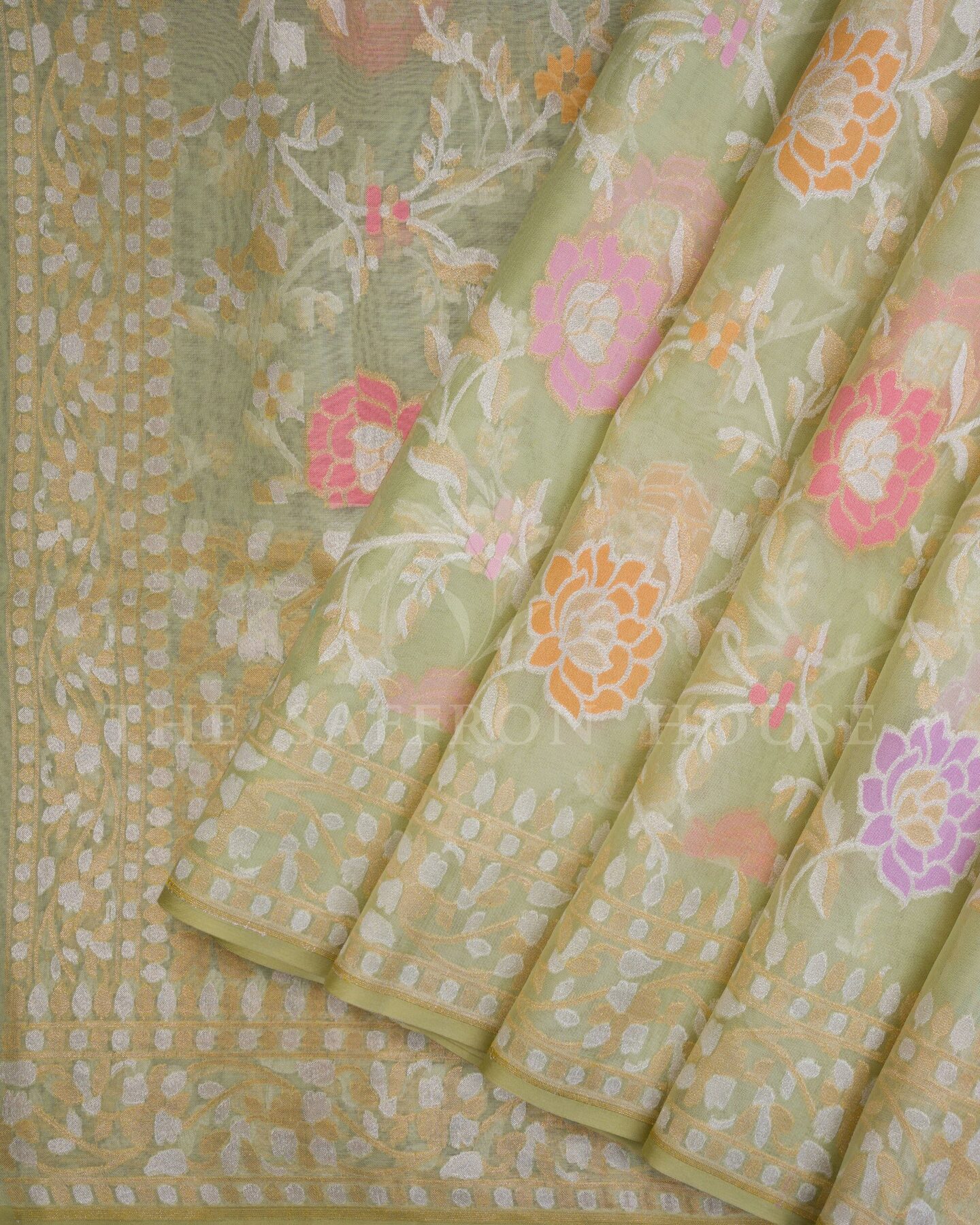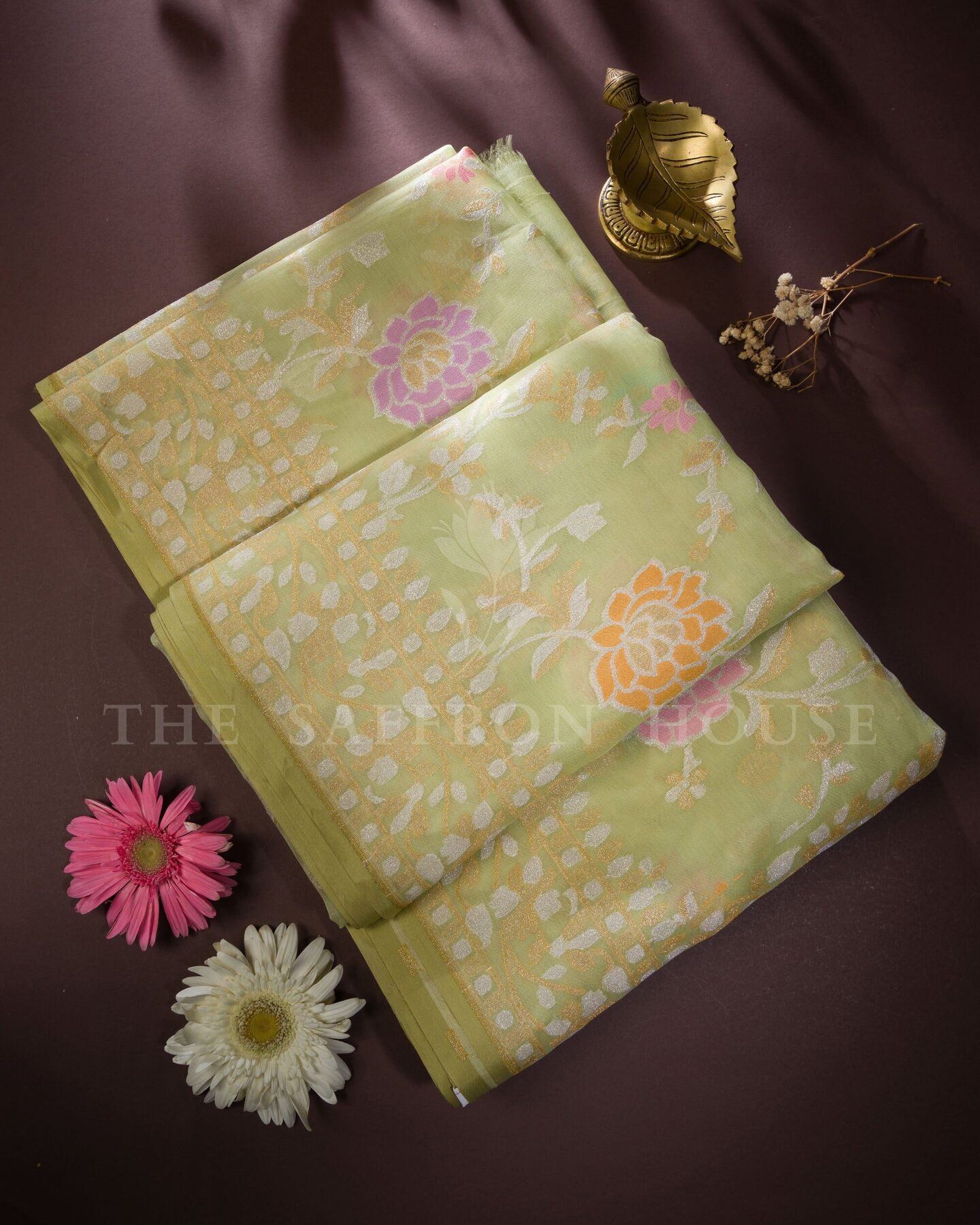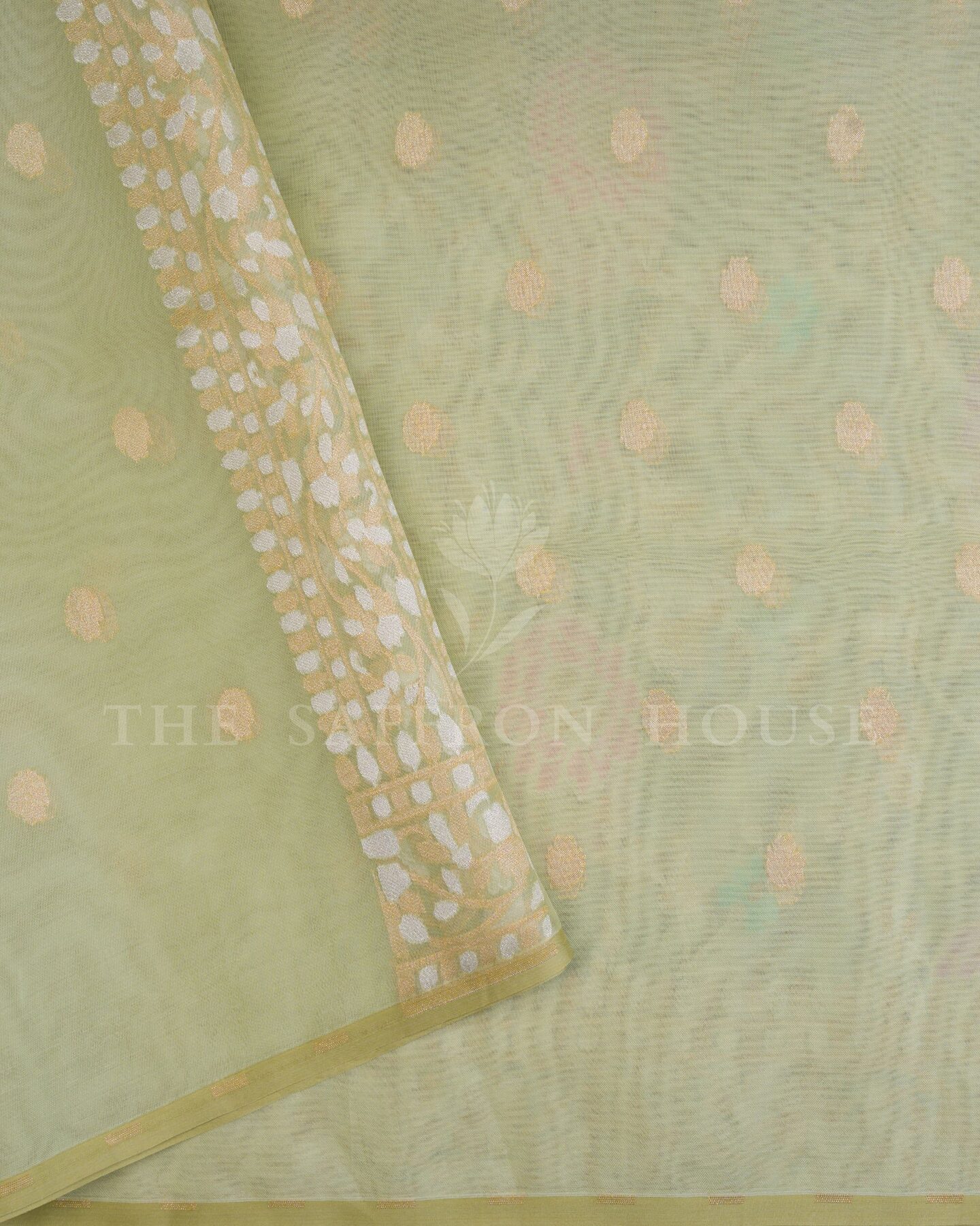 Some colours hold memory. Pista Green — radiant in its own quiet way — becomes something entirely new when woven into pure Kanjivaram silk. This Kora saree carries that colour with quiet authority and grace.