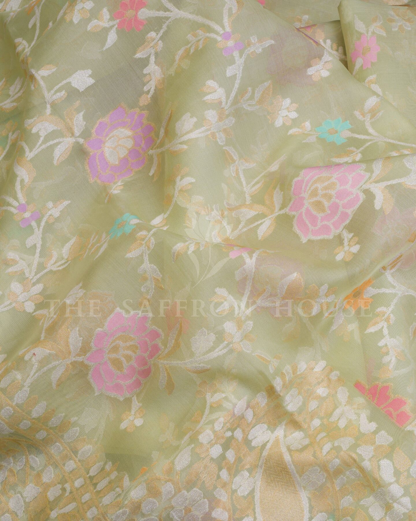 Kora silk is a sheer, crisp silk with a lightweight, airy finish.. Woven in Banaras, the heart of brocade and Jamdani excellence, this saree reflects the ongoing evolution of Jamdani weaving—from its classical Dhakai roots to experimental elegance on Kora silk.