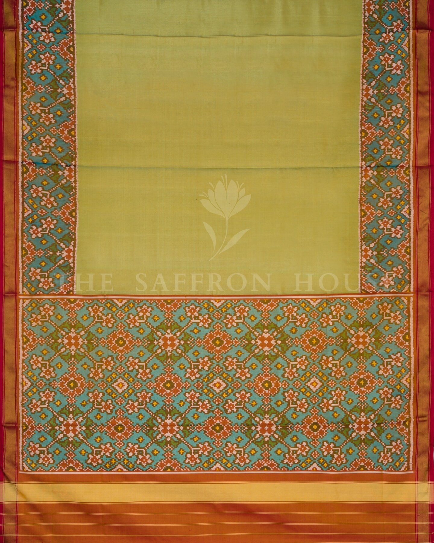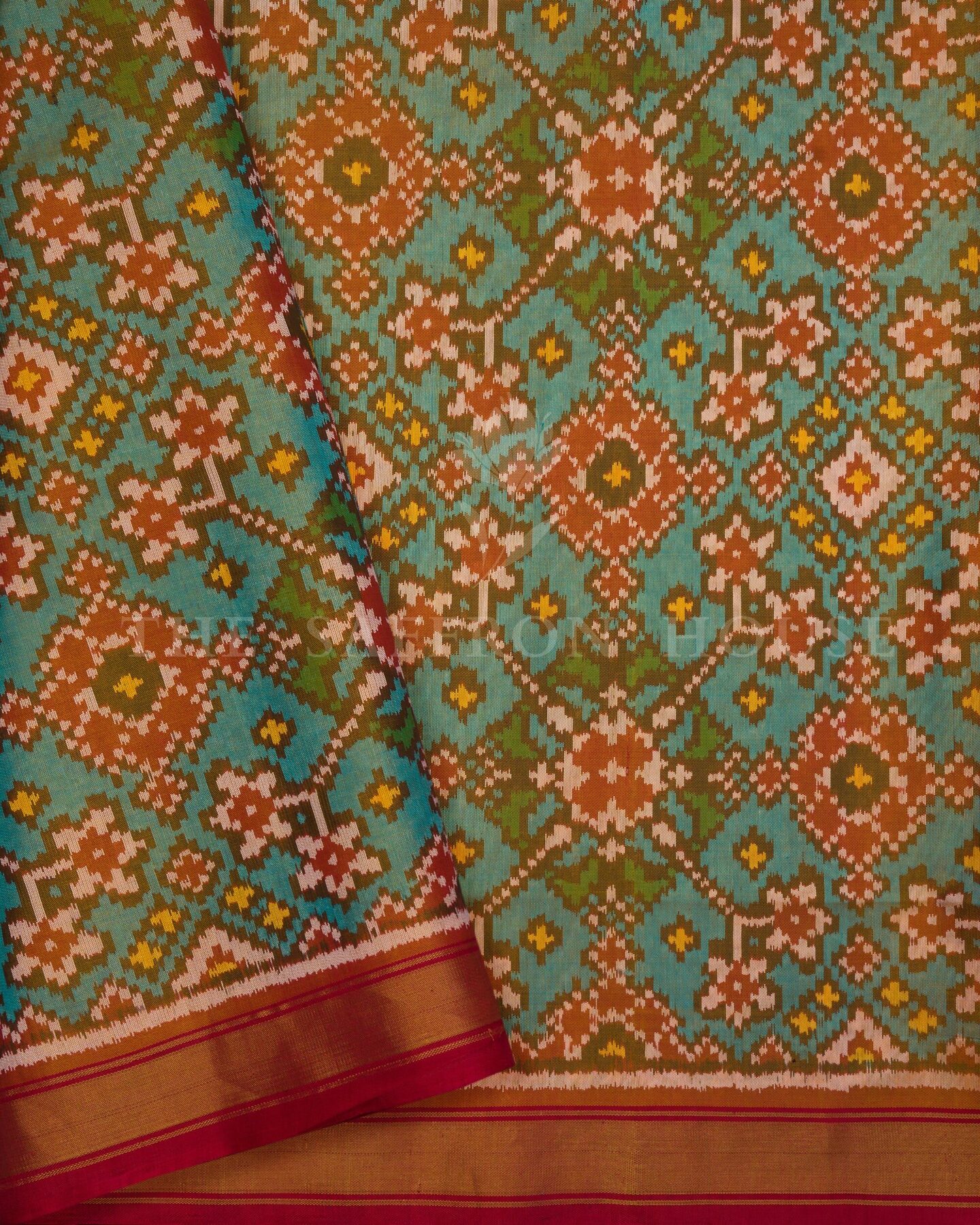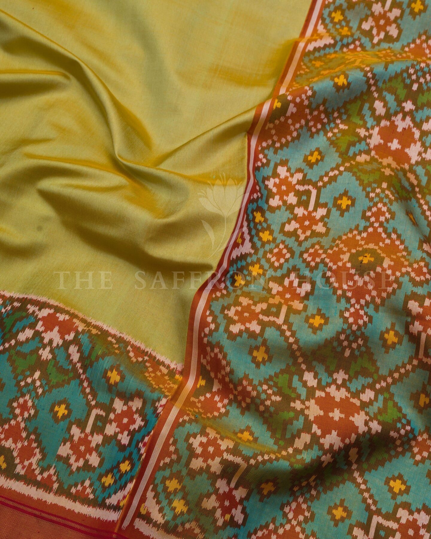 Pure Mercerized Silk. Woven in Rajkot, this saree reflects the lively energy of Saurashtra’s Patola artisans — celebrated for balancing bold ikat patterns with wearable ease.