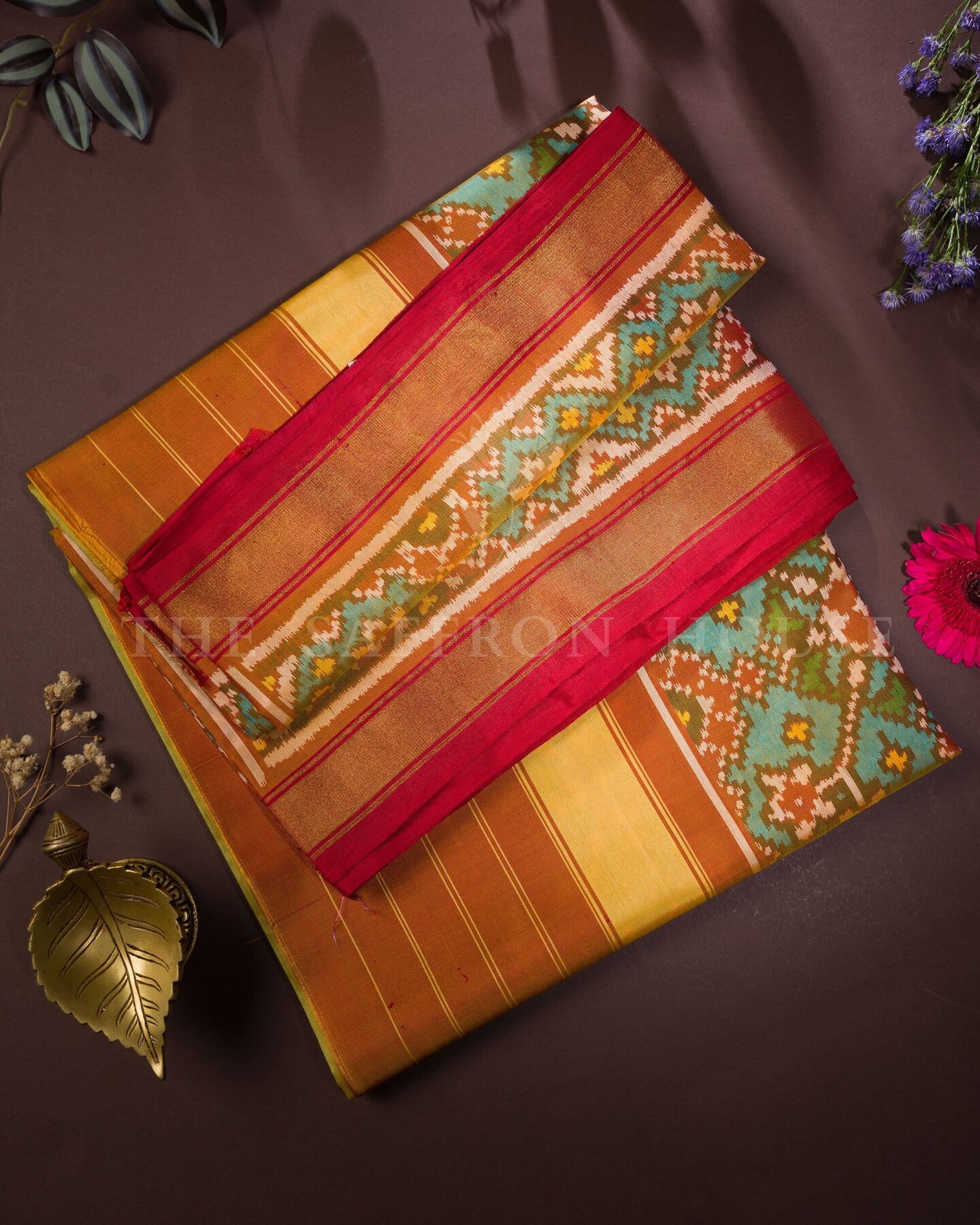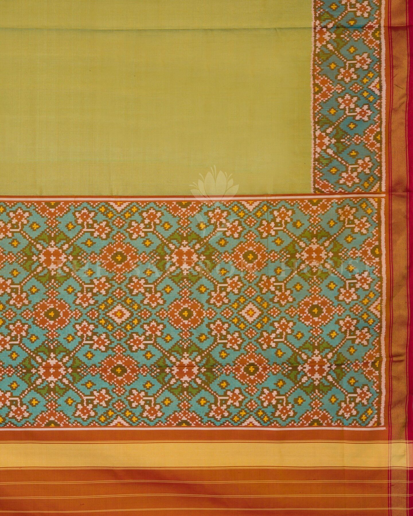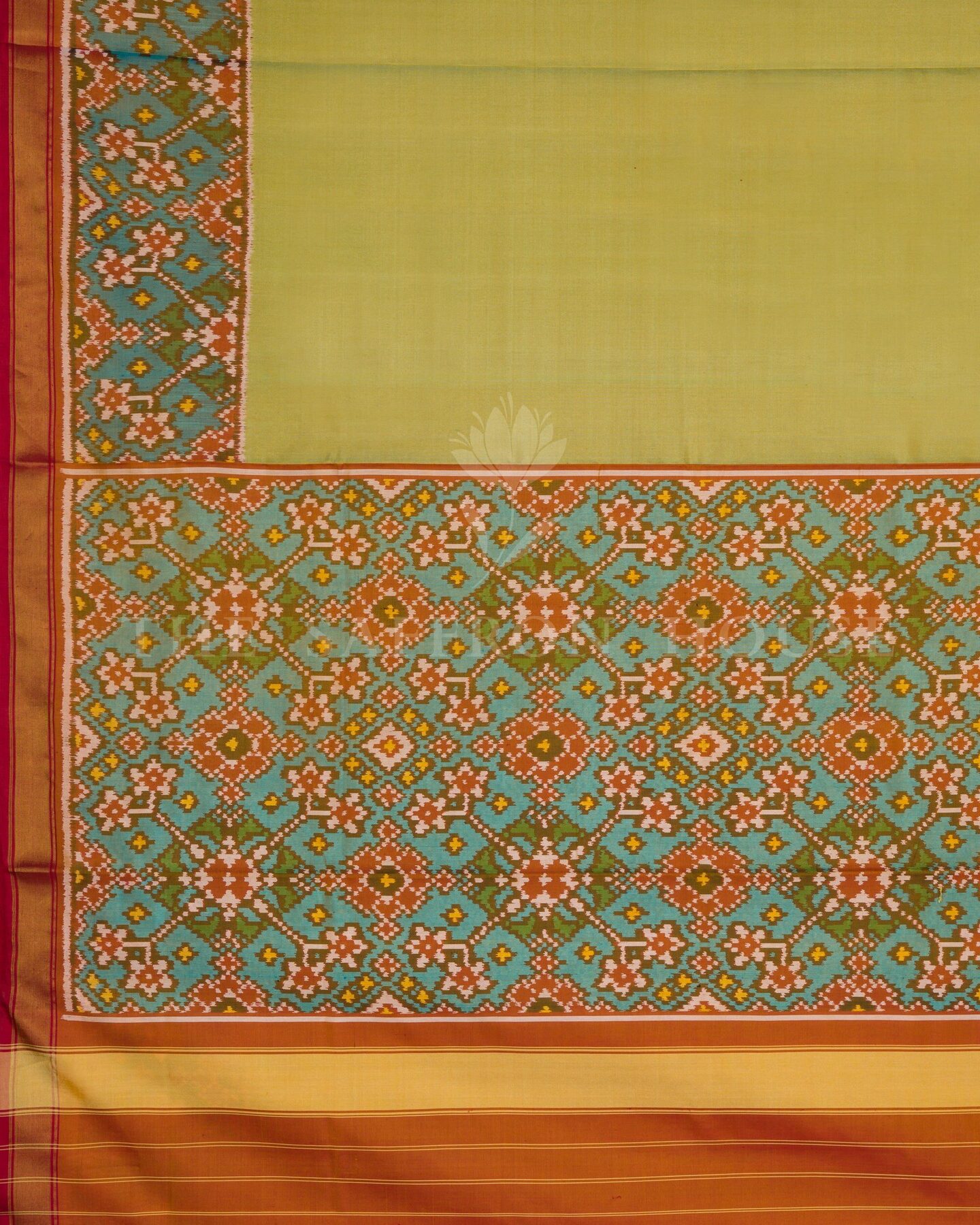 Pure Mercerized Silk. Woven in Rajkot, this saree reflects the lively energy of Saurashtra’s Patola artisans — celebrated for balancing bold ikat patterns with wearable ease.