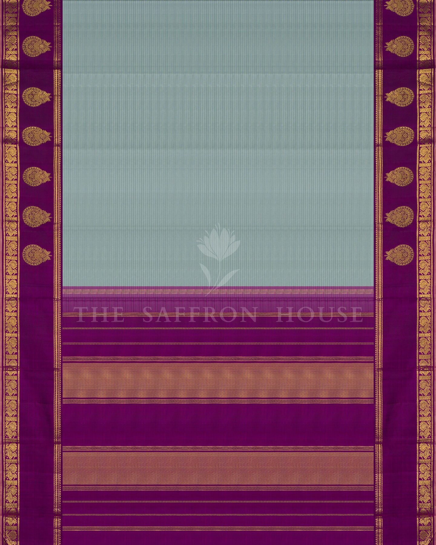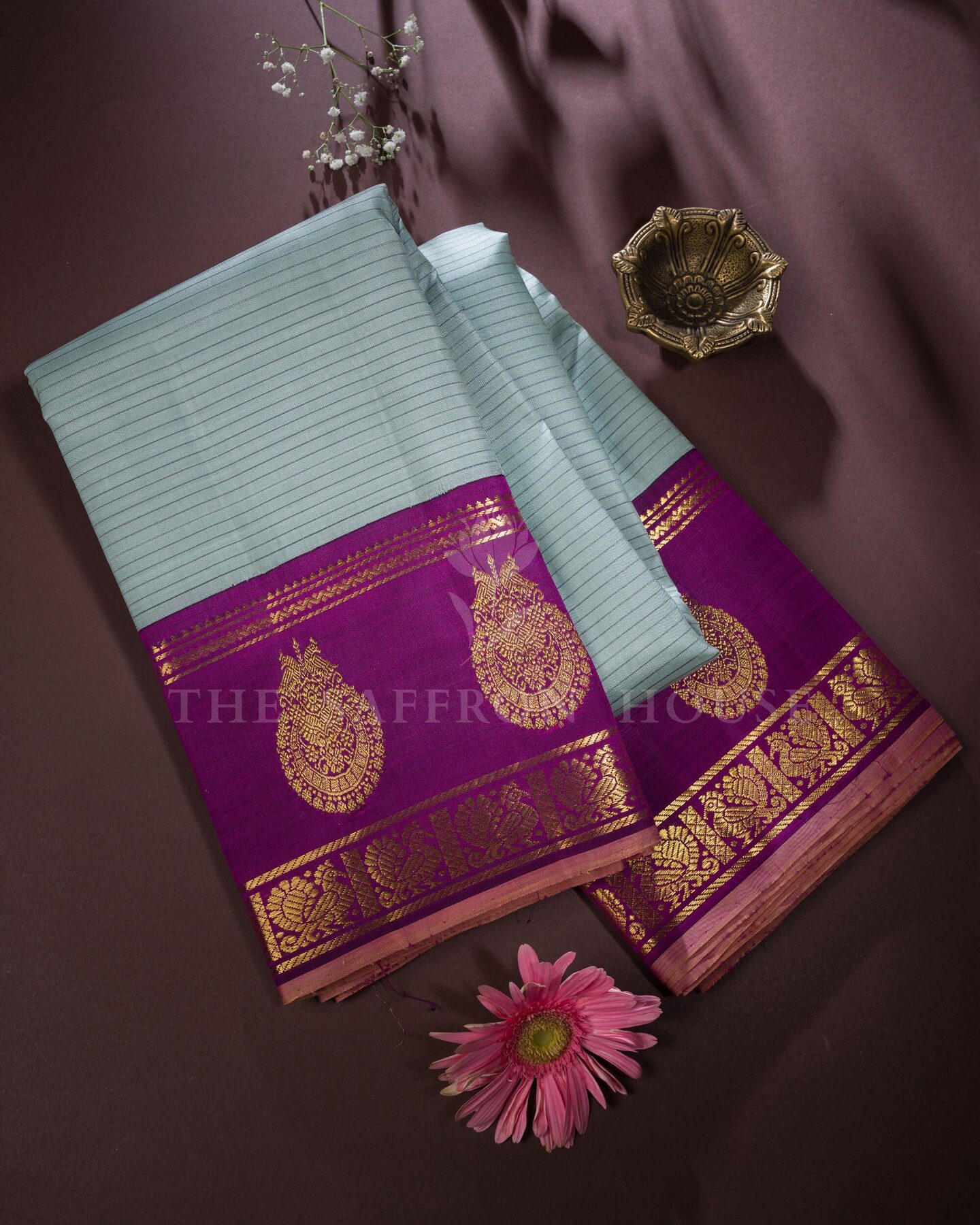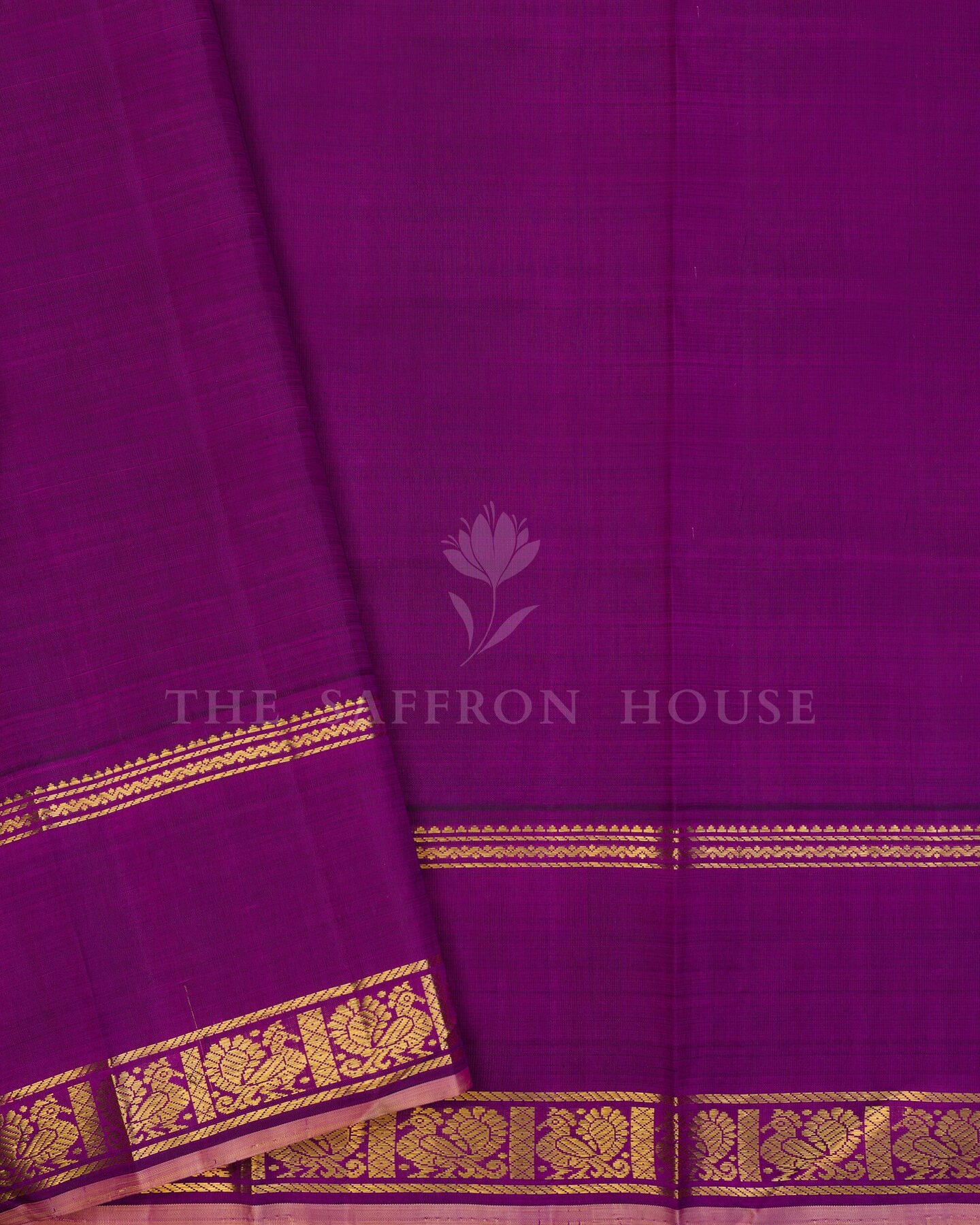 The body is woven with intricate traditional motifs, each thread placed with precision and purpose. A richly woven border frames the drape with confident definition, while gold zari runs through the weave, catching light the way temple gold does — slowly, deeply, unforgettably.