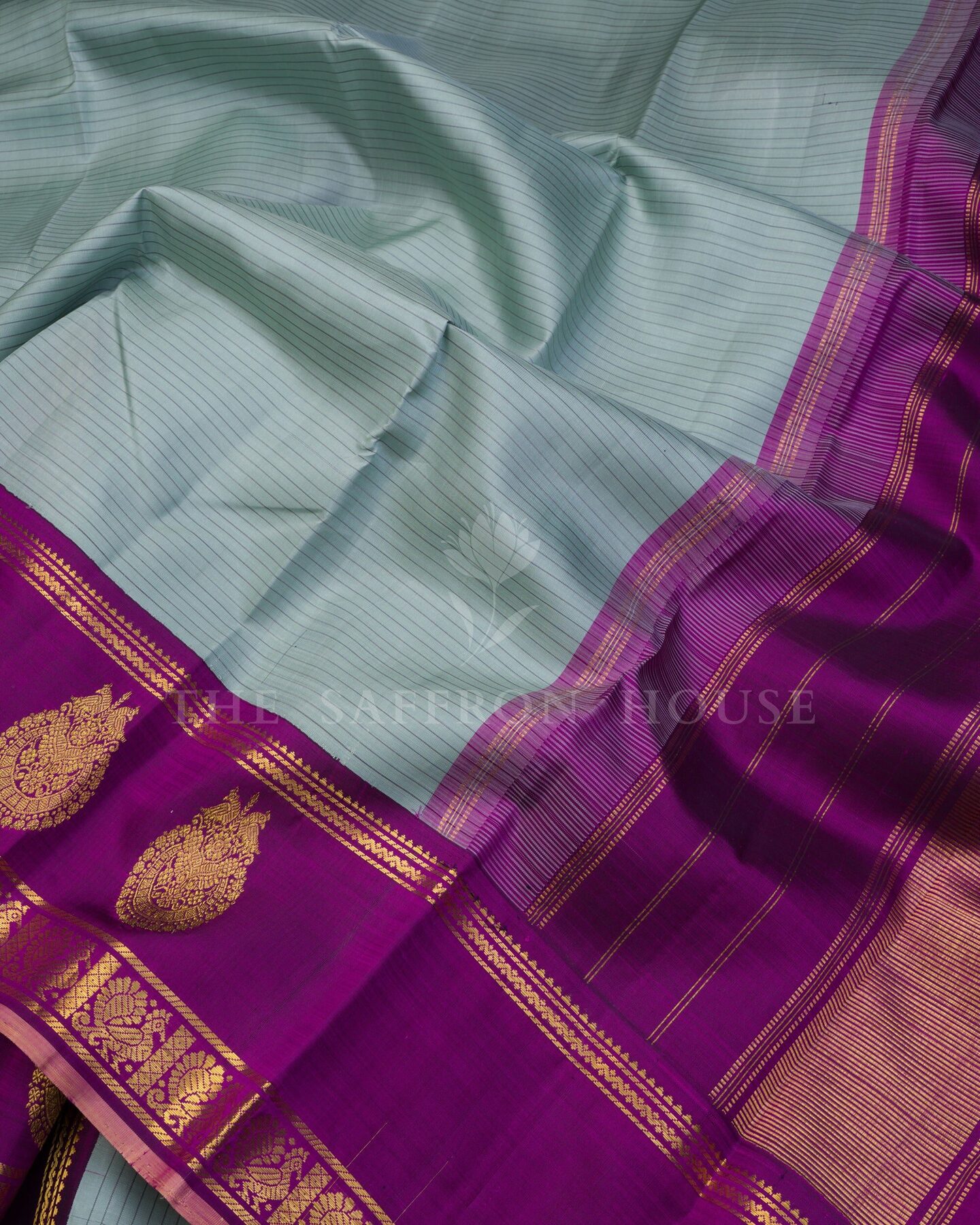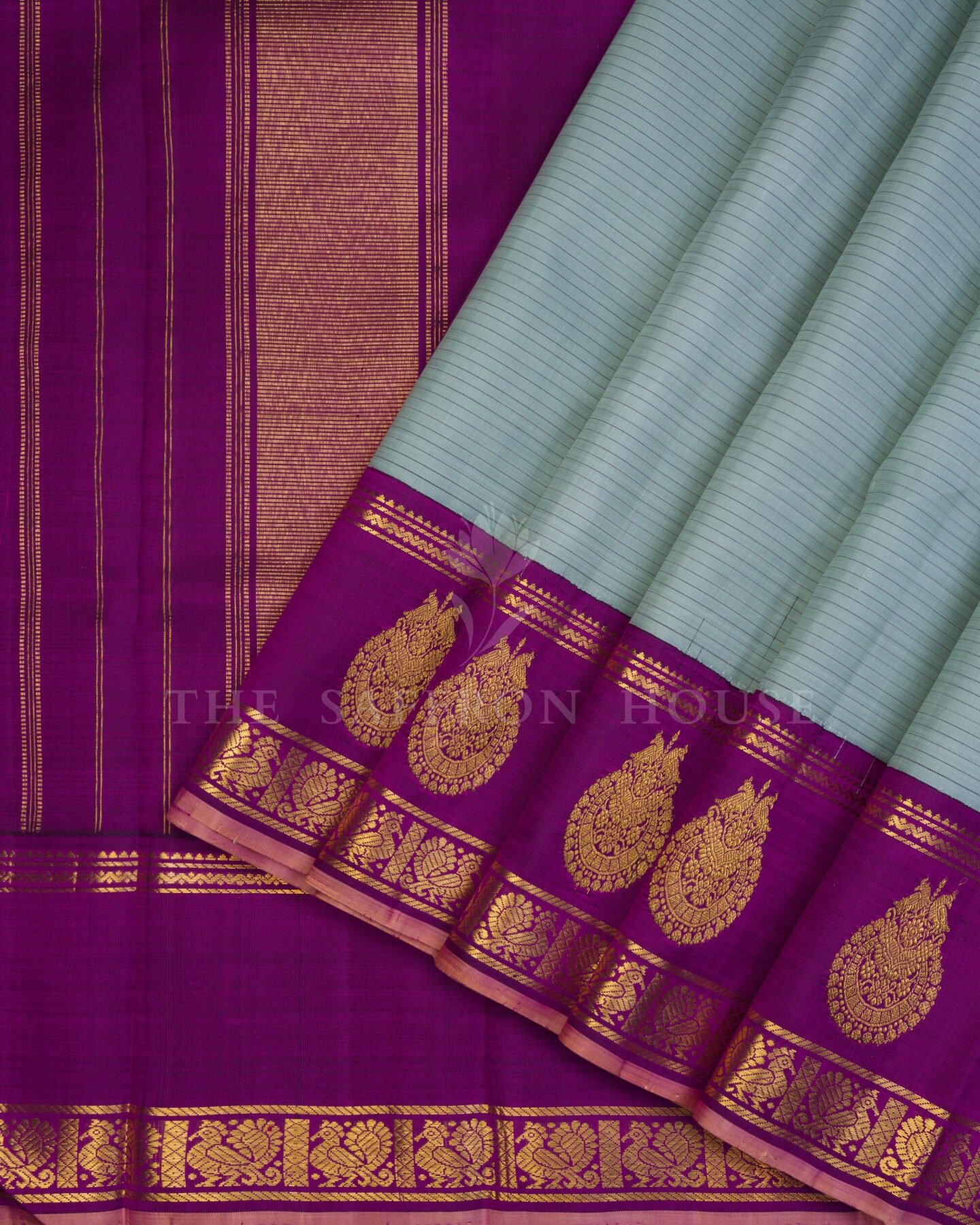 There is something about the interplay of powder blue and magenta that feels both ancient and alive. This Korvai Kanjivaram silk saree opens with radiant in its own quiet way, its surface shimmering with the unhurried rhythm of the loom.