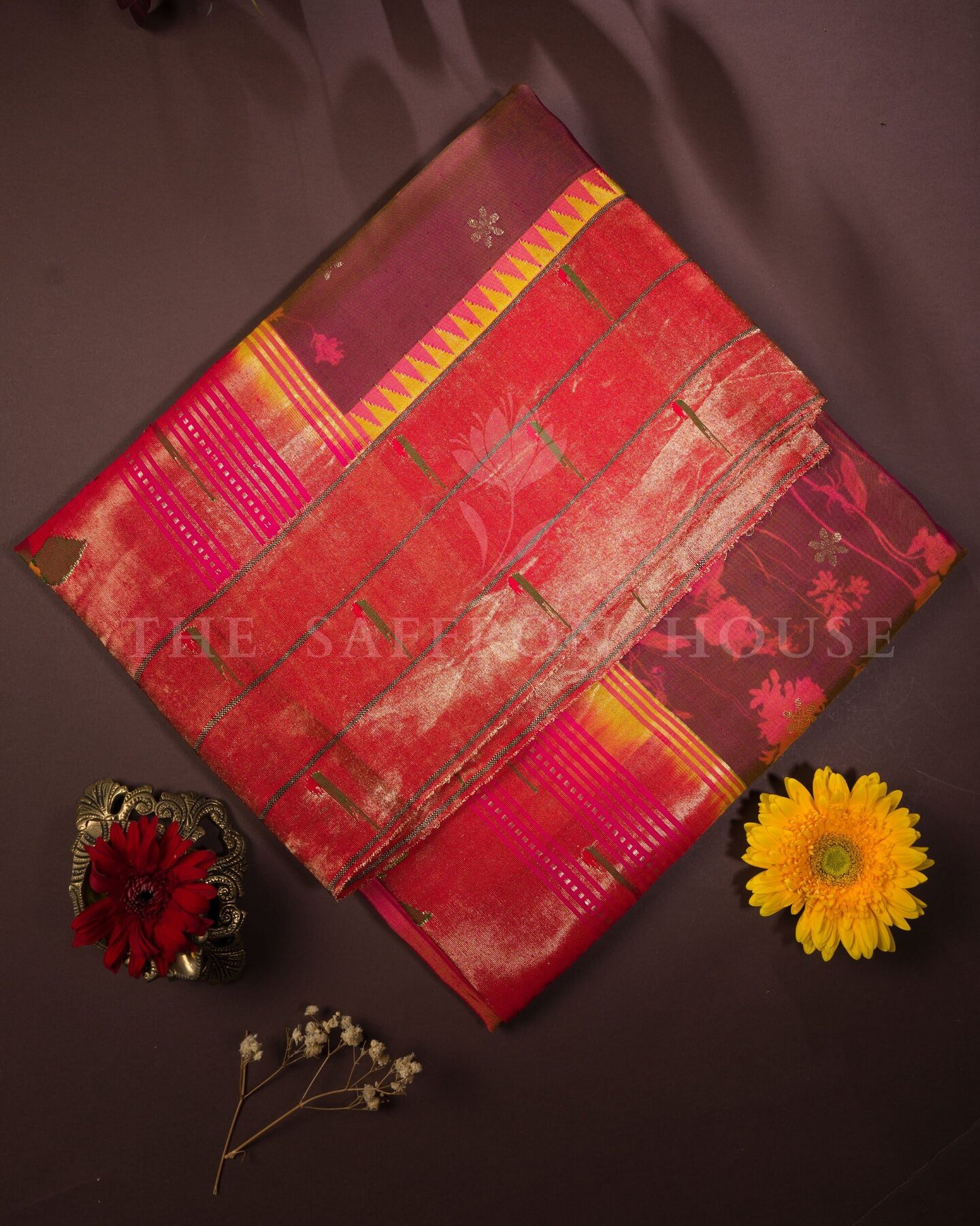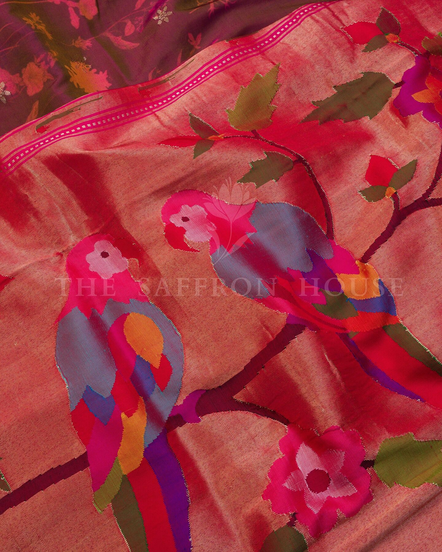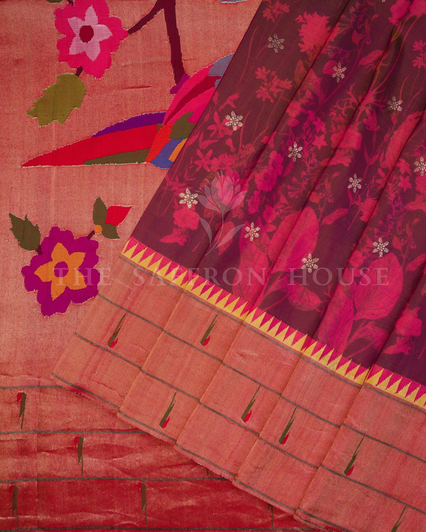 There is something about the interplay of maroon and brick red that feels both ancient and alive. This Paithani Kanjivaram silk saree opens with radiant in its own quiet way, its surface shimmering with the unhurried rhythm of the loom.