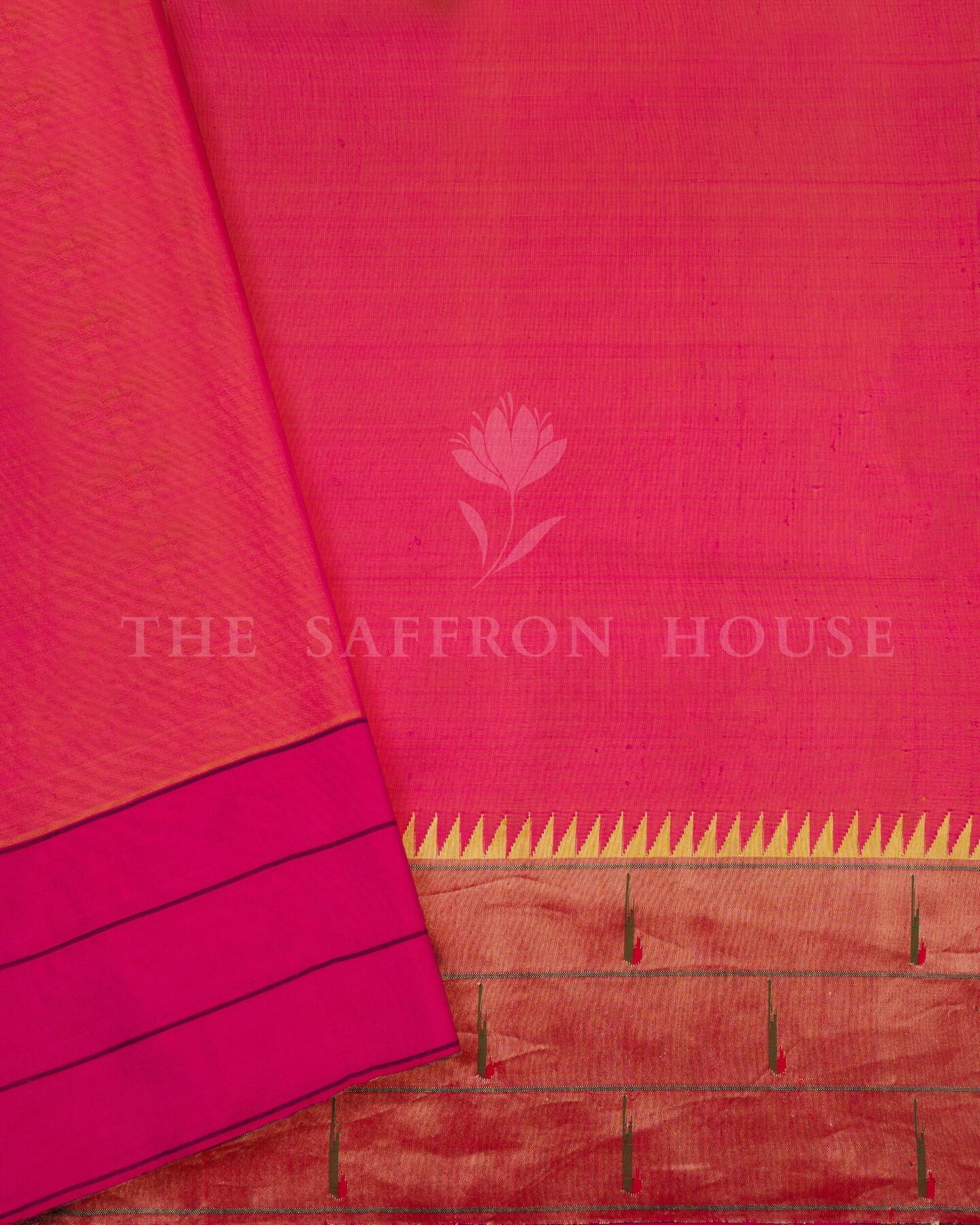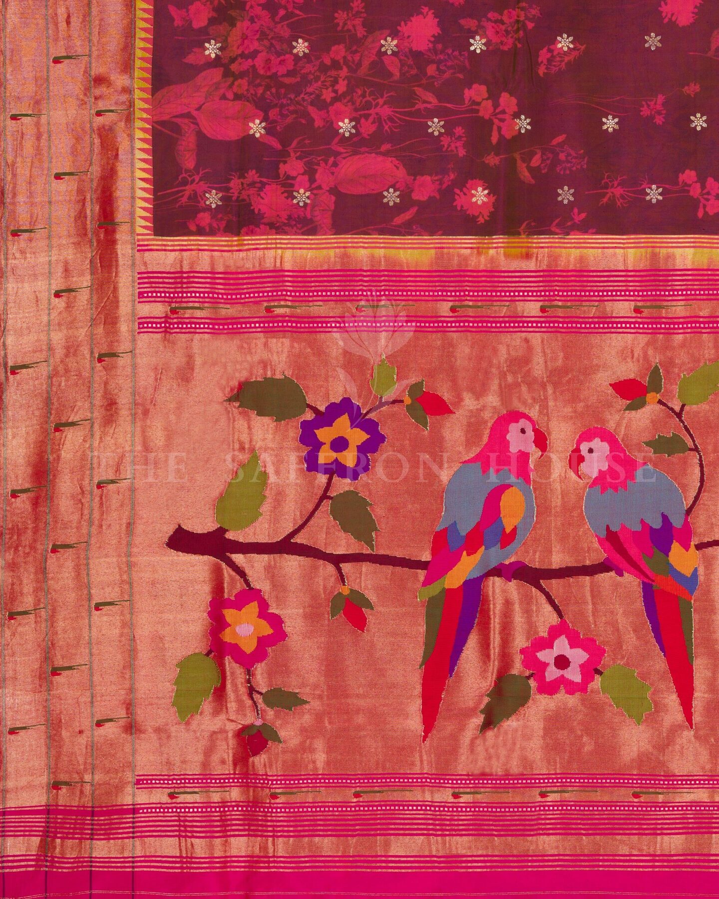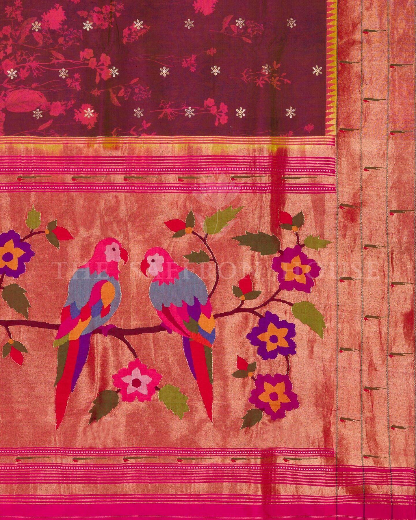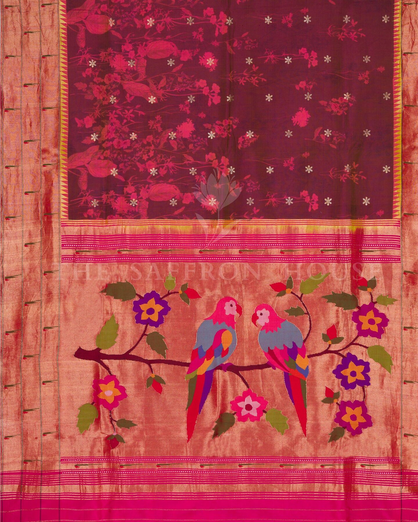 There is something about the interplay of maroon and brick red that feels both ancient and alive. This Paithani Kanjivaram silk saree opens with radiant in its own quiet way, its surface shimmering with the unhurried rhythm of the loom.