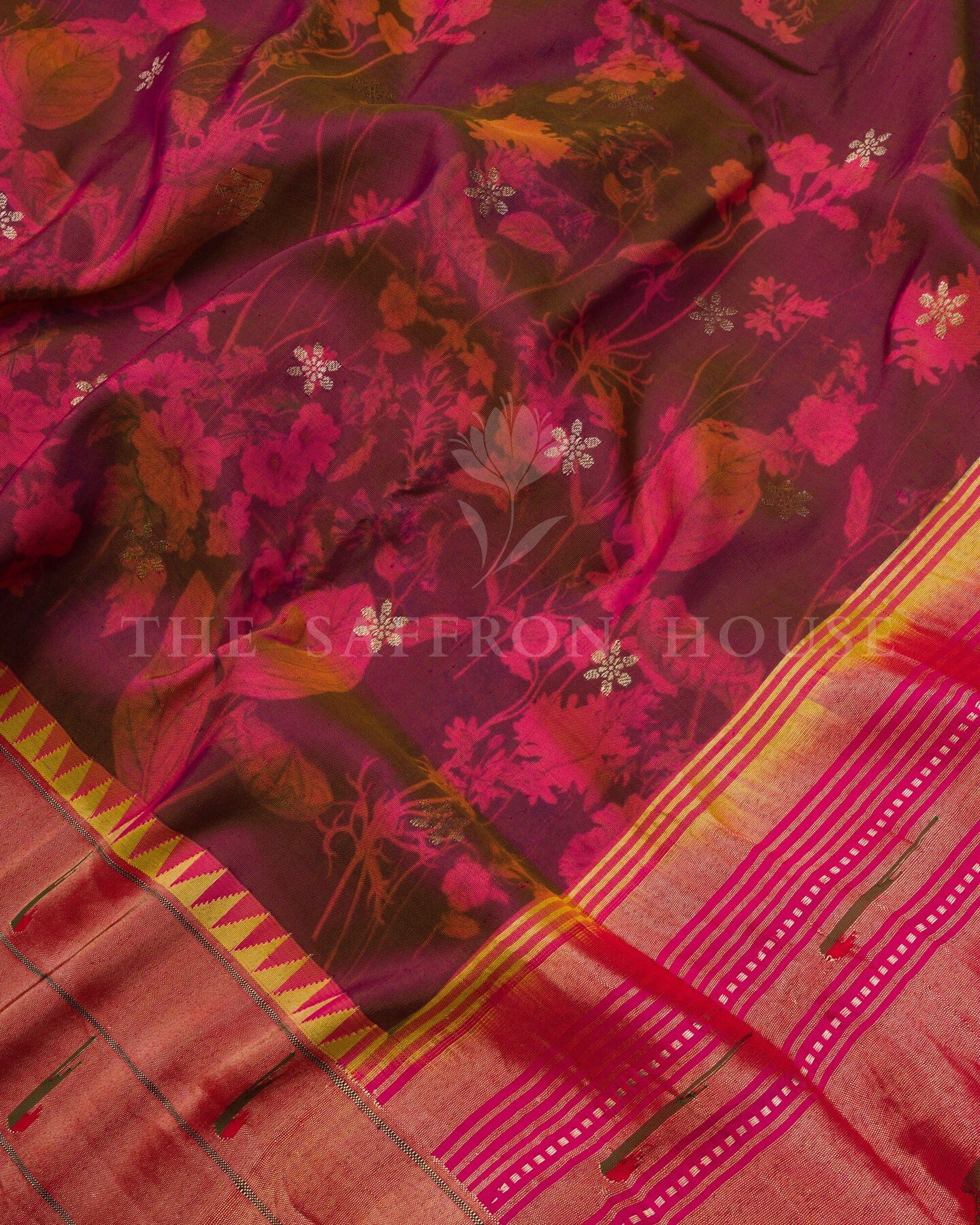 Silk blend with digital print and traditional woven border. This saree is crafted in Yeola, Maharashtra — the heart of Paithani weaving.