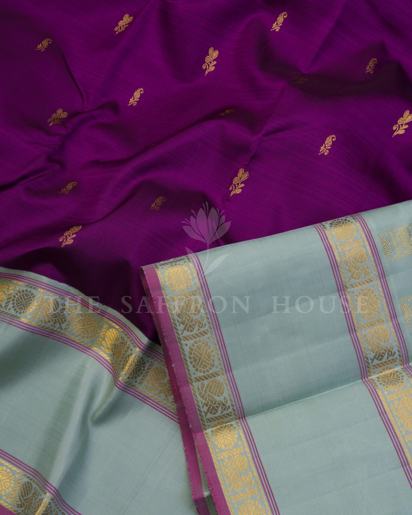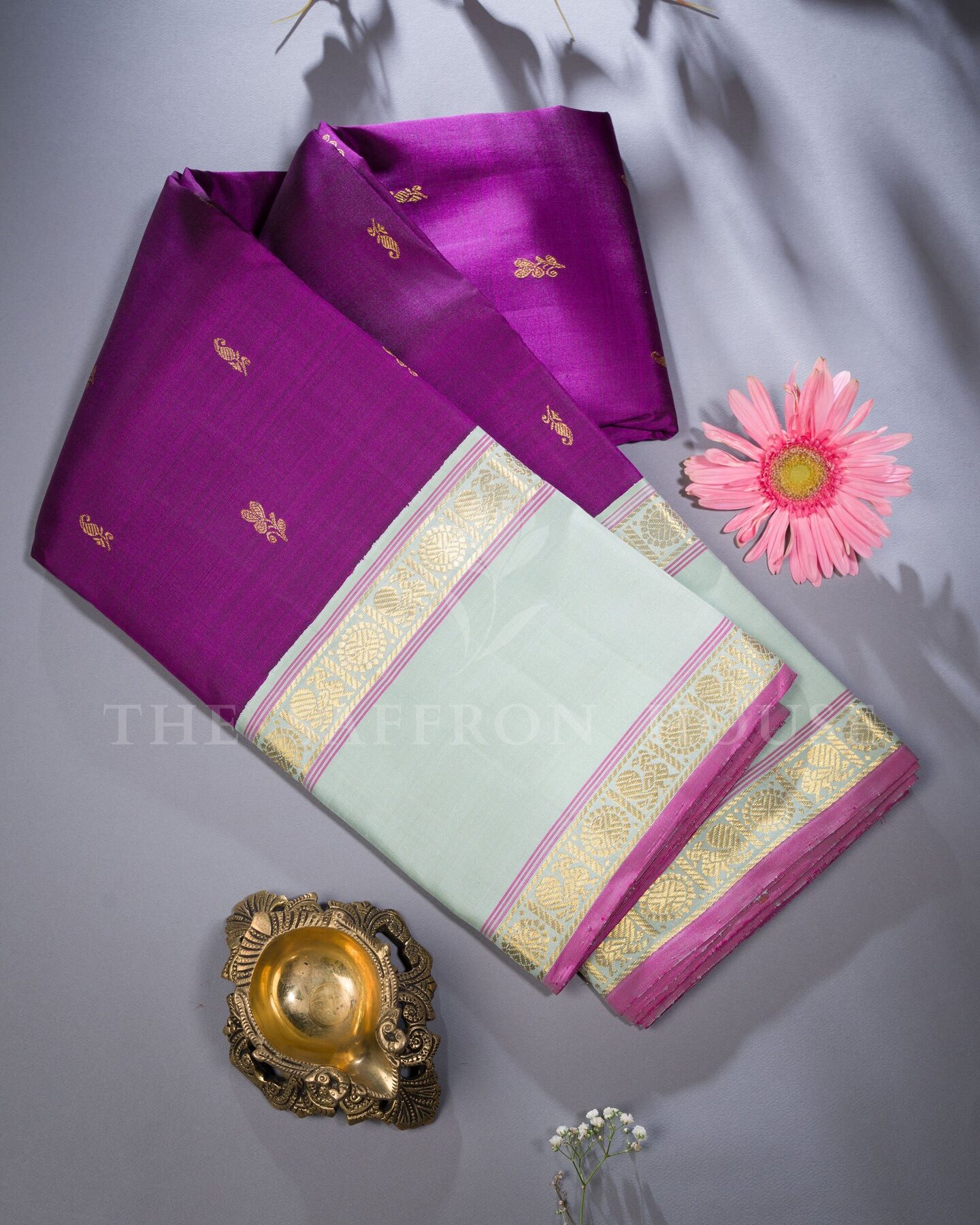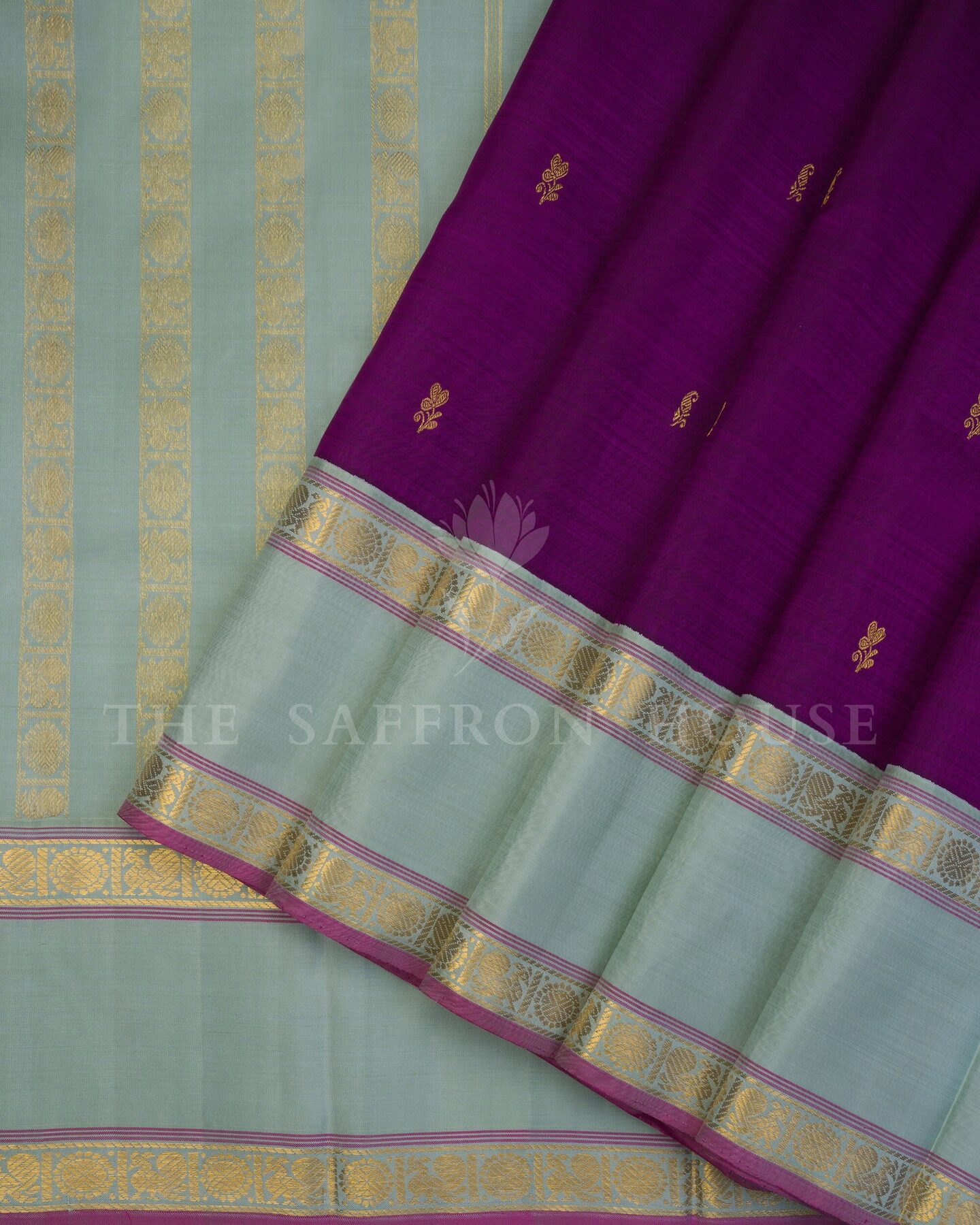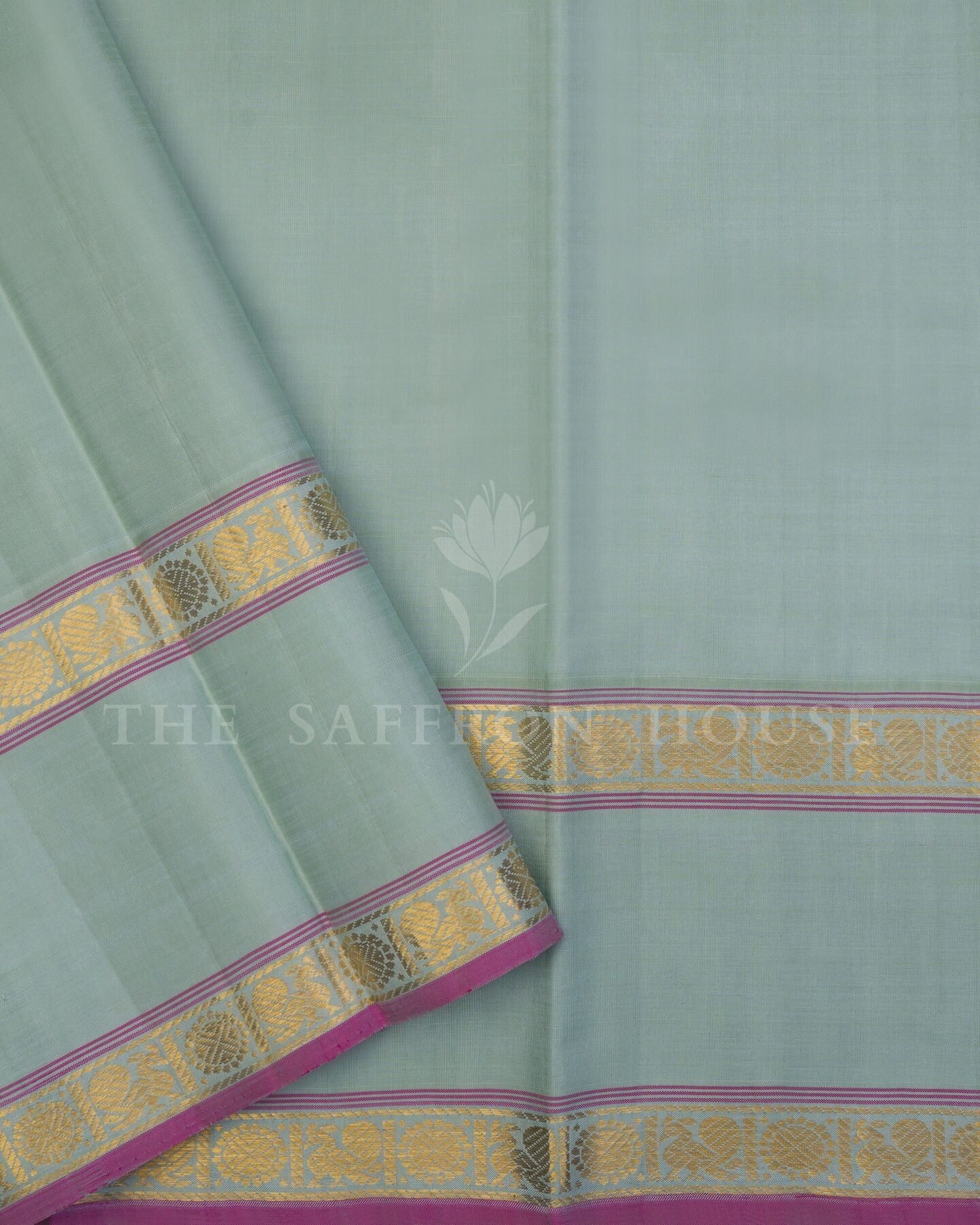 There is something about the interplay of mint and purple that feels both ancient and alive. This Korvai Kanjivaram silk saree opens with radiant in its own quiet way, its surface shimmering with the unhurried rhythm of the loom.