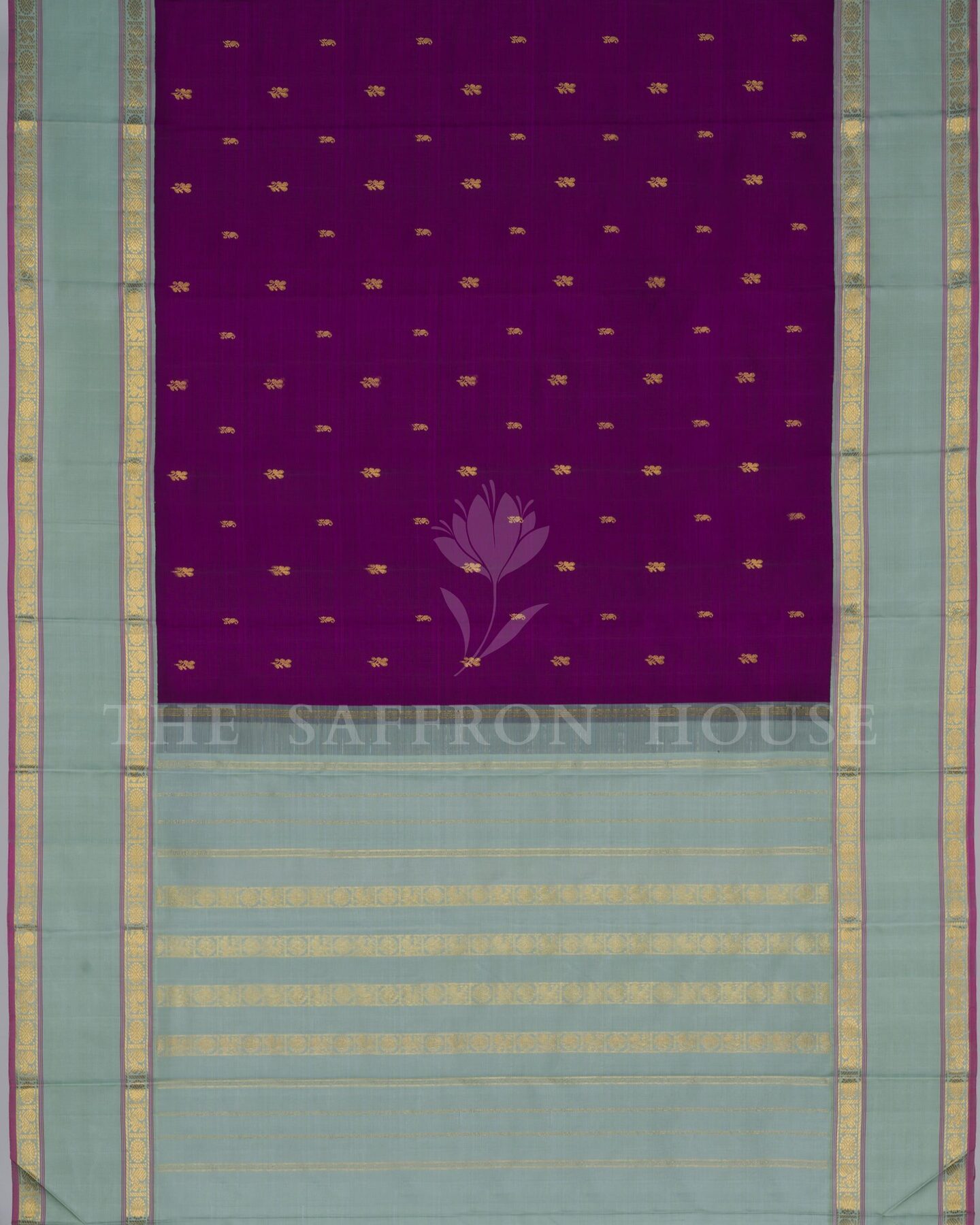 The body is woven with intricate traditional motifs, each thread placed with precision and purpose. A richly woven border frames the drape with confident definition, while gold zari runs through the weave, catching light the way temple gold does — slowly, deeply, unforgettably.