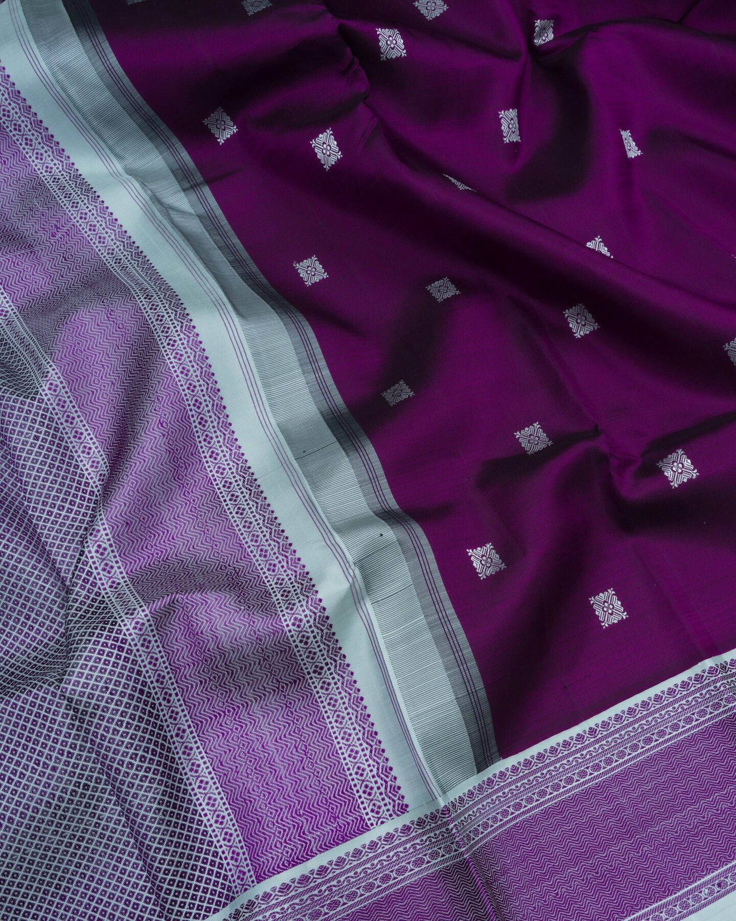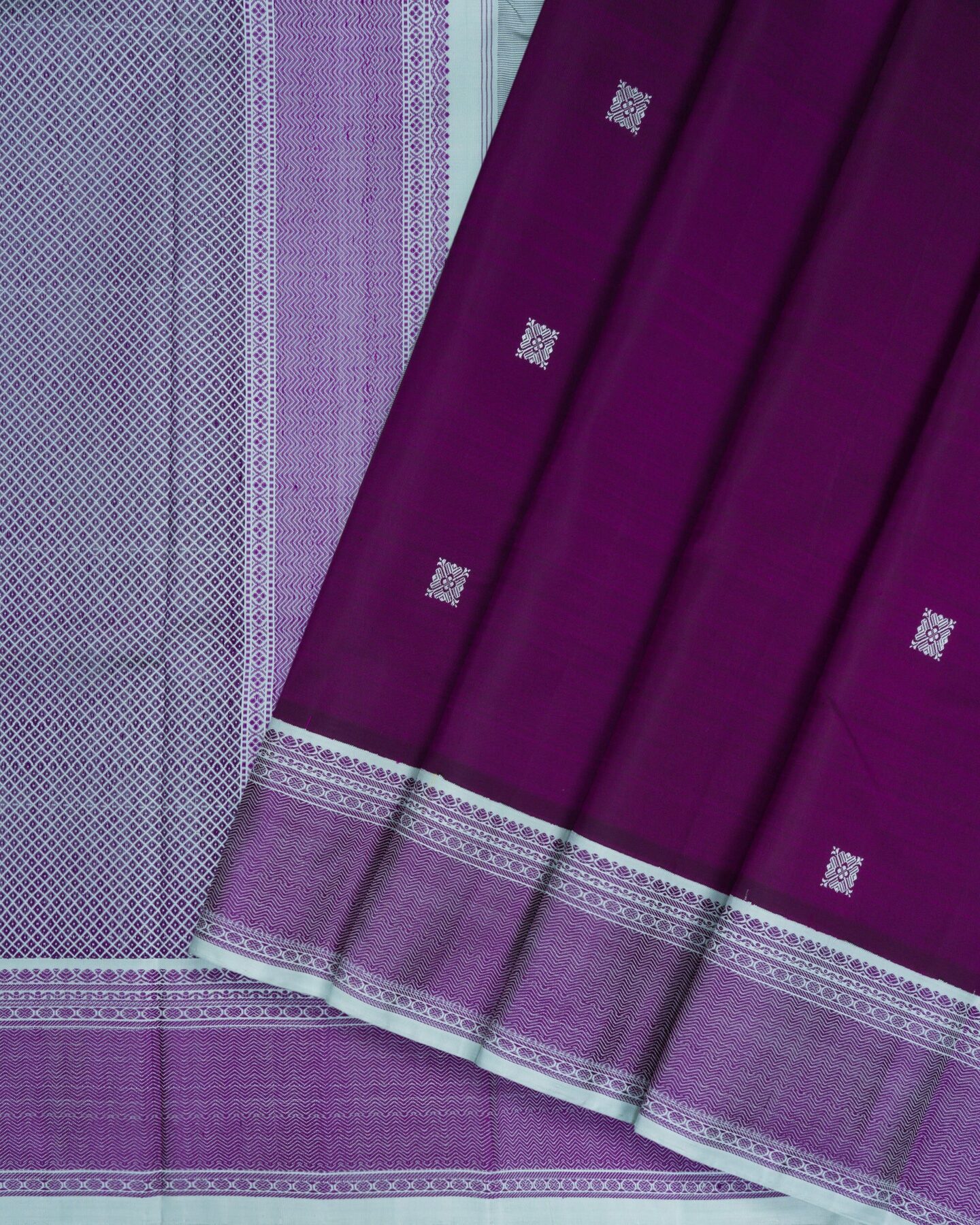 There is something about the interplay of purple and powder blue that feels both ancient and alive. This Brocade Kanjivaram silk saree opens with the hue of quiet royalty, its surface shimmering with the unhurried rhythm of the loom.