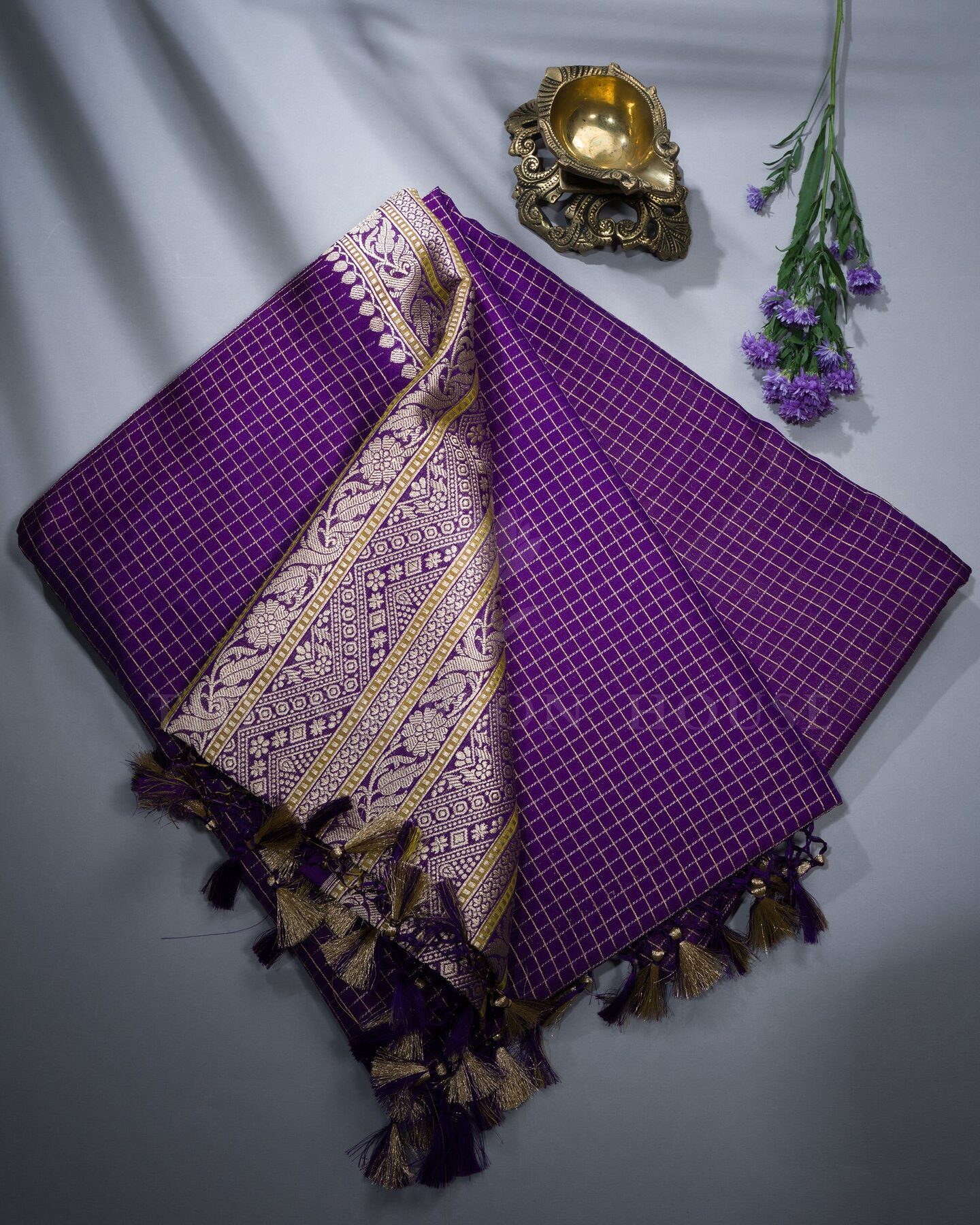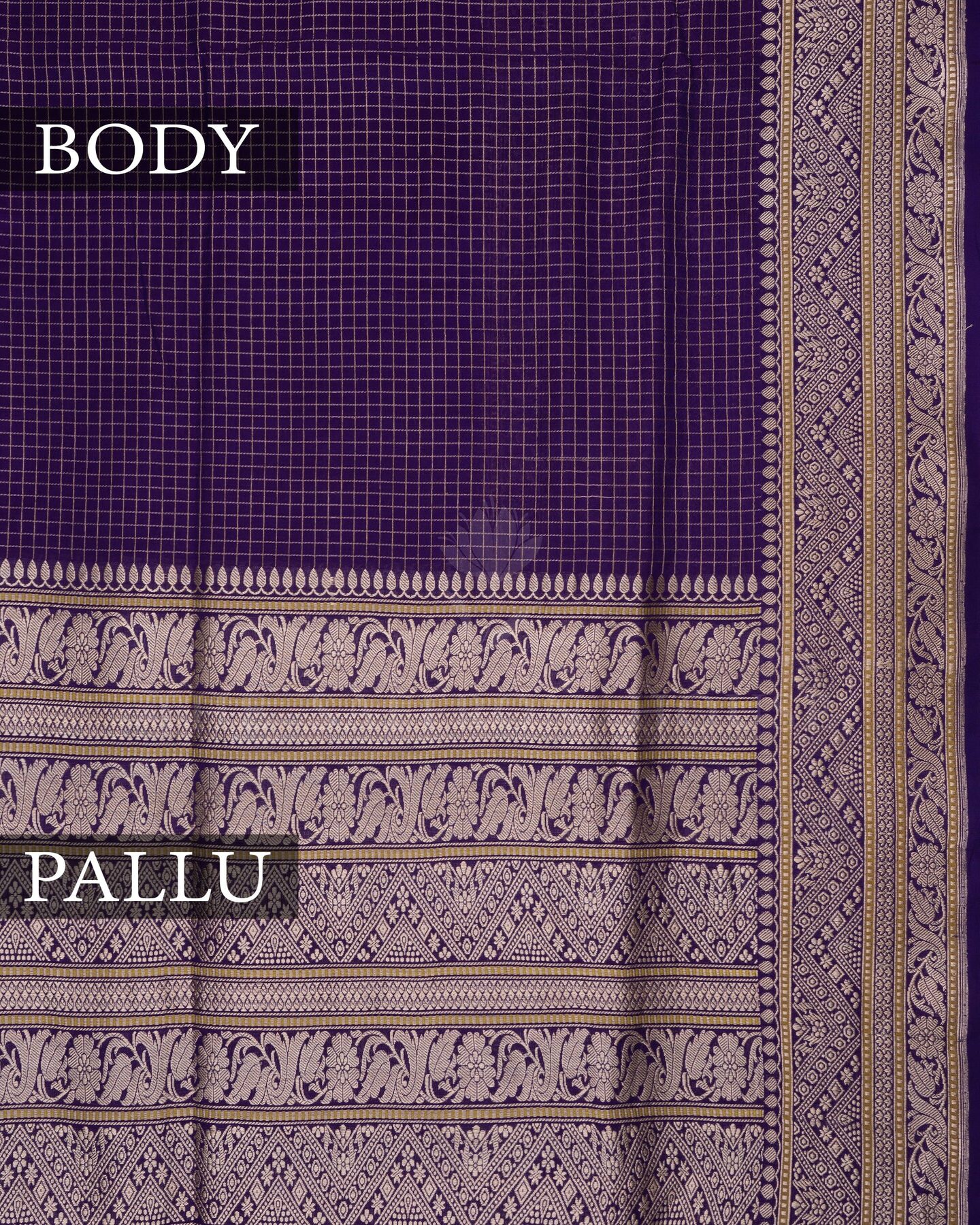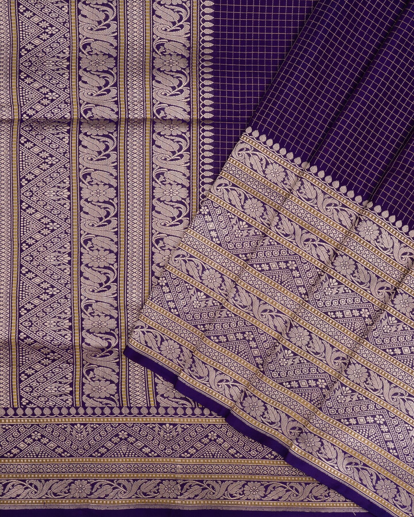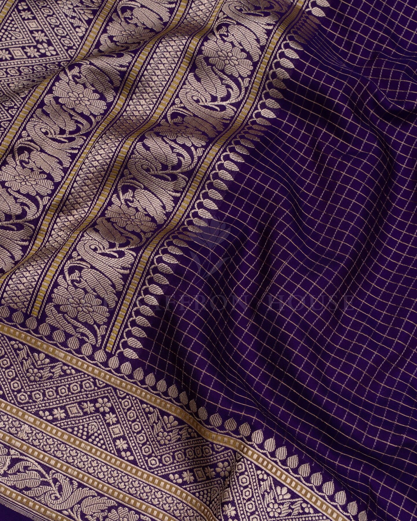 The body is adorned with small golden zari checks, each thread placed with precision and purpose. The purple border frames the drape with confident definition, while antique zari runs through the weave, catching light the way temple gold does — slowly, deeply, unforgettably.