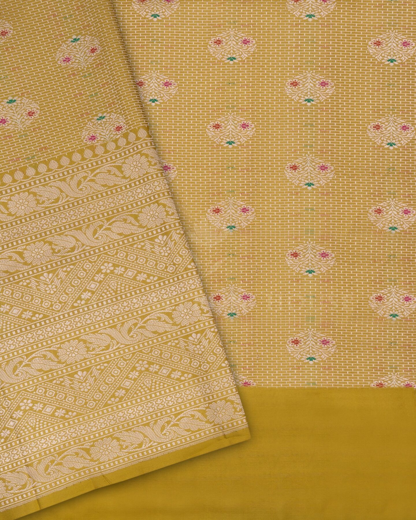 Banarasi Silk. Handcrafted in Varanasi, this saree reflects the soul of Banarasi weaving — combining fine silk threads with intricate motifs rooted in temple architecture and Mughal gardens.