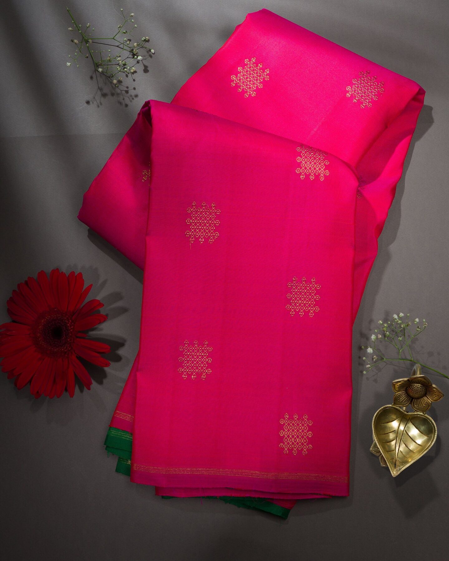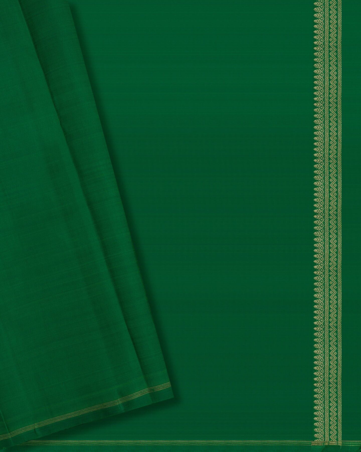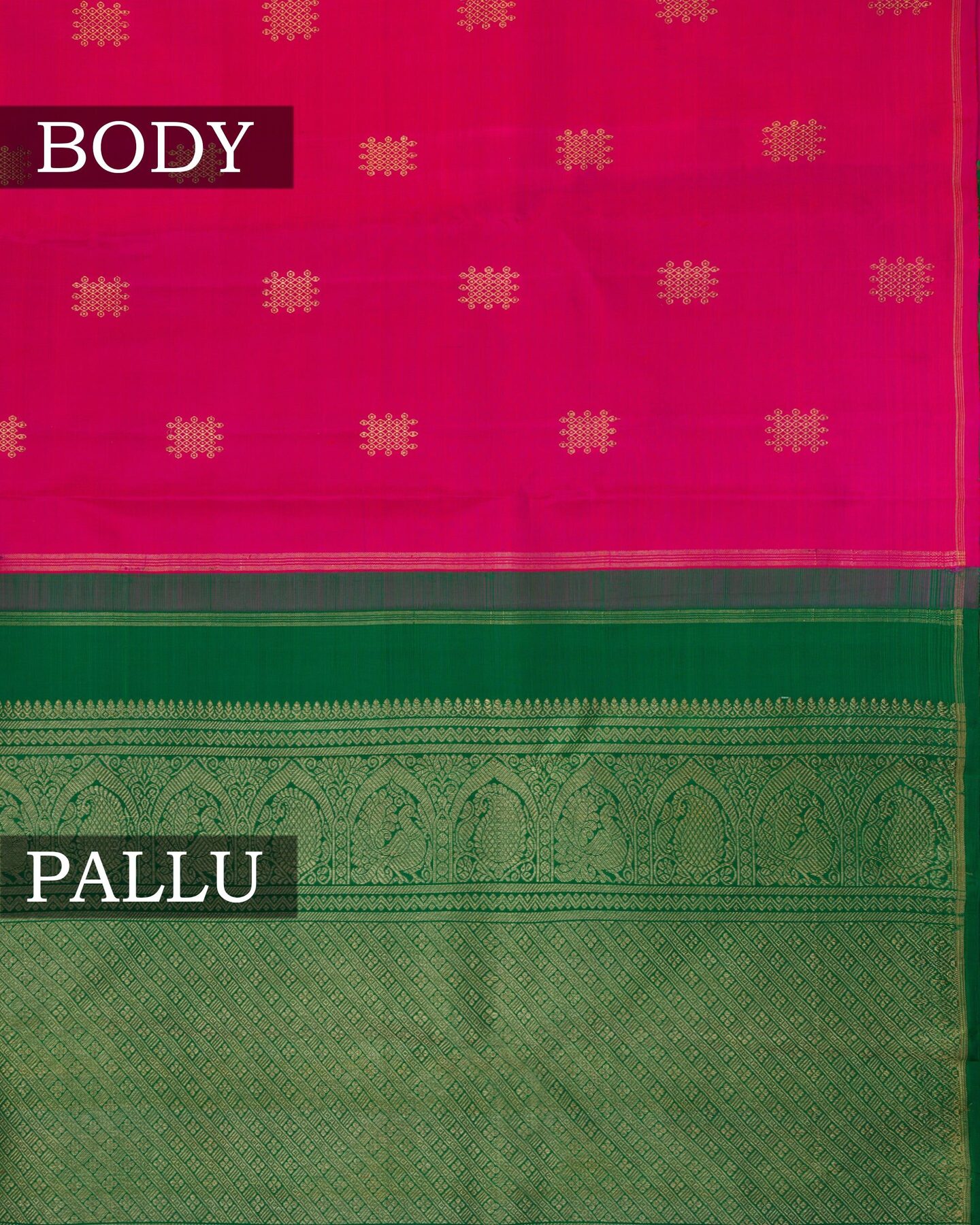 There is something about the interplay of rani pink and bottle green that feels both ancient and alive. This Brocade Kanjivaram silk saree opens with regal as a queen's court in bloom, its surface shimmering with the unhurried rhythm of the loom.