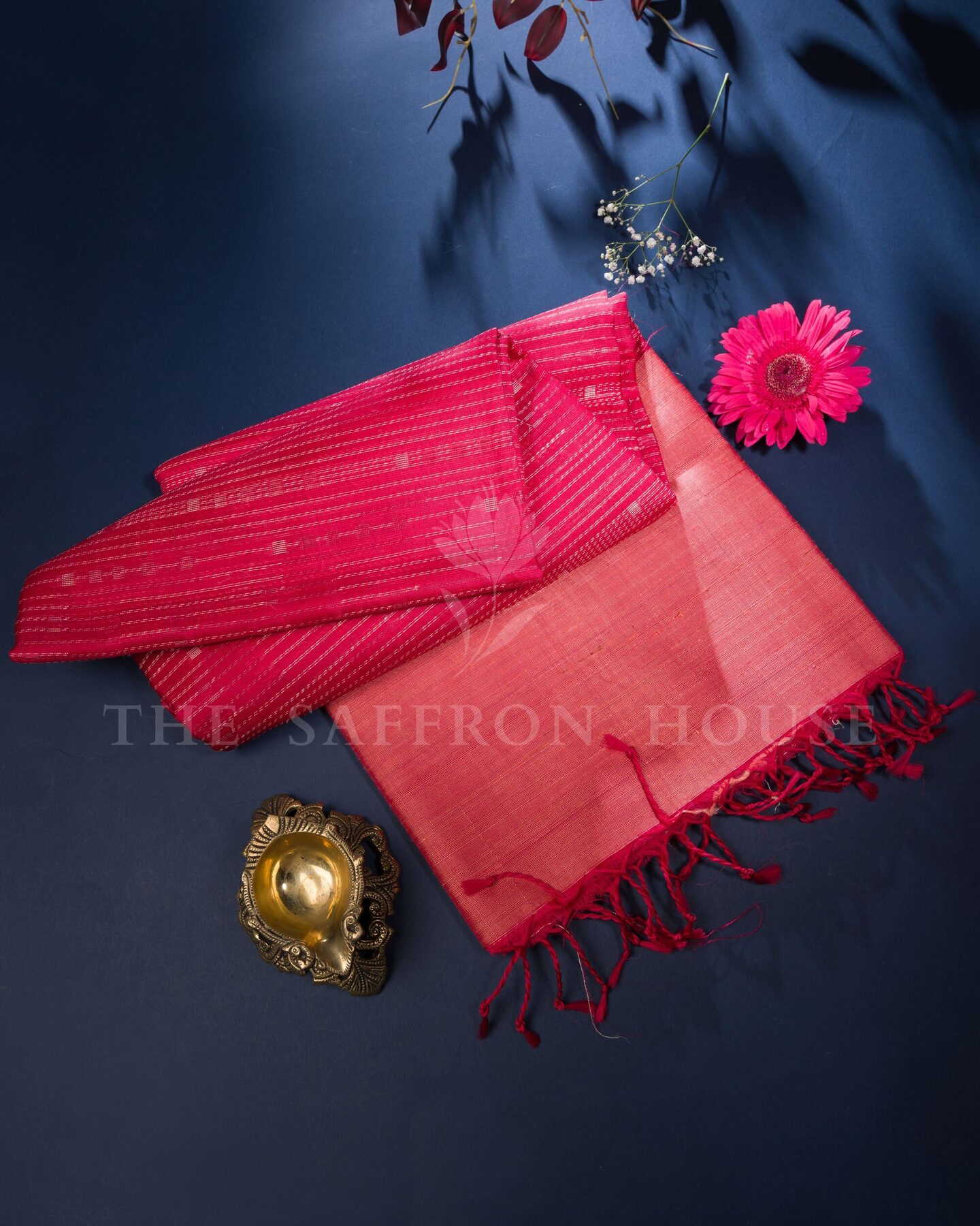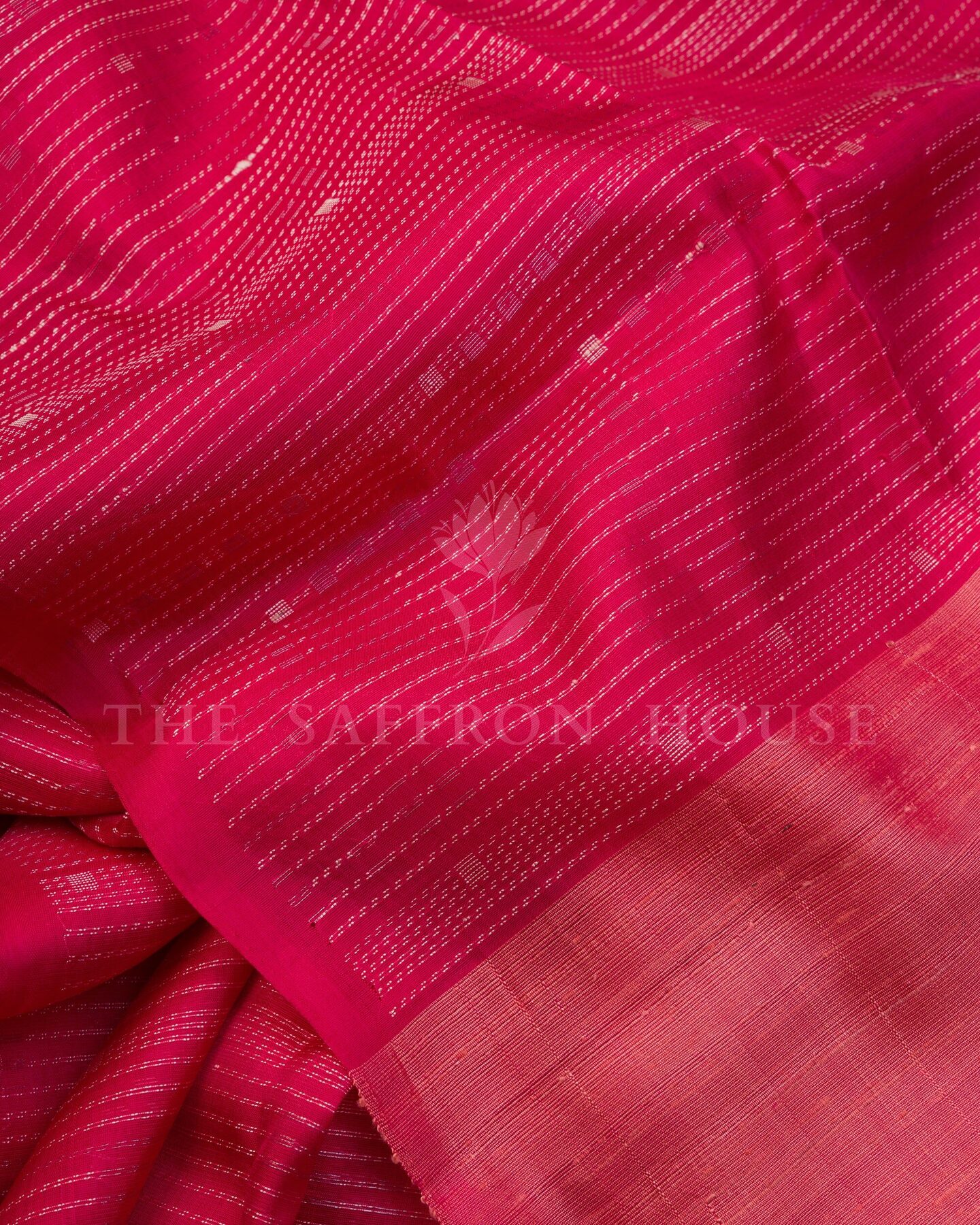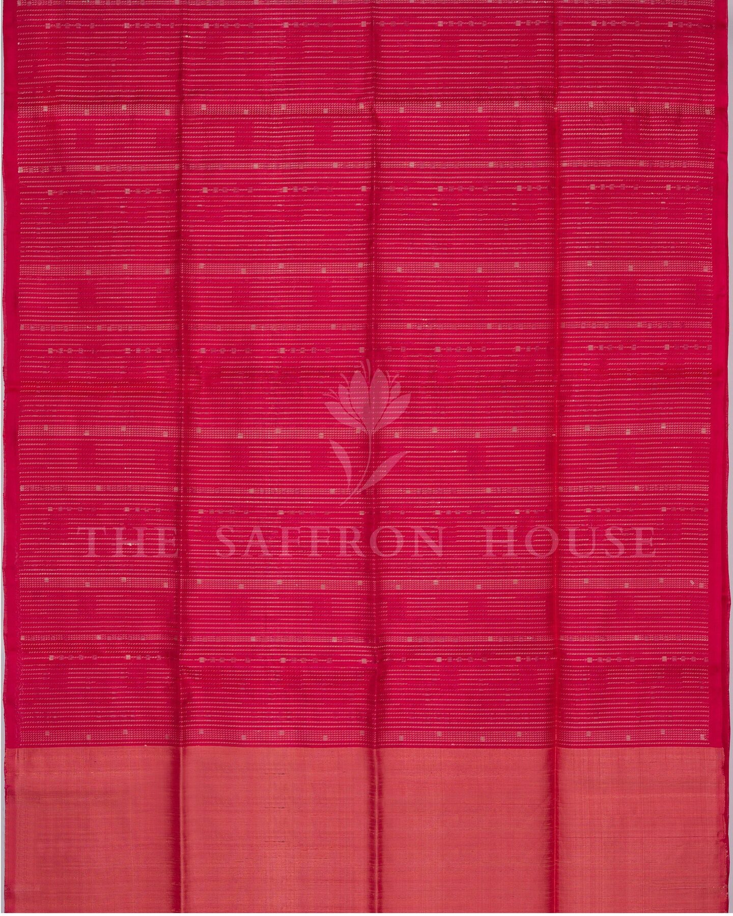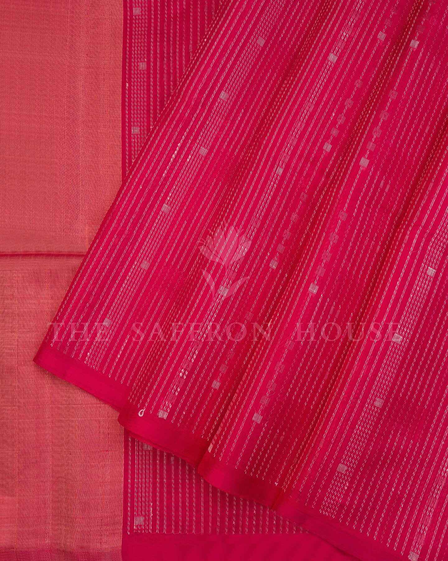 There is something about the interplay of rani pink and peach that feels both ancient and alive. This Handwoven Kanjivaram silk saree opens with regal as a queen's court in bloom, its surface shimmering with the unhurried rhythm of the loom.