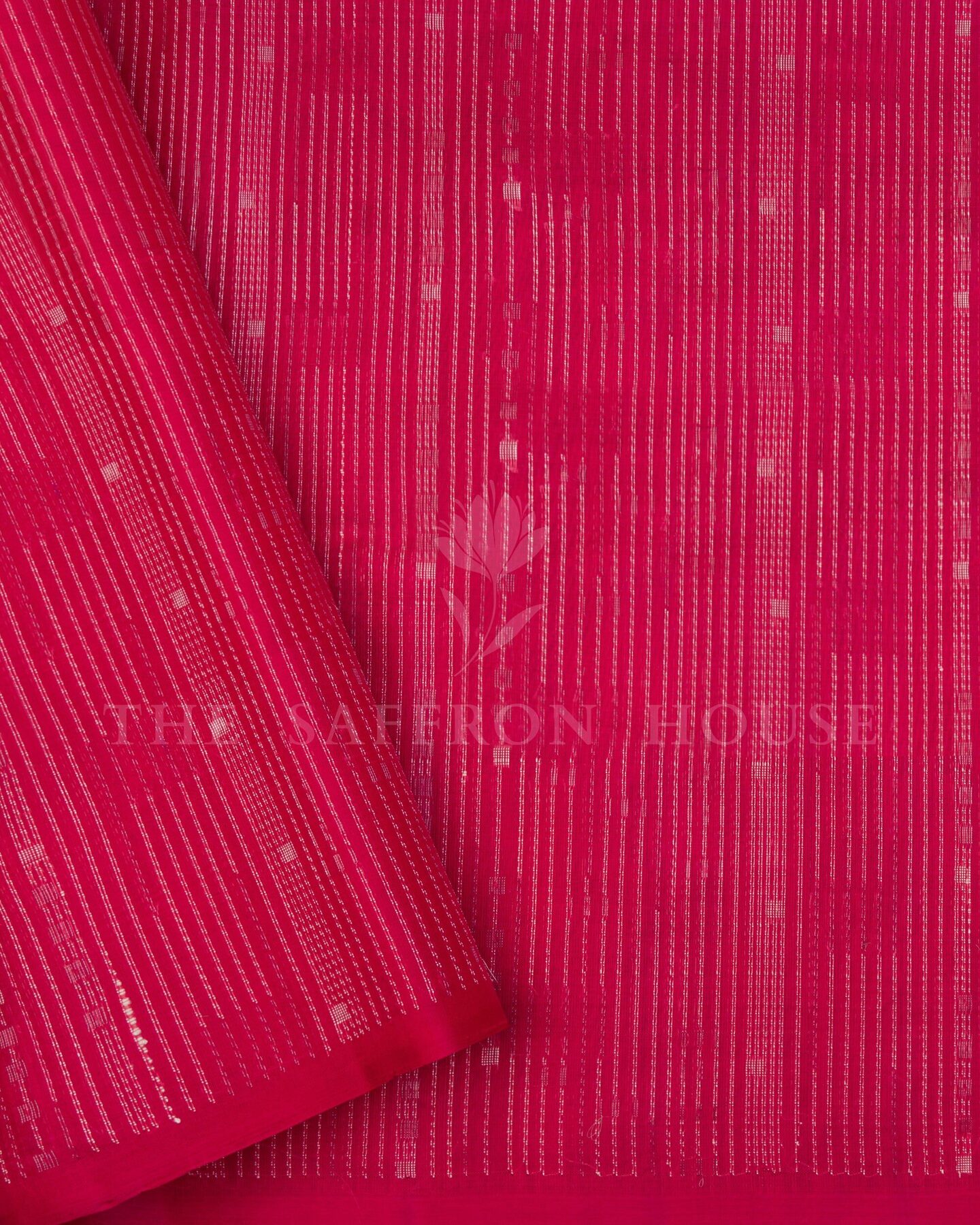 The body is woven with intricate traditional motifs, each thread placed with precision and purpose. A richly woven border frames the drape with confident definition, while silver zari runs through the weave, catching light the way temple gold does — slowly, deeply, unforgettably.