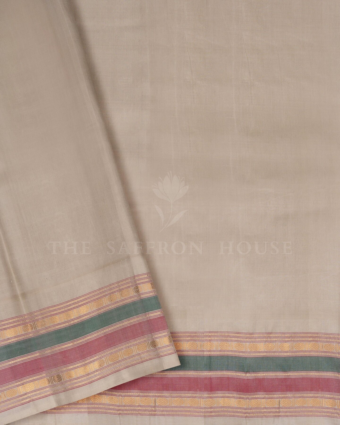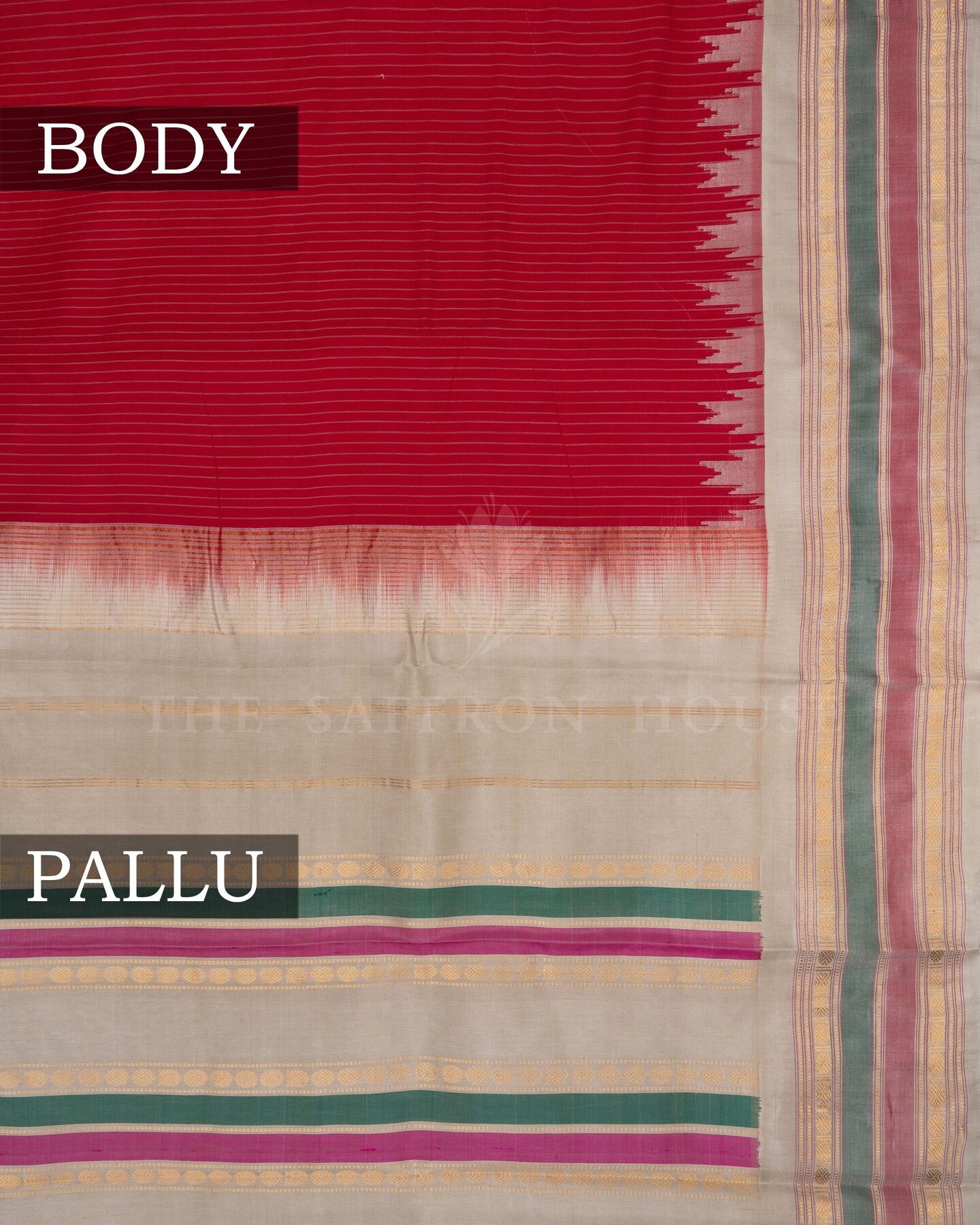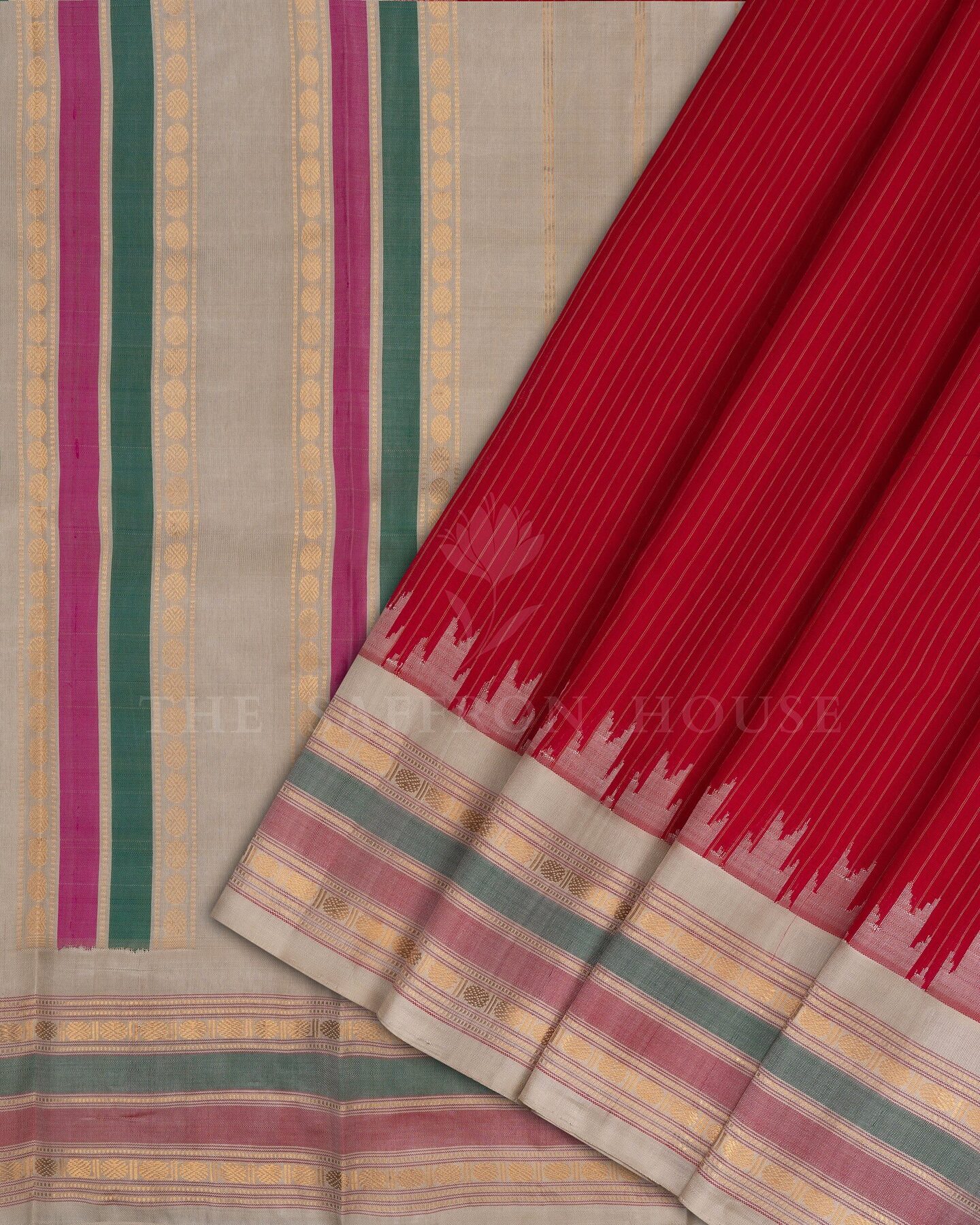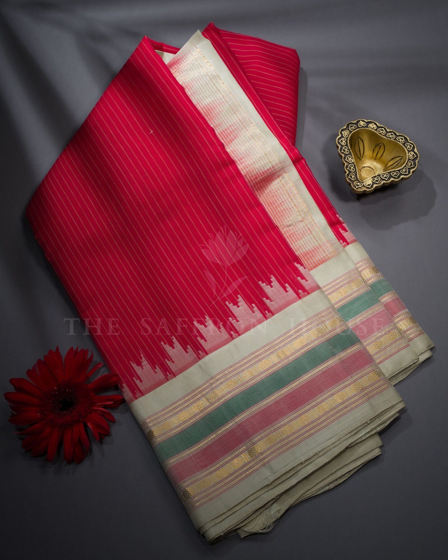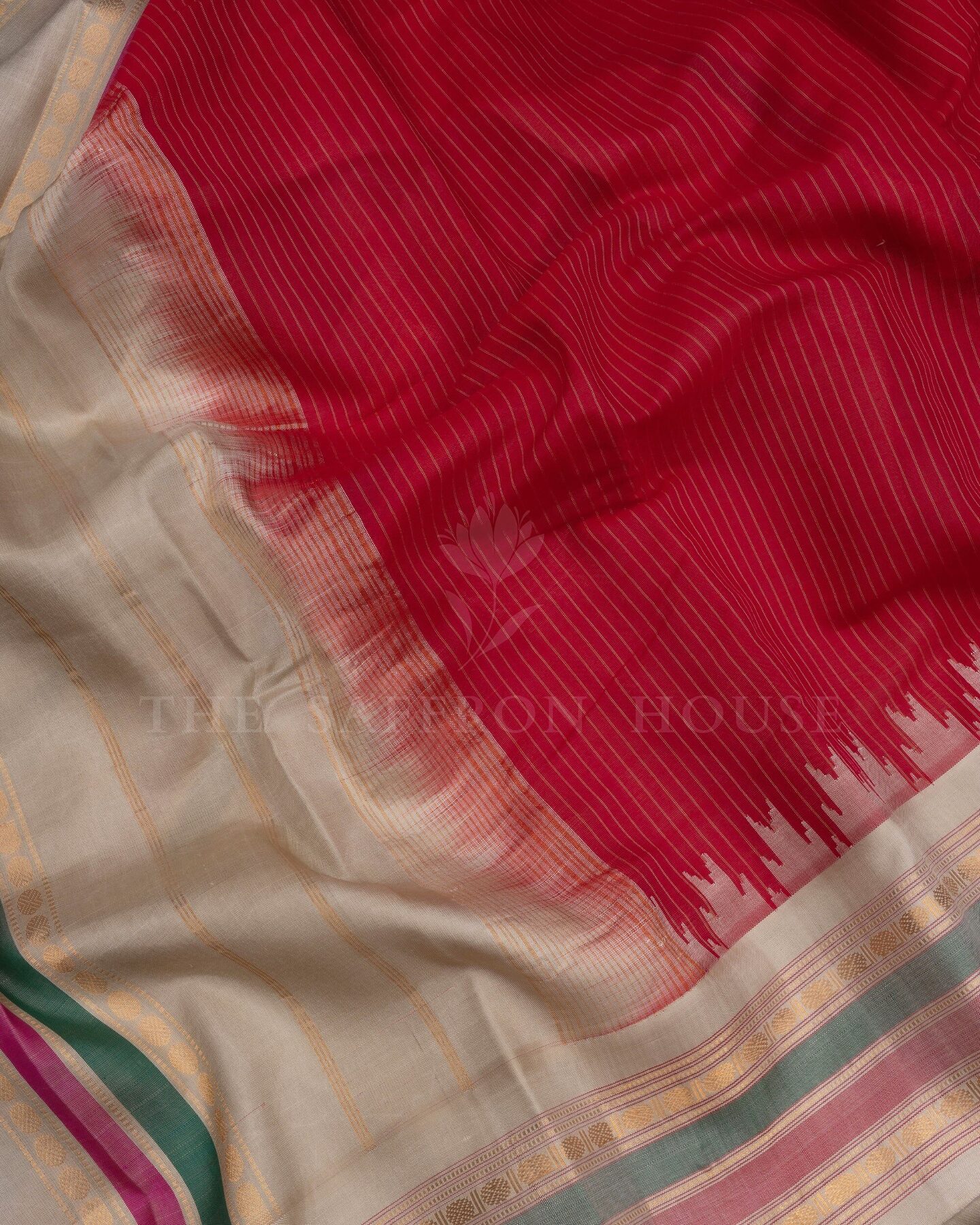The body is adorned with vertical stripes weaving, each thread placed with precision and purpose. The ivory gold border frames the drape with confident definition, while gold zari runs through the weave, catching light the way temple gold does — slowly, deeply, unforgettably.