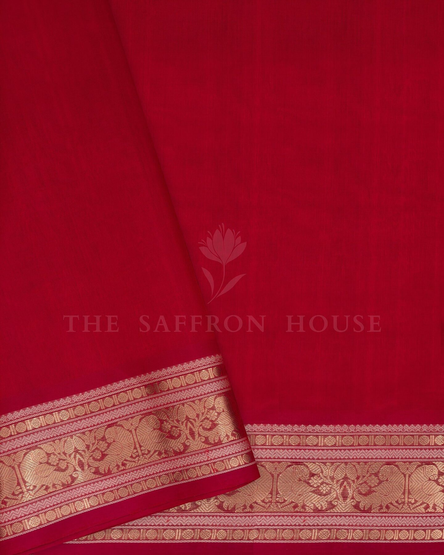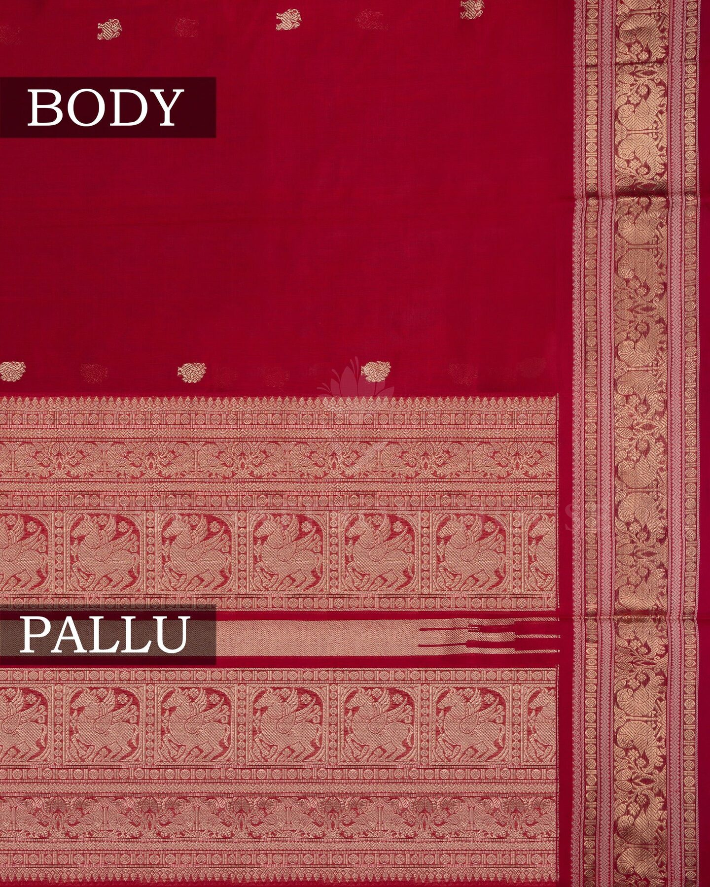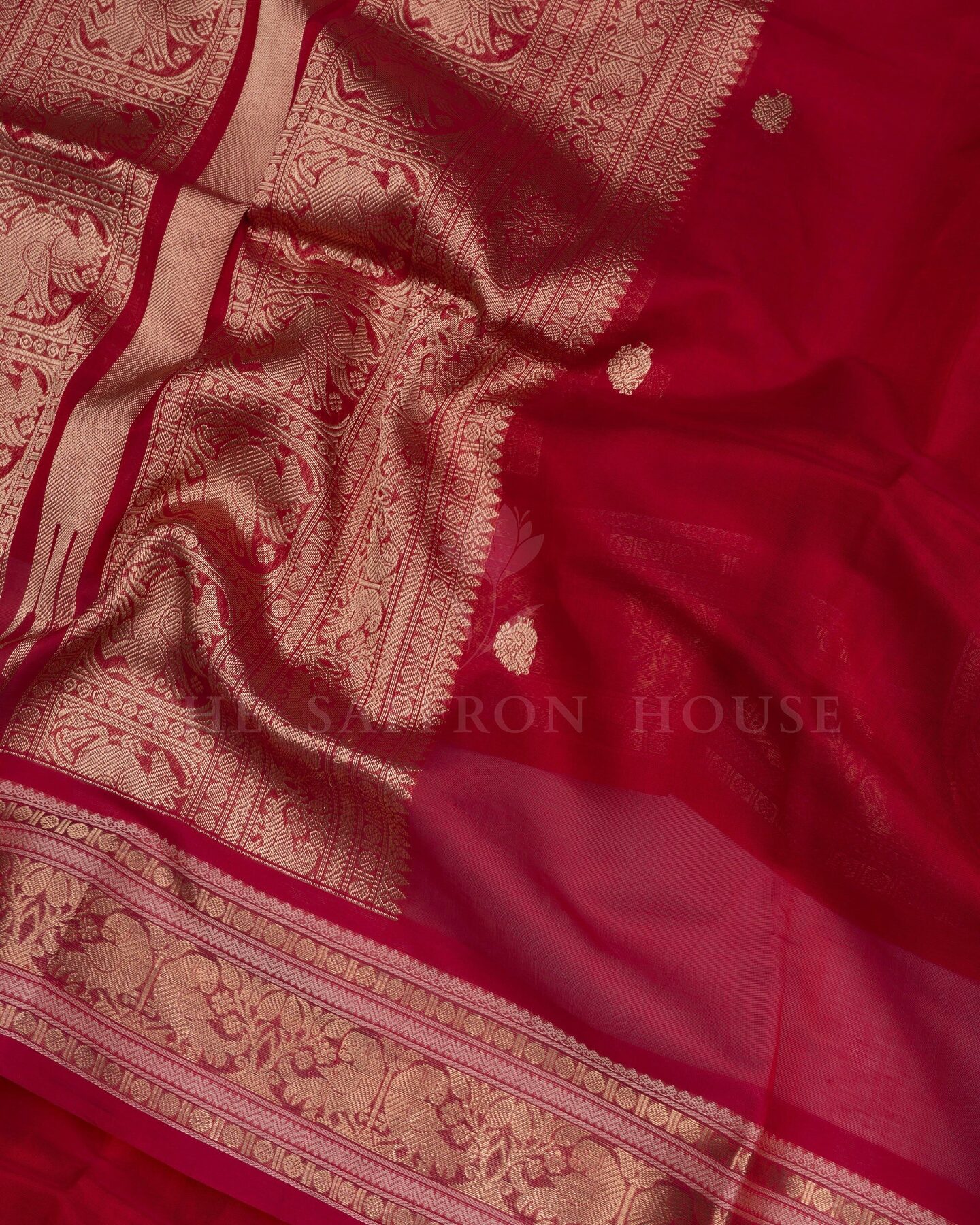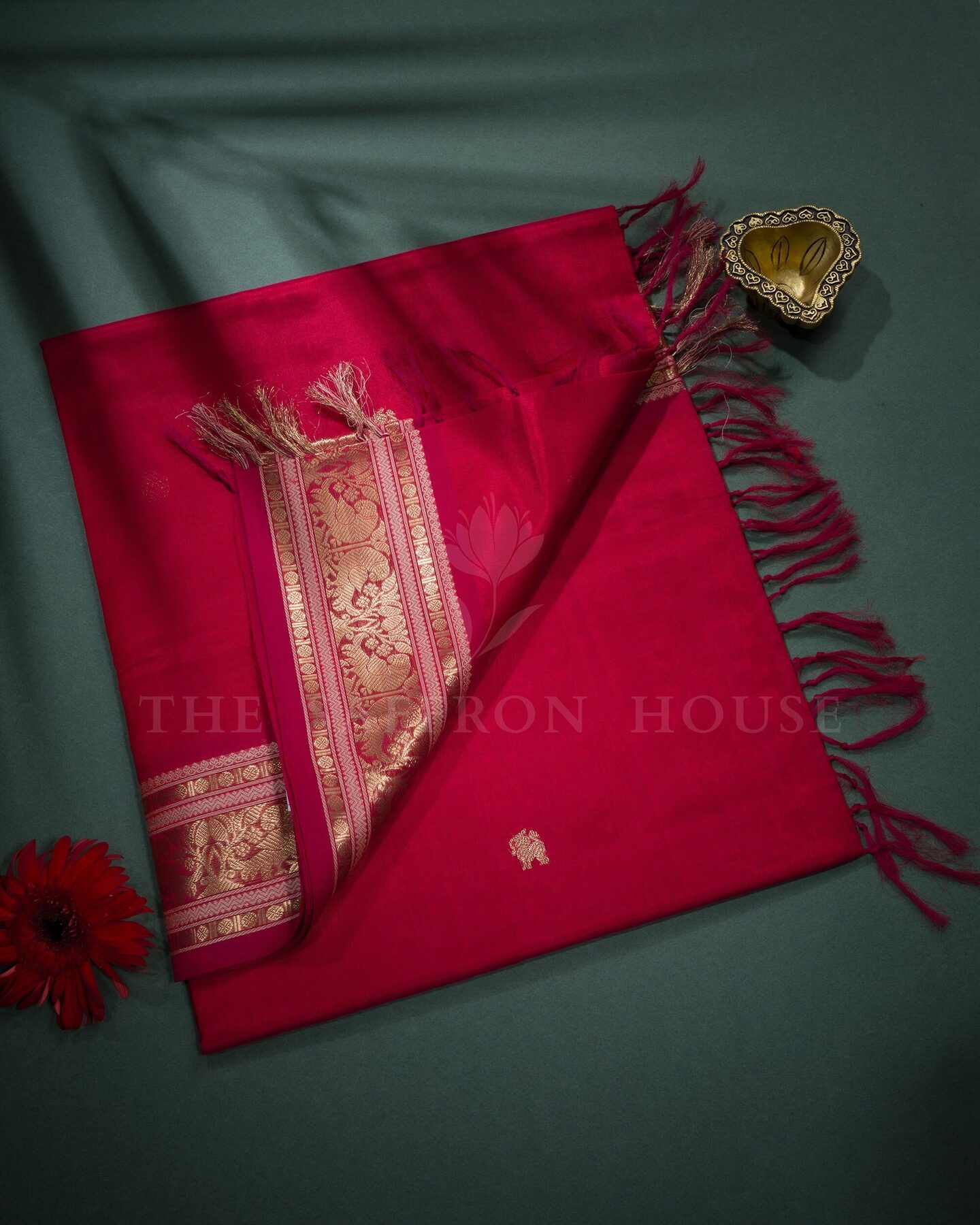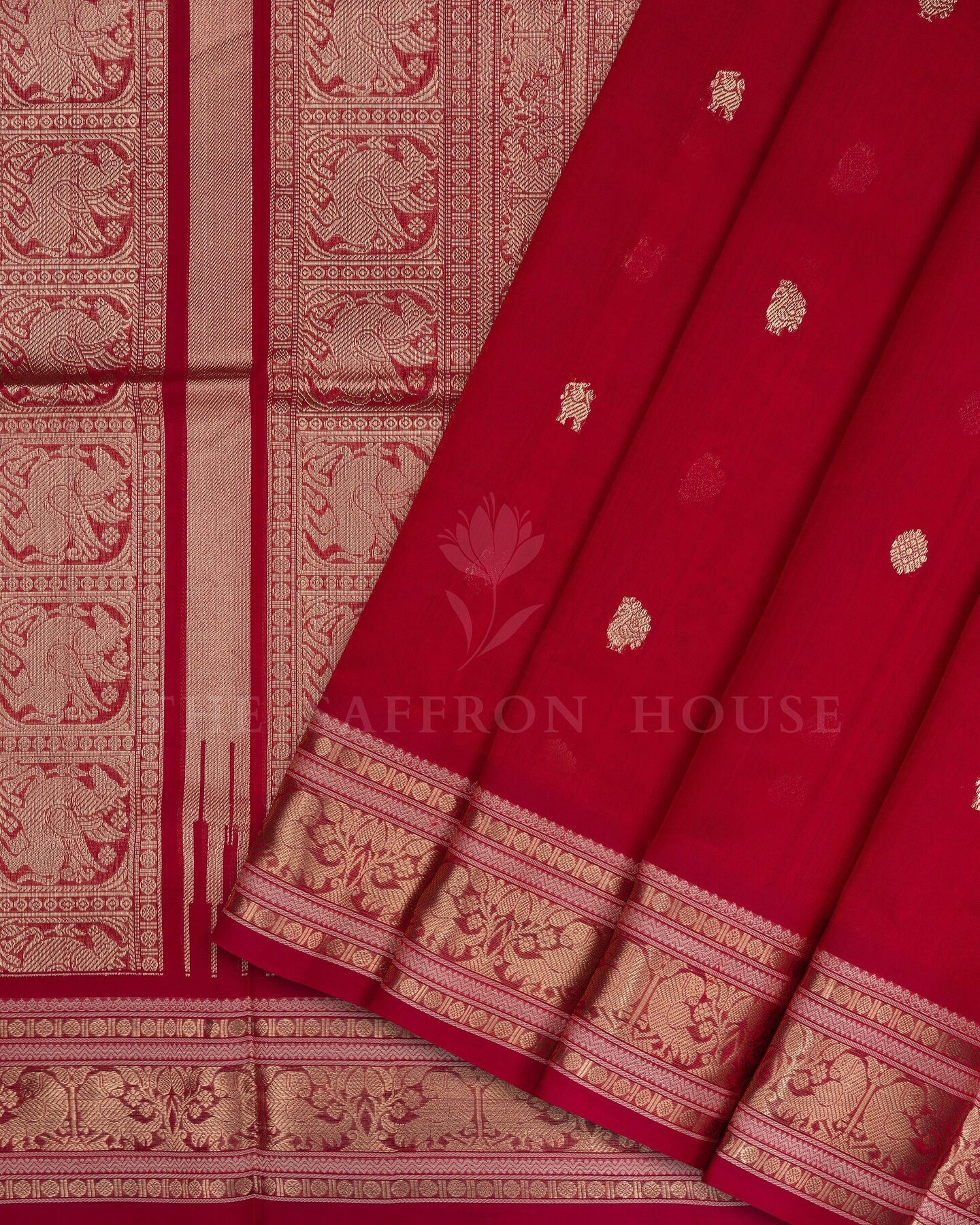 The body is adorned with yali & chakra motifs, each thread placed with precision and purpose. The red border frames the drape with confident definition, while gold zari runs through the weave, catching light the way temple gold does — slowly, deeply, unforgettably.